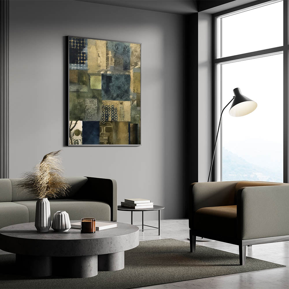 Add a unique, rustic touch to your home with this abstract wall art featuring a captivating blend of textures and patterns. The earthy palette of greens, beiges, and deep blues brings a soothing yet sophisticated feel, perfect for those who want to infuse farmhouse decor with an artistic twist.