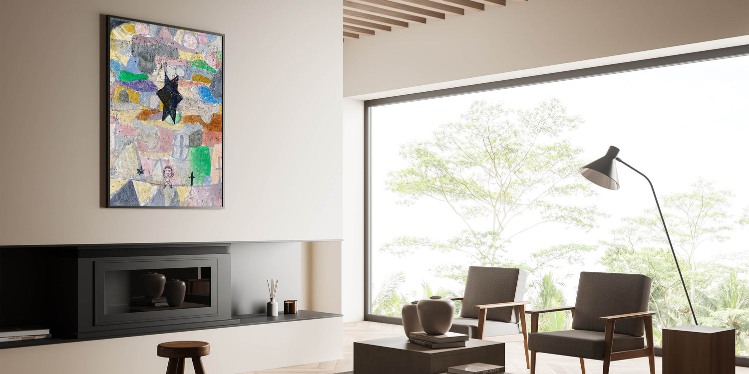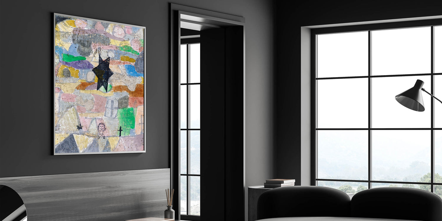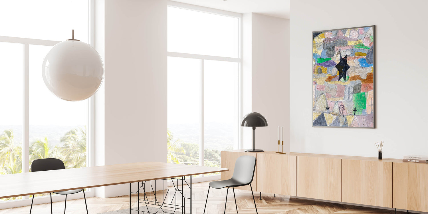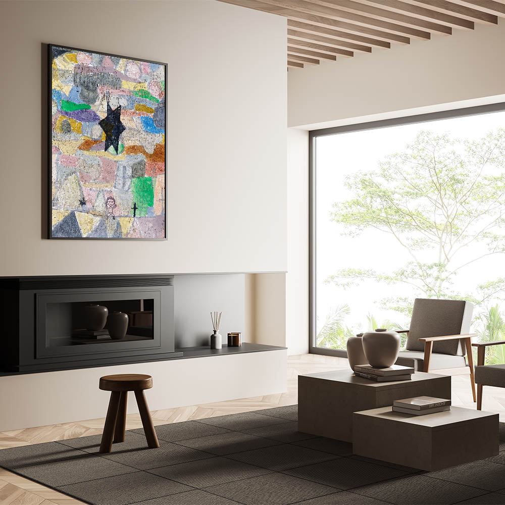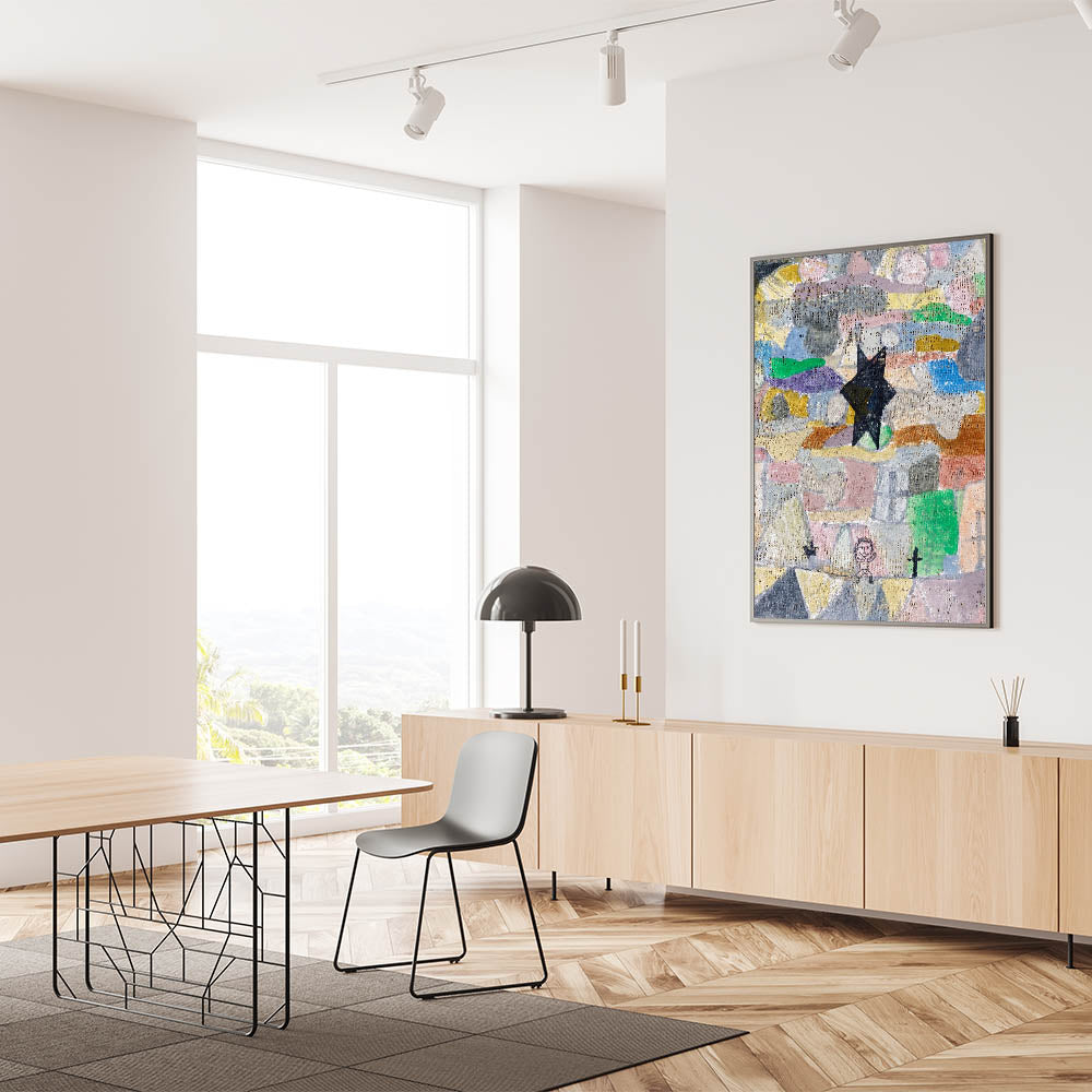 Add a touch of whimsy and depth to your space with this abstract star wall art, featuring intricate textures and a playful mix of colors. The bold black star set against a mosaic of pastel tones creates a unique, dreamlike atmosphere, perfect for modern interiors that embrace creativity and expressionism.