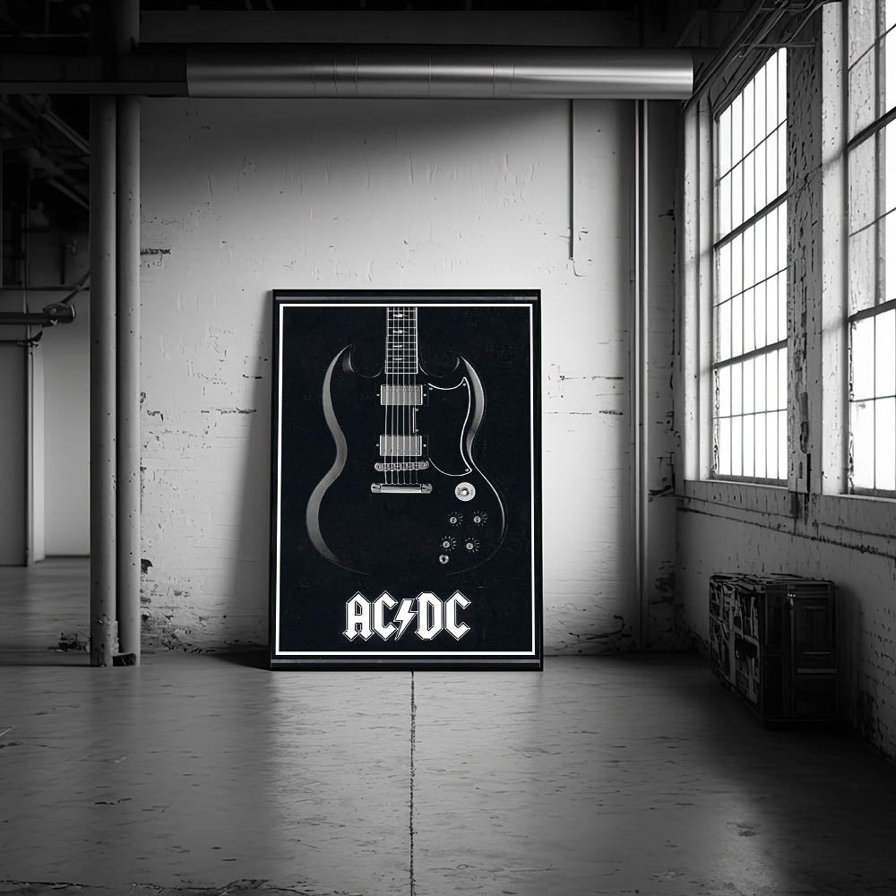 Show your love for rock ‘n’ roll with this stunning AC/DC black SG guitar poster. Featuring a sleek black and white image of the iconic guitar, this vintage print is perfect for any music enthusiast or AC/DC fan. The minimalistic yet powerful design captures the essence of rock, with the signature AC/DC logo placed boldly at the bottom. This poster is a must-have addition to any retro decor or music room, bringing timeless rock aesthetics into your home.