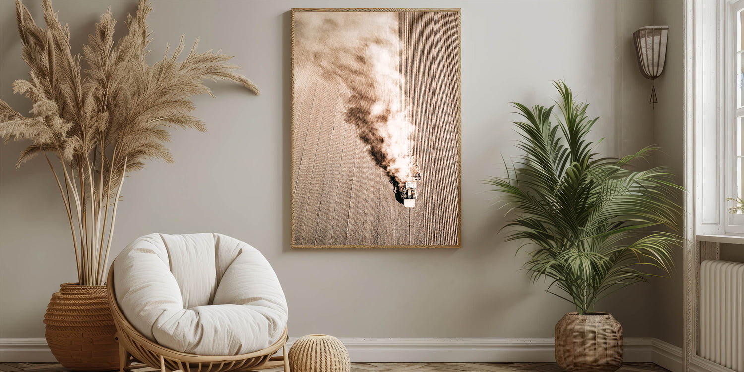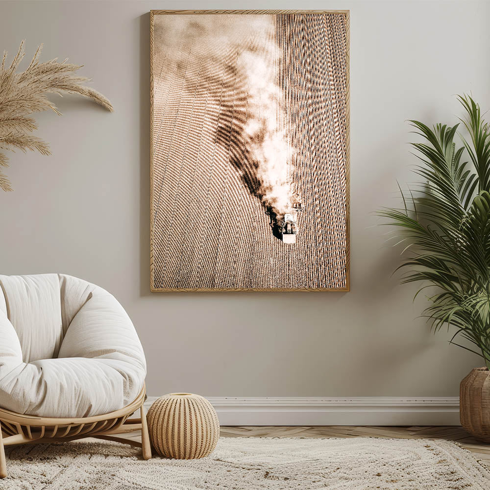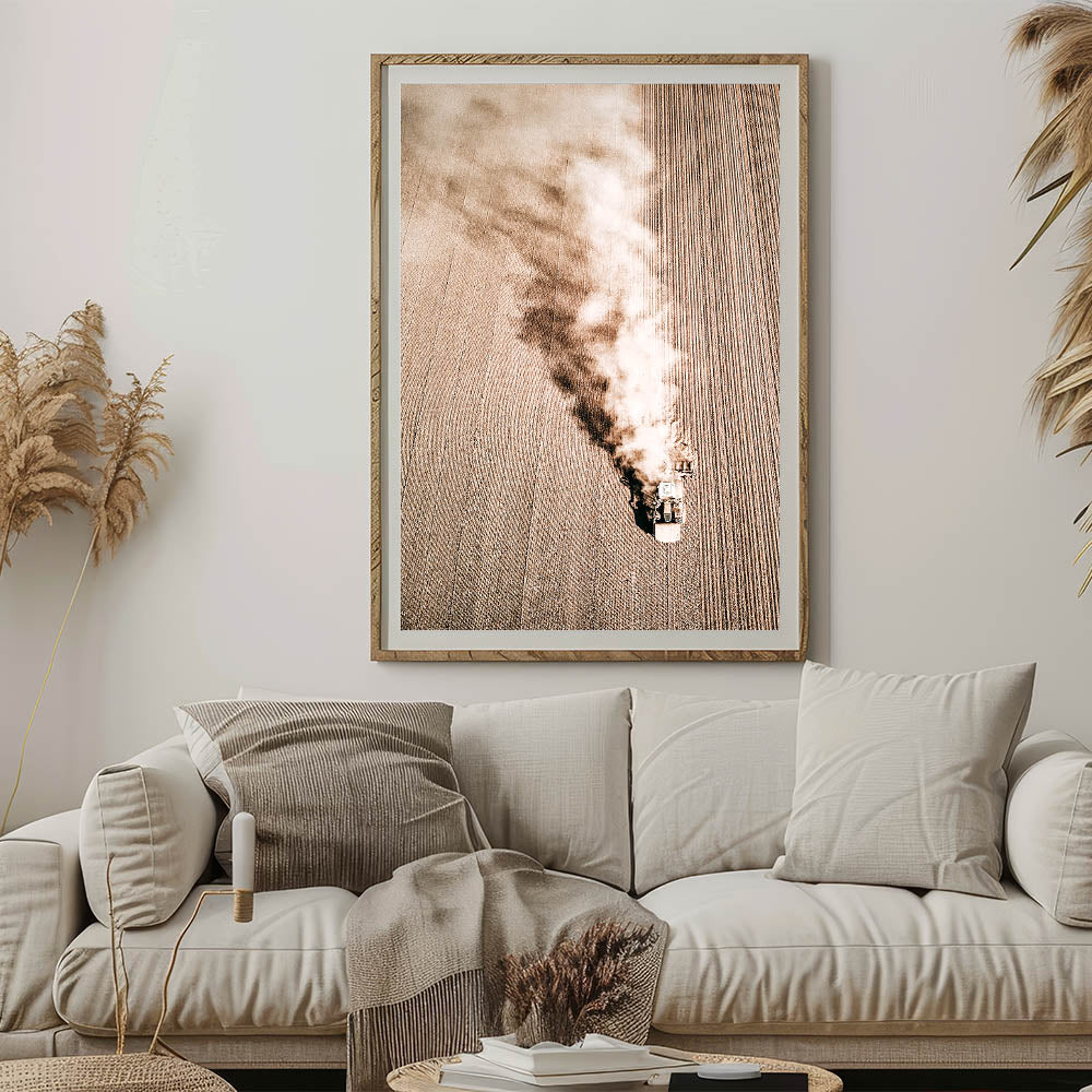 Capture the beauty of rural life with this stunning Aerial Farmhouse Wall Art. The image, taken from above, features a tractor plowing through a vast field, showcasing the hard work and simplicity of country living style. This dynamic piece adds a sense of movement and rustic charm to any room, bringing the antique farmhouse aesthetic to your walls. Its muted, earthy tones and intricate details make it an ideal addition for lovers of vintage farmhouse prints and farmhouse style wall decor.