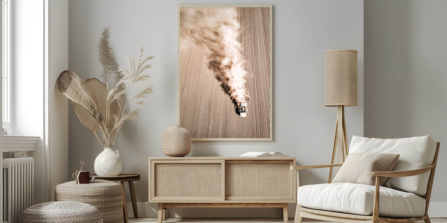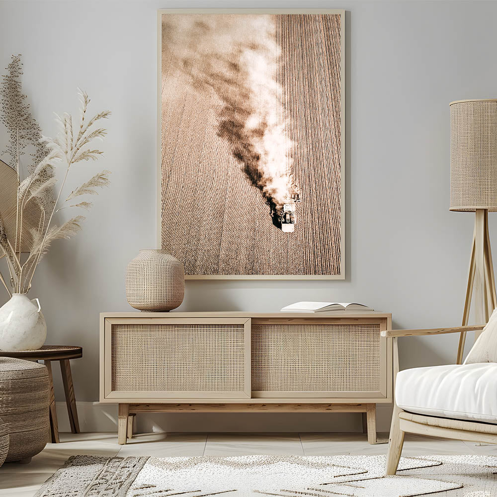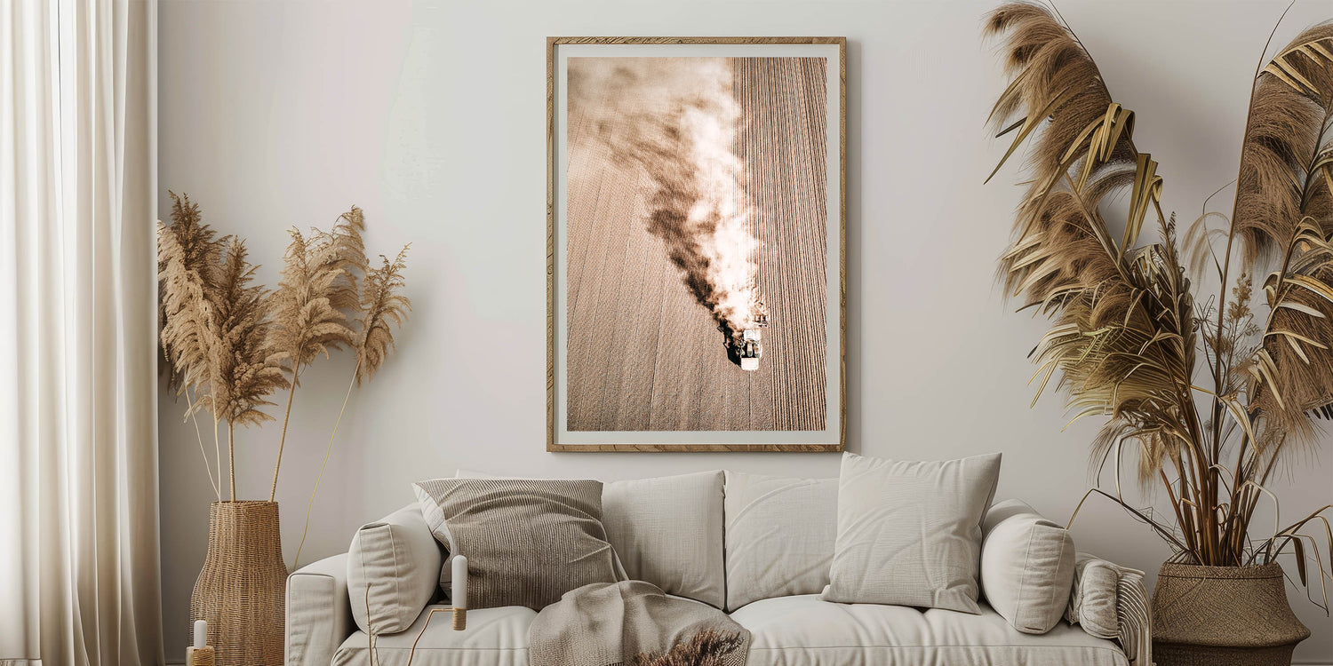 Capture the beauty of rural life with this stunning Aerial Farmhouse Wall Art. The image, taken from above, features a tractor plowing through a vast field, showcasing the hard work and simplicity of country living style. This dynamic piece adds a sense of movement and rustic charm to any room, bringing the antique farmhouse aesthetic to your walls. Its muted, earthy tones and intricate details make it an ideal addition for lovers of vintage farmhouse prints and farmhouse style wall decor.
