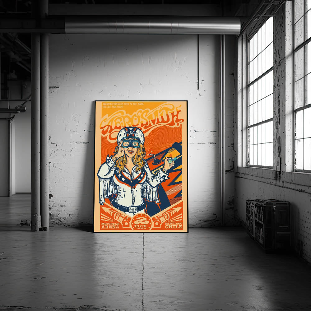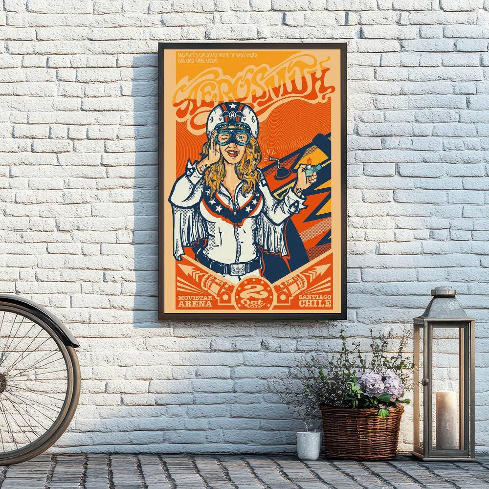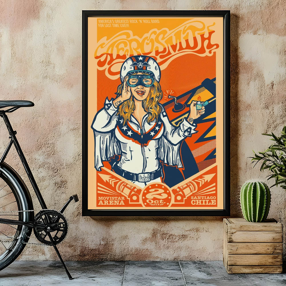 Infuse your space with rock nostalgia using this Aerosmith Retro Poster, inspired by the 2016 Santiago, Chile concert. The bold mix of oranges, blues, and creams combined with a vintage comic-style design captures the energy and flair of the band’s iconic performances. Perfect for music enthusiasts and lovers of Vintage Decor, this print brings a touch of Retro Aesthetic to any room, making it an ideal choice for music rooms, living spaces, or home offices.