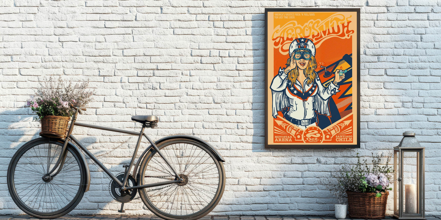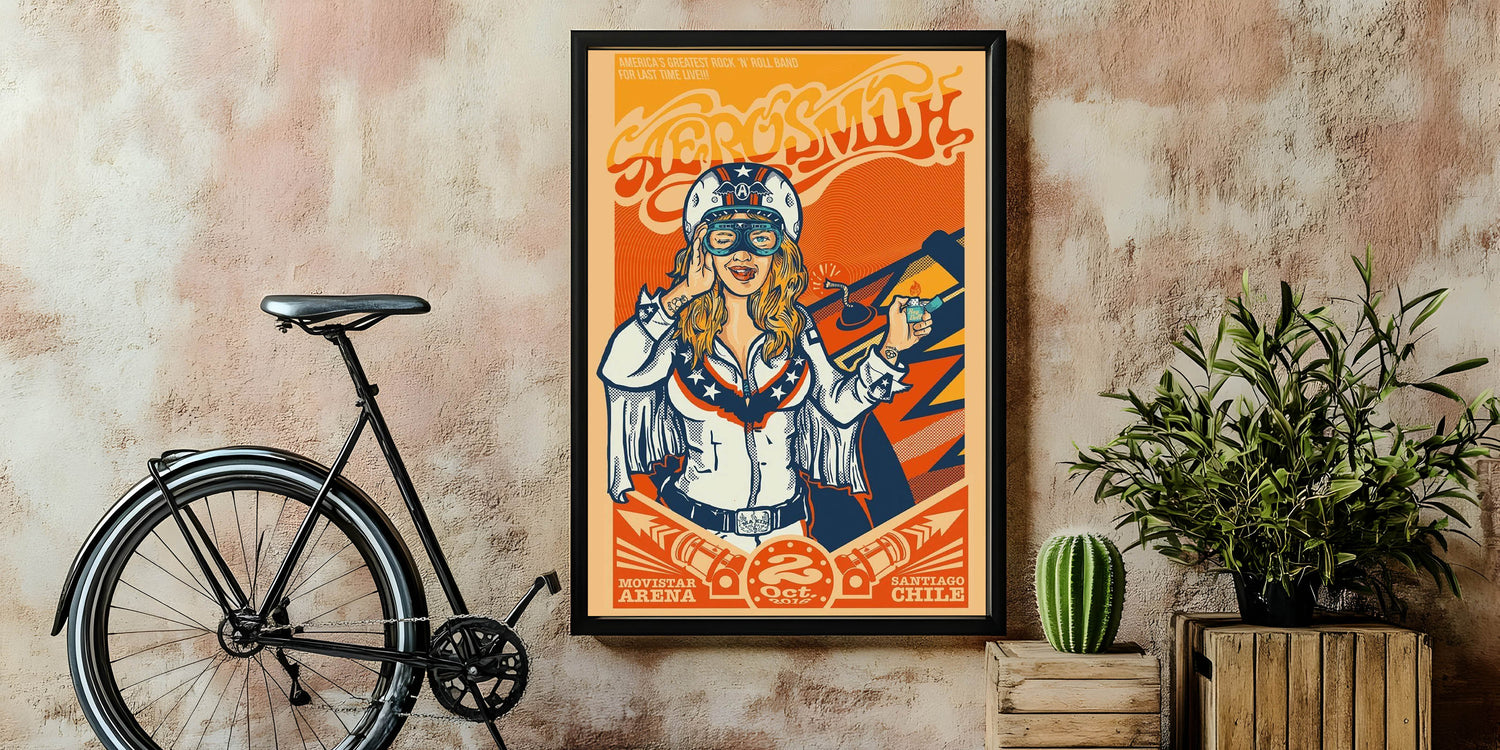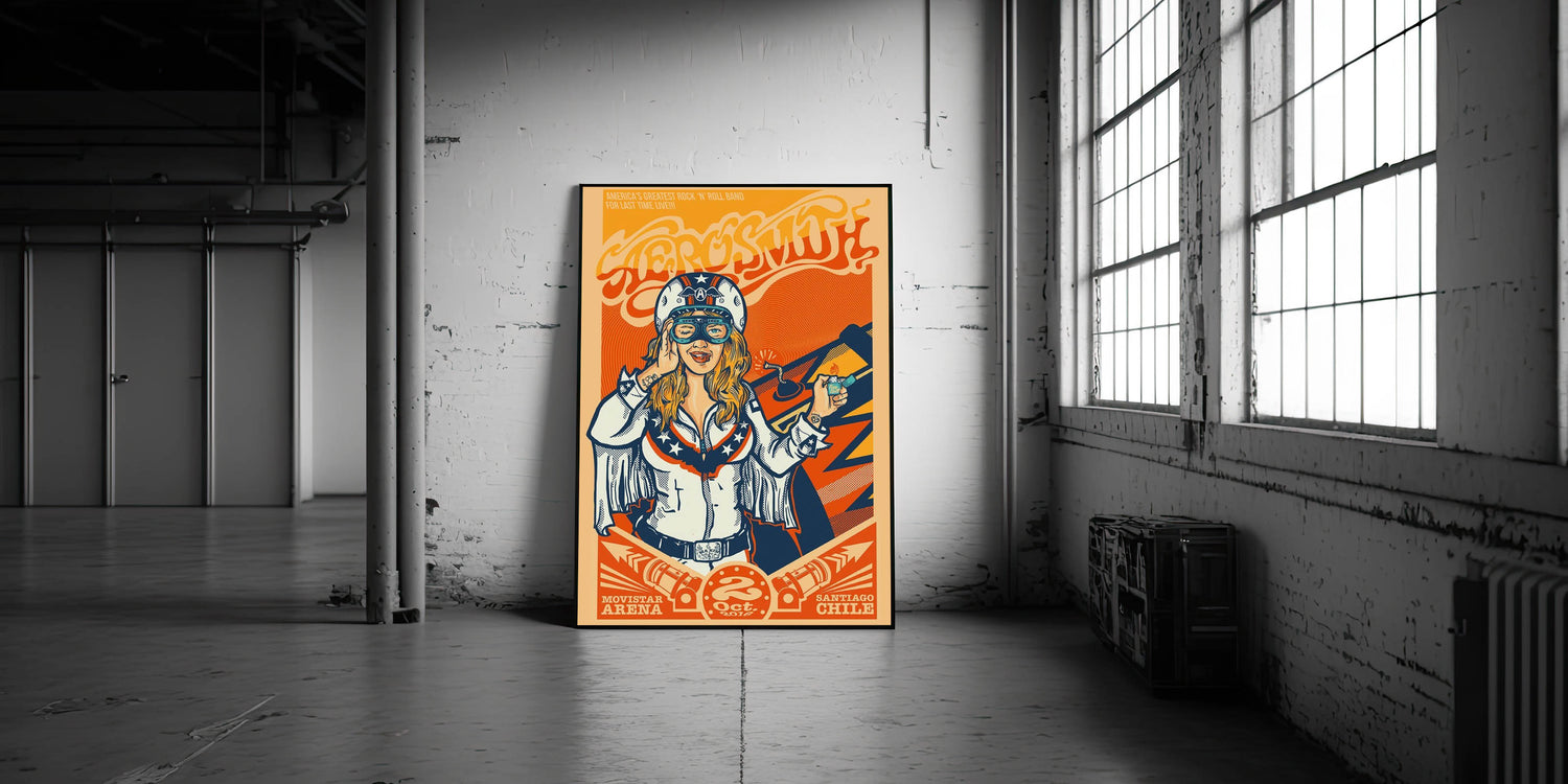 Infuse your space with rock nostalgia using this Aerosmith Retro Poster, inspired by the 2016 Santiago, Chile concert. The bold mix of oranges, blues, and creams combined with a vintage comic-style design captures the energy and flair of the band’s iconic performances. Perfect for music enthusiasts and lovers of Vintage Decor, this print brings a touch of Retro Aesthetic to any room, making it an ideal choice for music rooms, living spaces, or home offices.
