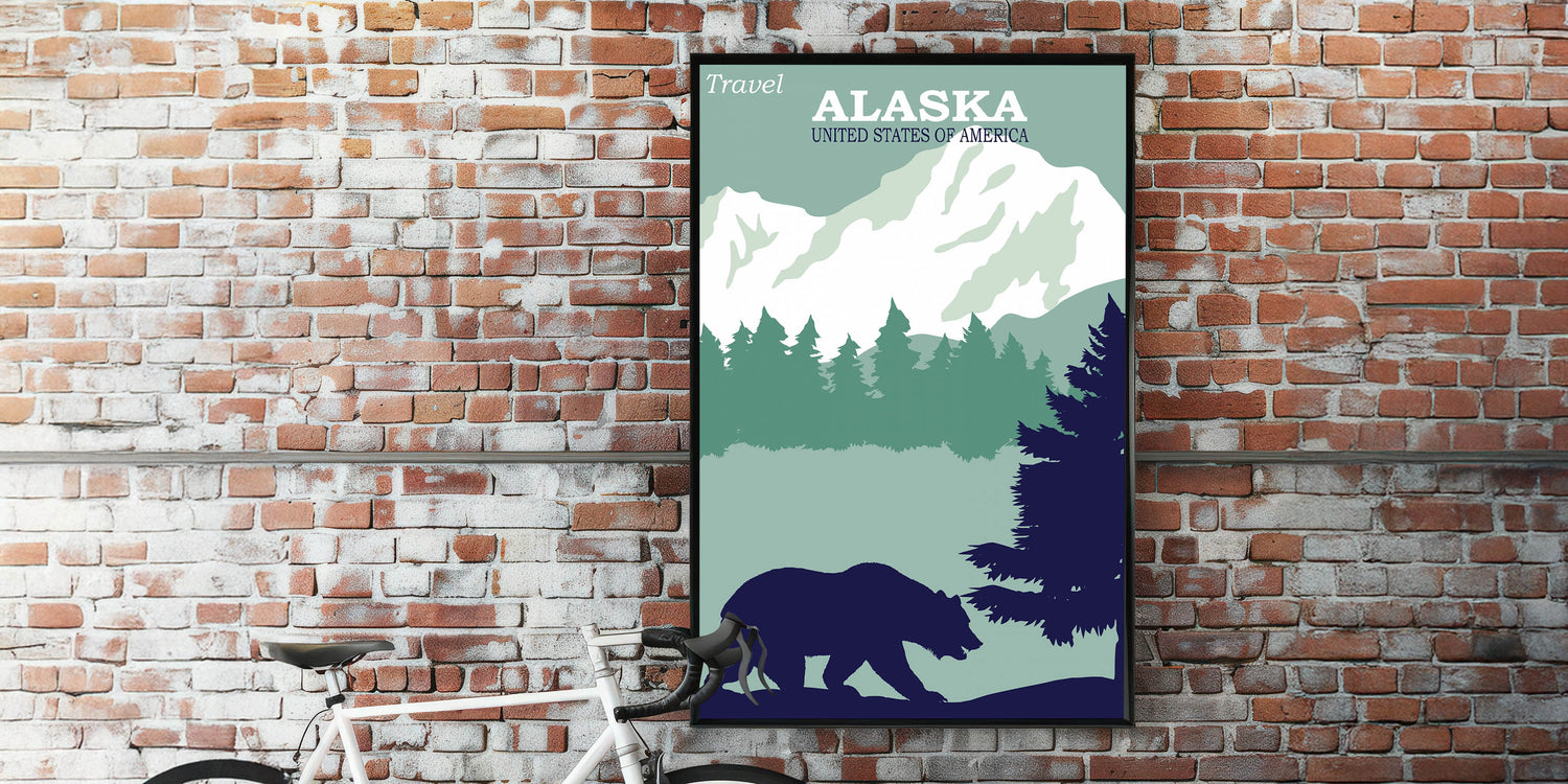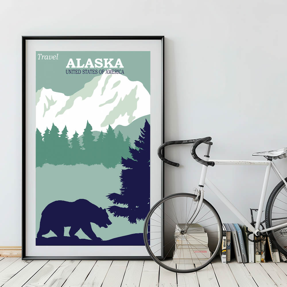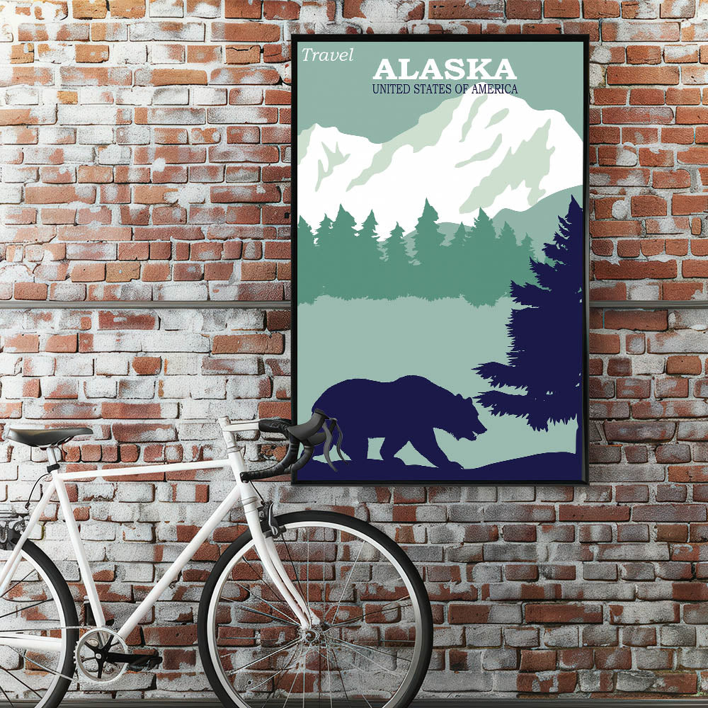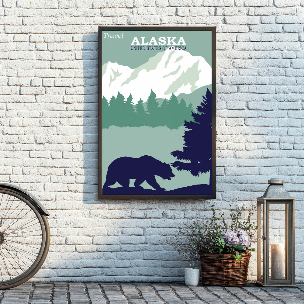 Explore the rugged beauty of Alaska with this vintage-inspired retro travel poster. Featuring a serene mountain landscape with towering trees and a majestic bear, this piece captures the essence of the Alaskan wilderness. The simple, yet bold design in cool shades of green and navy blue brings a sense of adventure and tranquility, making it a perfect addition to any retro or nature-themed space.