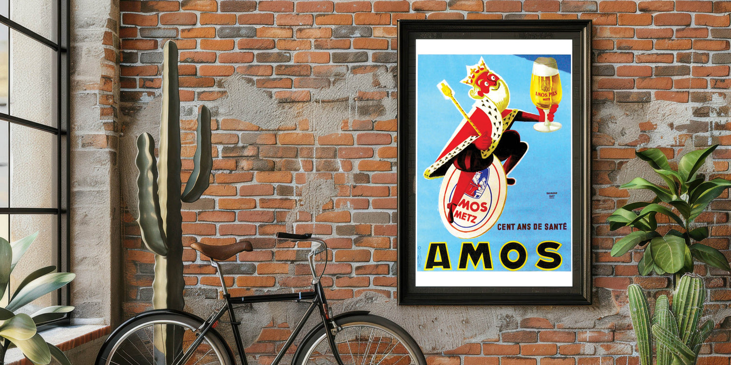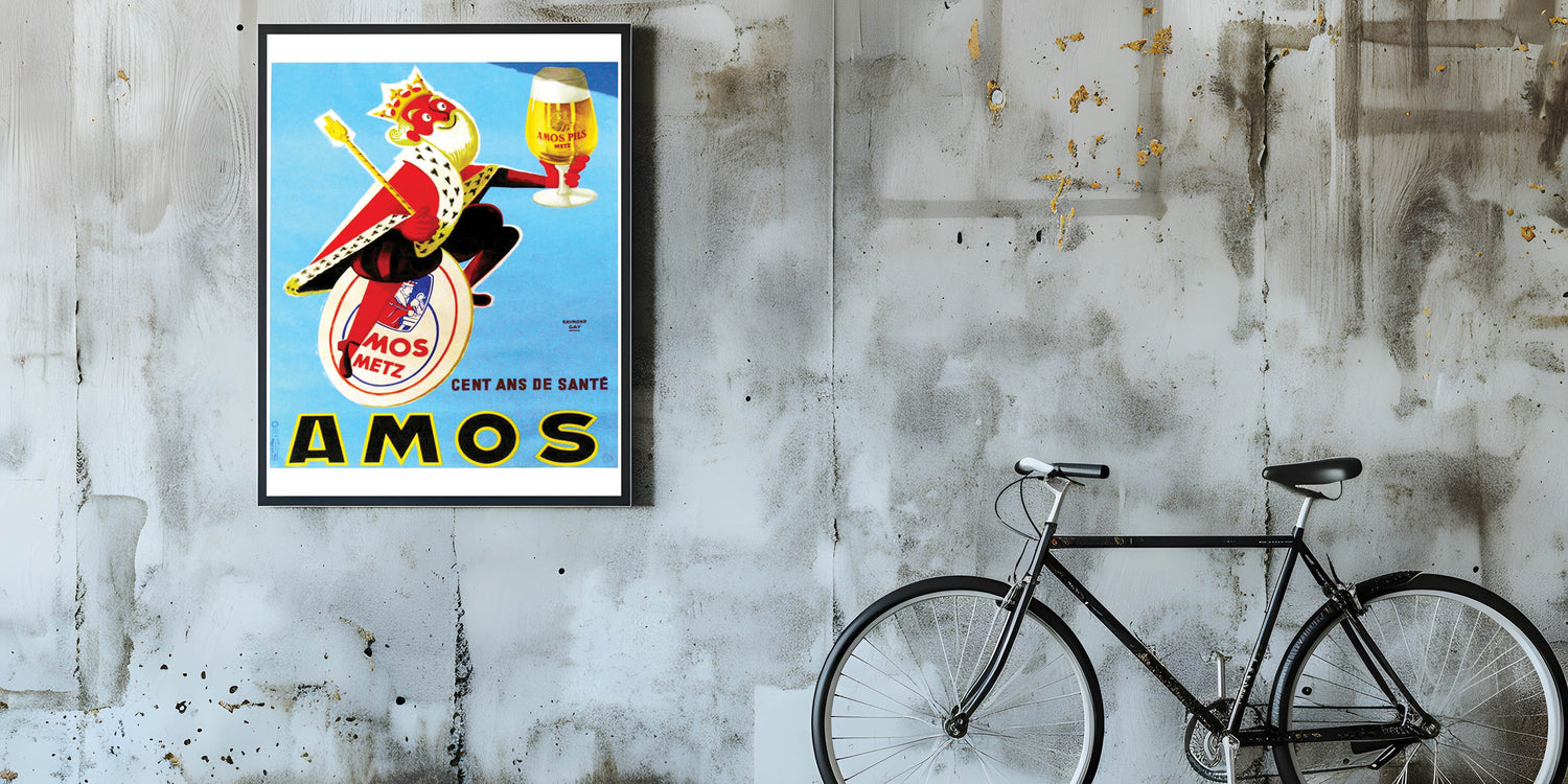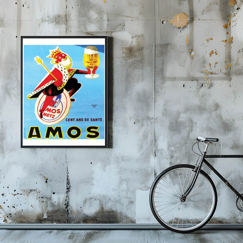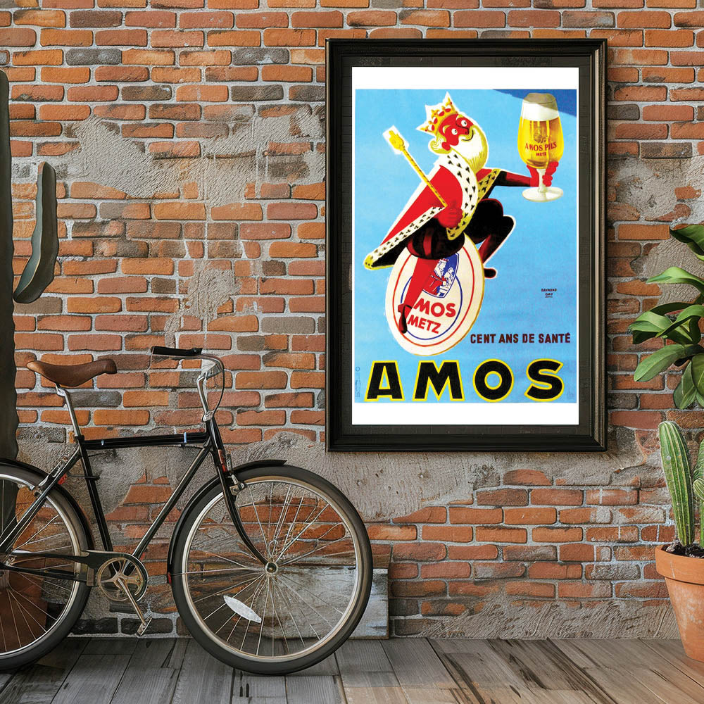 Add some fun and flair to your space with this vintage AMOS Pils advertising poster. Featuring a playful king character holding a glass of beer, this bright and colorful print captures the joy and celebration associated with the beloved AMOS beer brand. Designed by Raymond Gay, this piece showcases a lighthearted moment from the mid-20th century, offering both nostalgia and a sense of cheer.