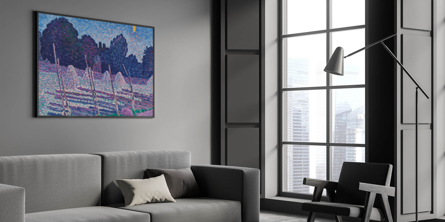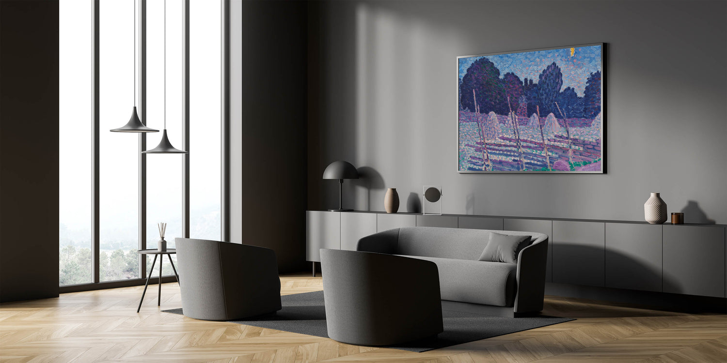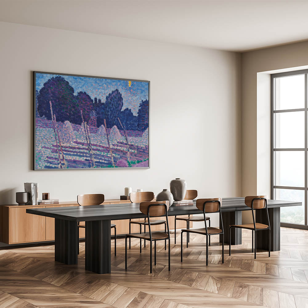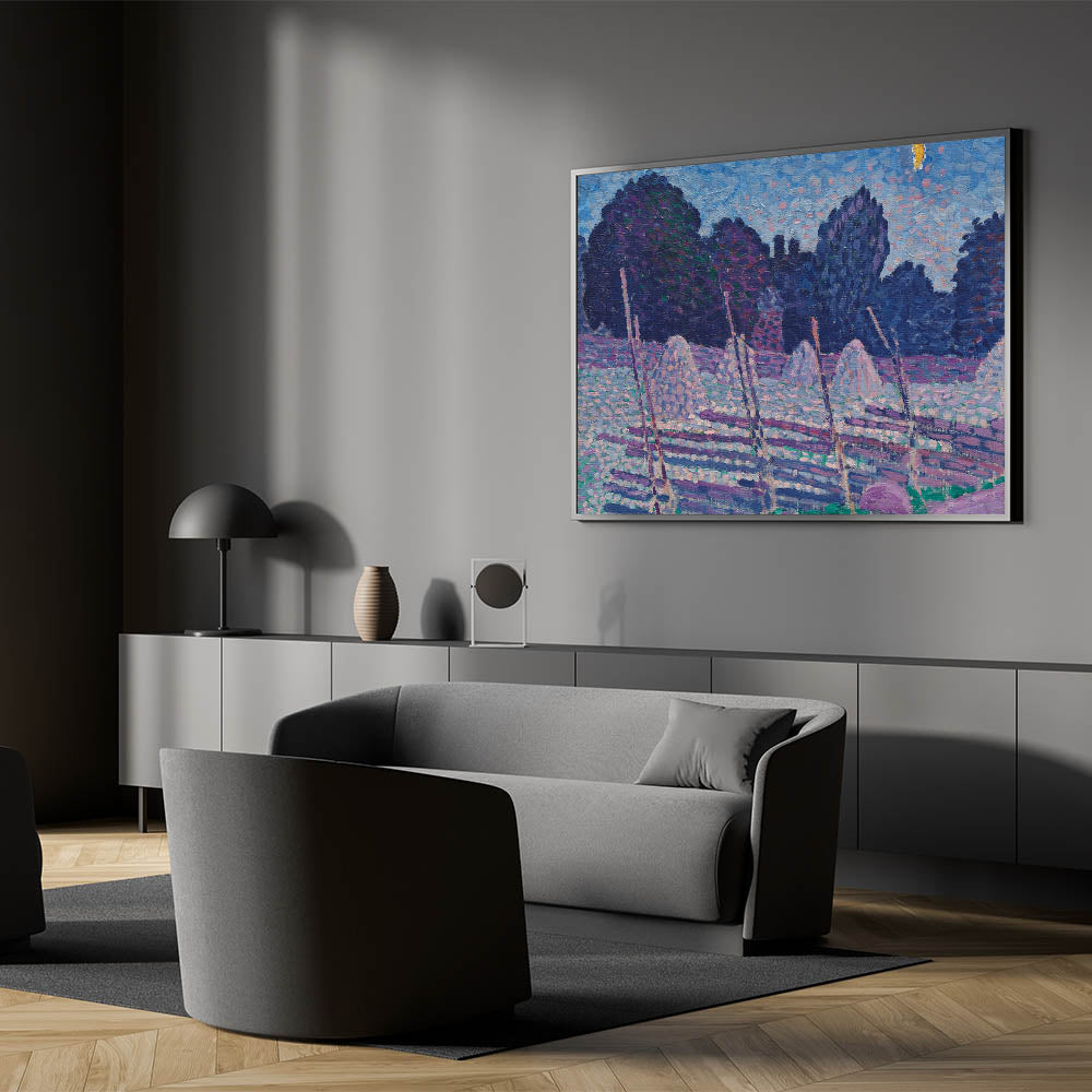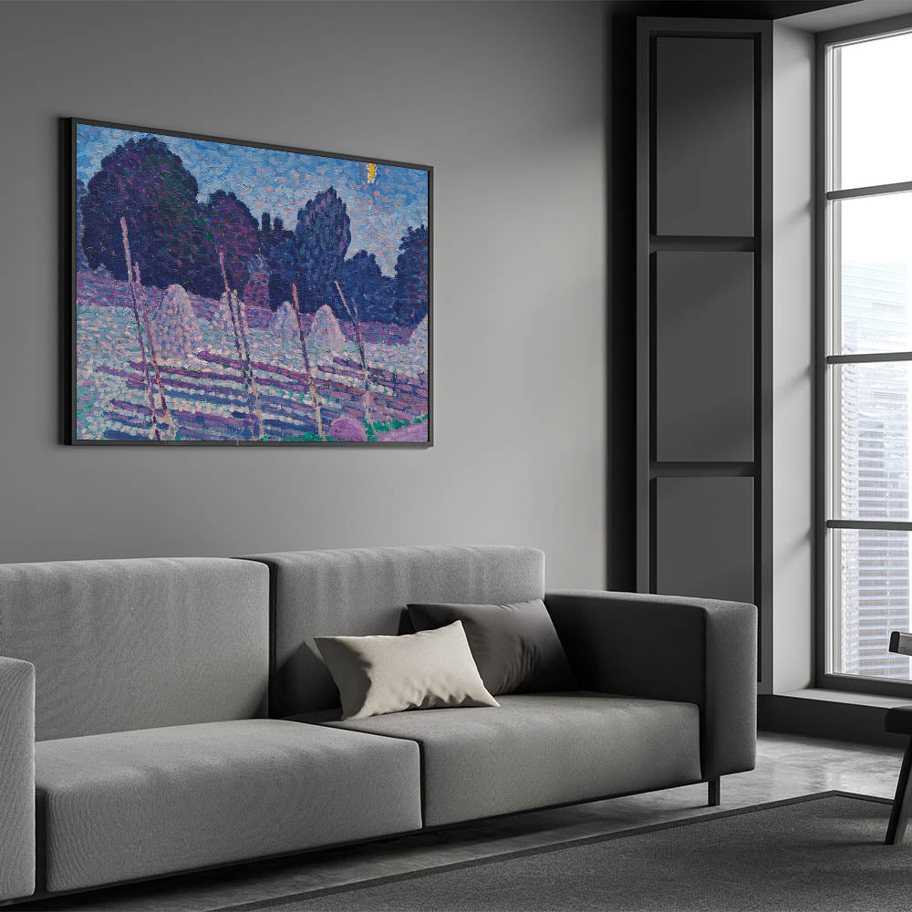 Step into the enchanting glow of "An August Night" by Alfred William Finch, a captivating Pointillist landscape that beautifully captures the magic of a moonlit summer evening. With bold, textured brushstrokes and a rich palette of purples and blues, Finch’s piece brings out the stillness of the night and the soft shimmer of the moon. Ideal for those who appreciate atmospheric art, this painting adds a touch of serenity and mystery to any room.