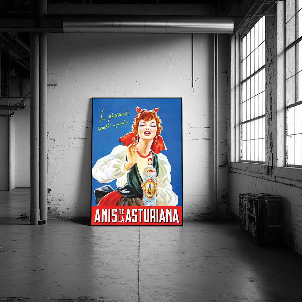 Add a touch of vintage Spanish flair to your space with the Anís de la Asturiana advertising poster. Featuring a lively woman holding a bottle of this traditional anise liquor, this piece exudes charm and elegance. The bright colors and retro design make it a perfect fit for those who appreciate the art of vintage advertising and classic Spanish beverages.