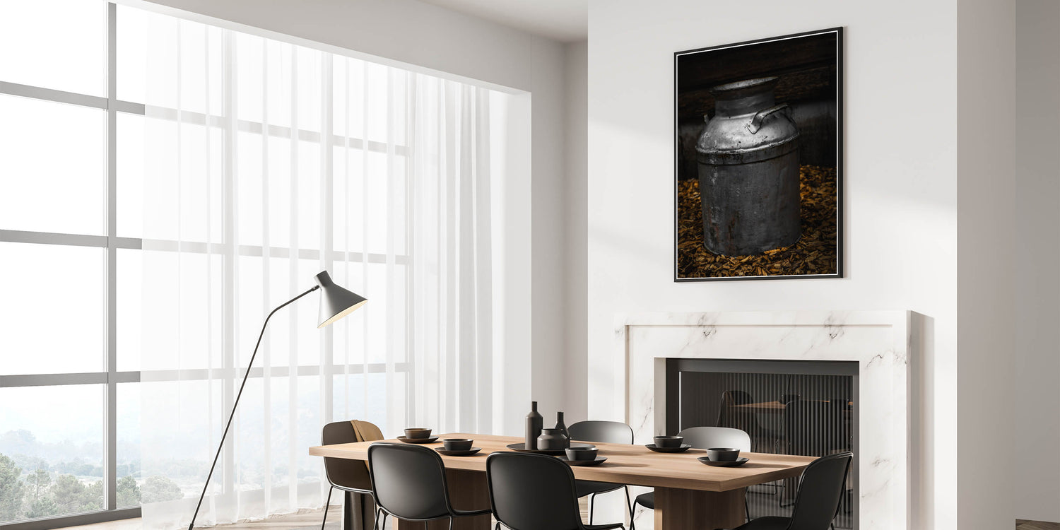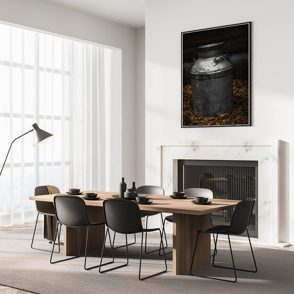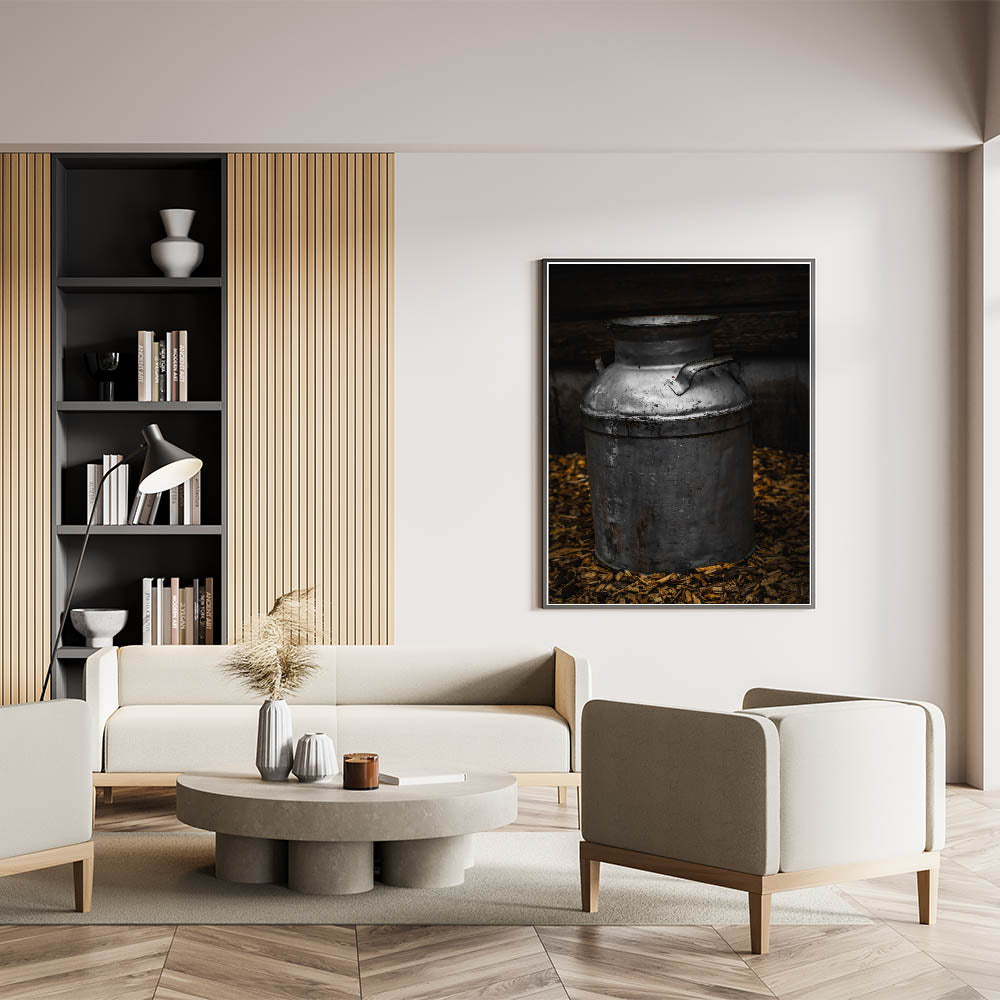 Explore the charm of yesteryear with our "Antique Metal Milk Jug" wall art, a striking depiction of a vintage milk jug that embodies the spirit of rustic farmhouse decor. This piece showcases the patina and character of a well-used metal jug, set against a dark, textured backdrop, offering a glimpse into the past where such items were everyday staples.