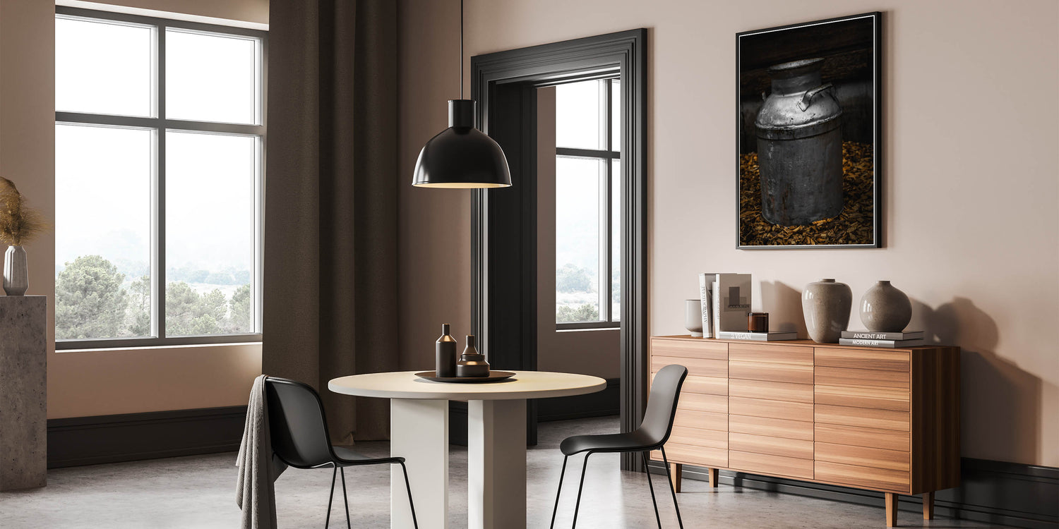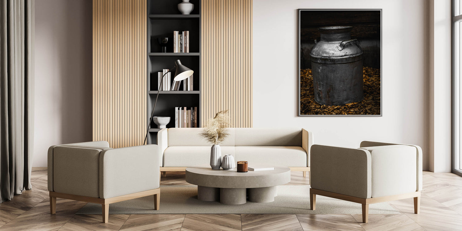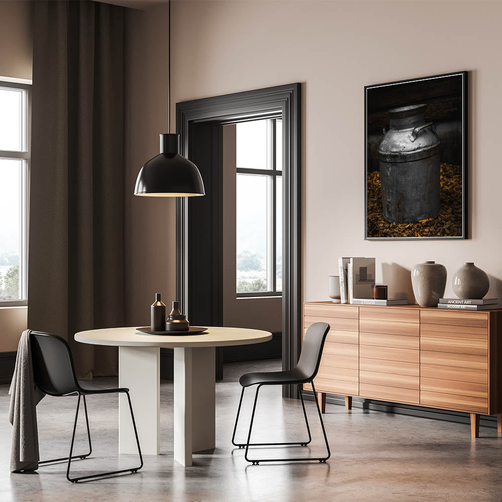 Explore the charm of yesteryear with our "Antique Metal Milk Jug" wall art, a striking depiction of a vintage milk jug that embodies the spirit of rustic farmhouse decor. This piece showcases the patina and character of a well-used metal jug, set against a dark, textured backdrop, offering a glimpse into the past where such items were everyday staples.