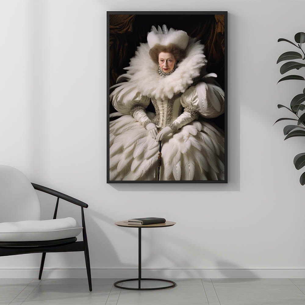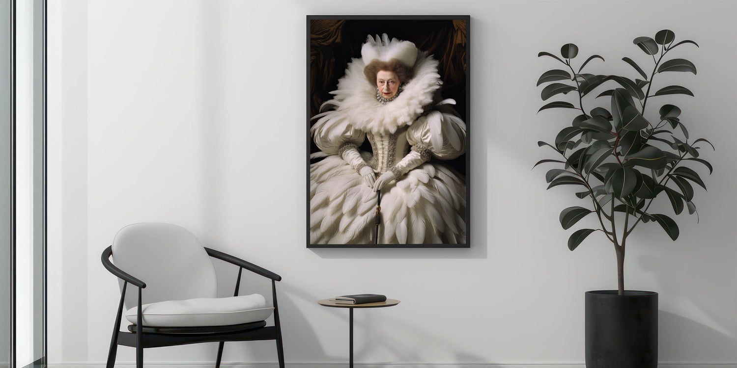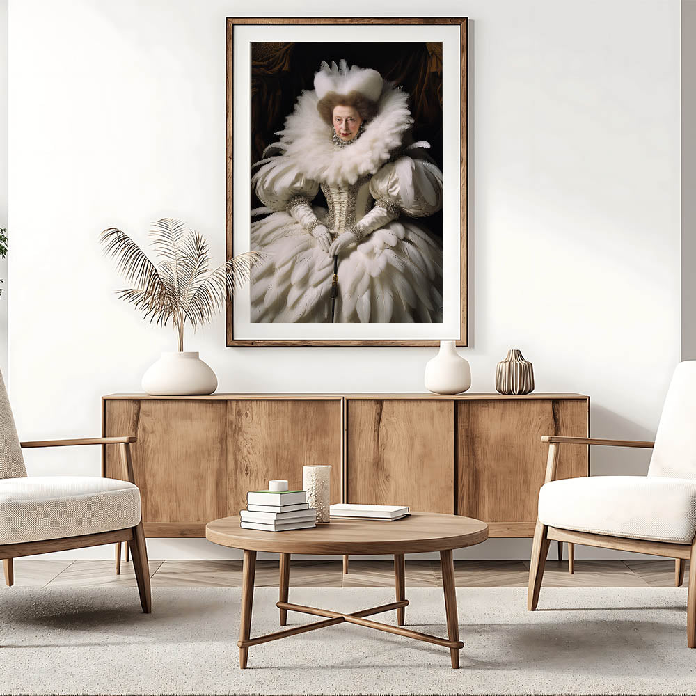 Elevate your space with this timeless portrait print of an elegant noblewoman dressed in a luxurious feathered gown. This nostalgic portrait art showcases intricate detailing, regal elegance, and a dramatic contrast between light and shadow, making it the perfect choice for historic portrait decor. The exquisite craftsmanship and old-world portrait decor aesthetic bring an air of sophistication and grandeur to any setting.