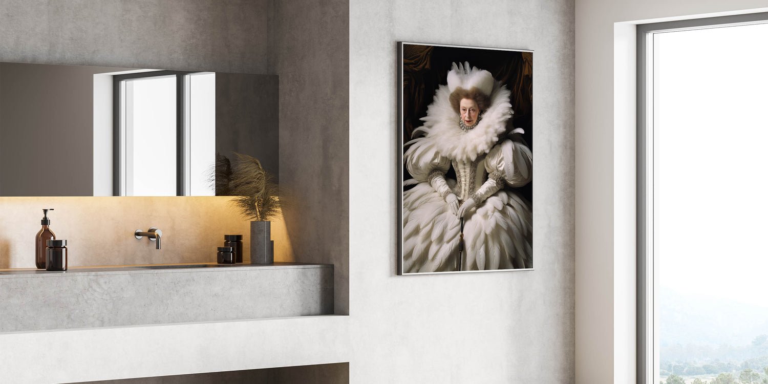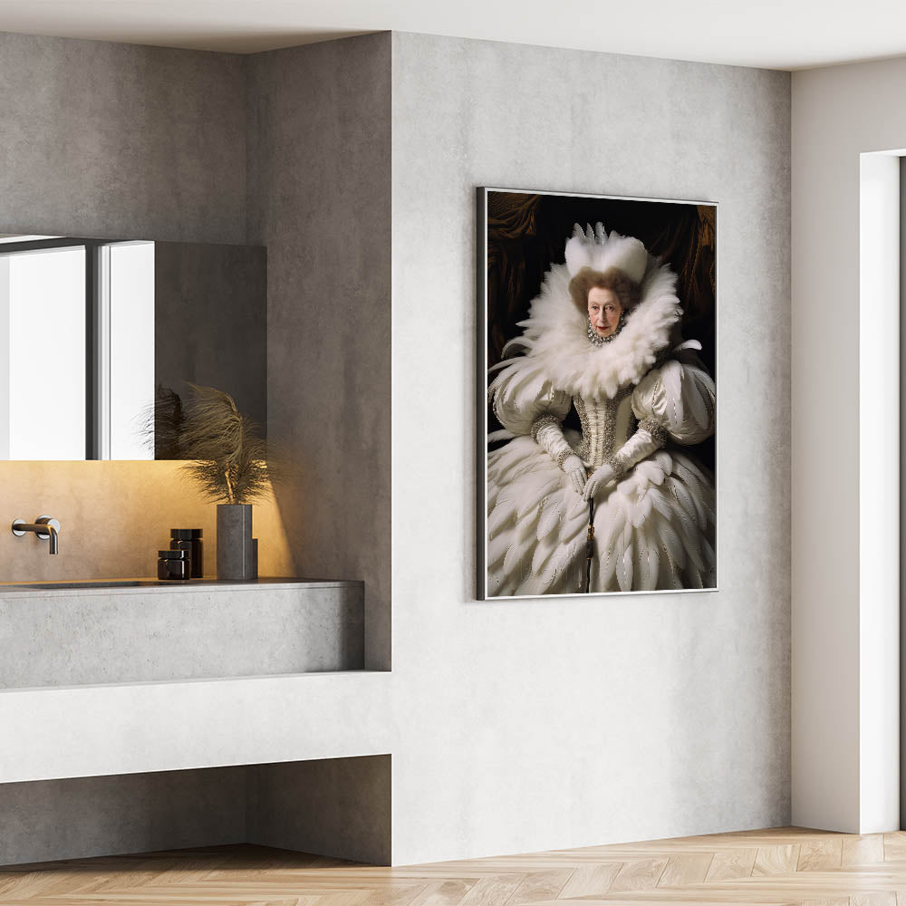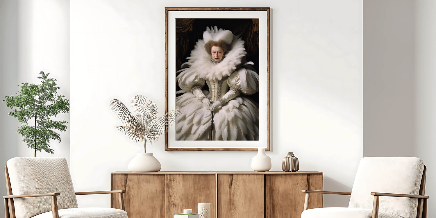 Elevate your space with this timeless portrait print of an elegant noblewoman dressed in a luxurious feathered gown. This nostalgic portrait art showcases intricate detailing, regal elegance, and a dramatic contrast between light and shadow, making it the perfect choice for historic portrait decor. The exquisite craftsmanship and old-world portrait decor aesthetic bring an air of sophistication and grandeur to any setting.