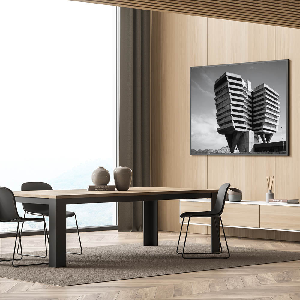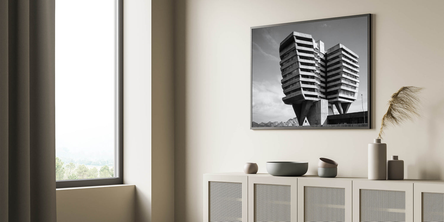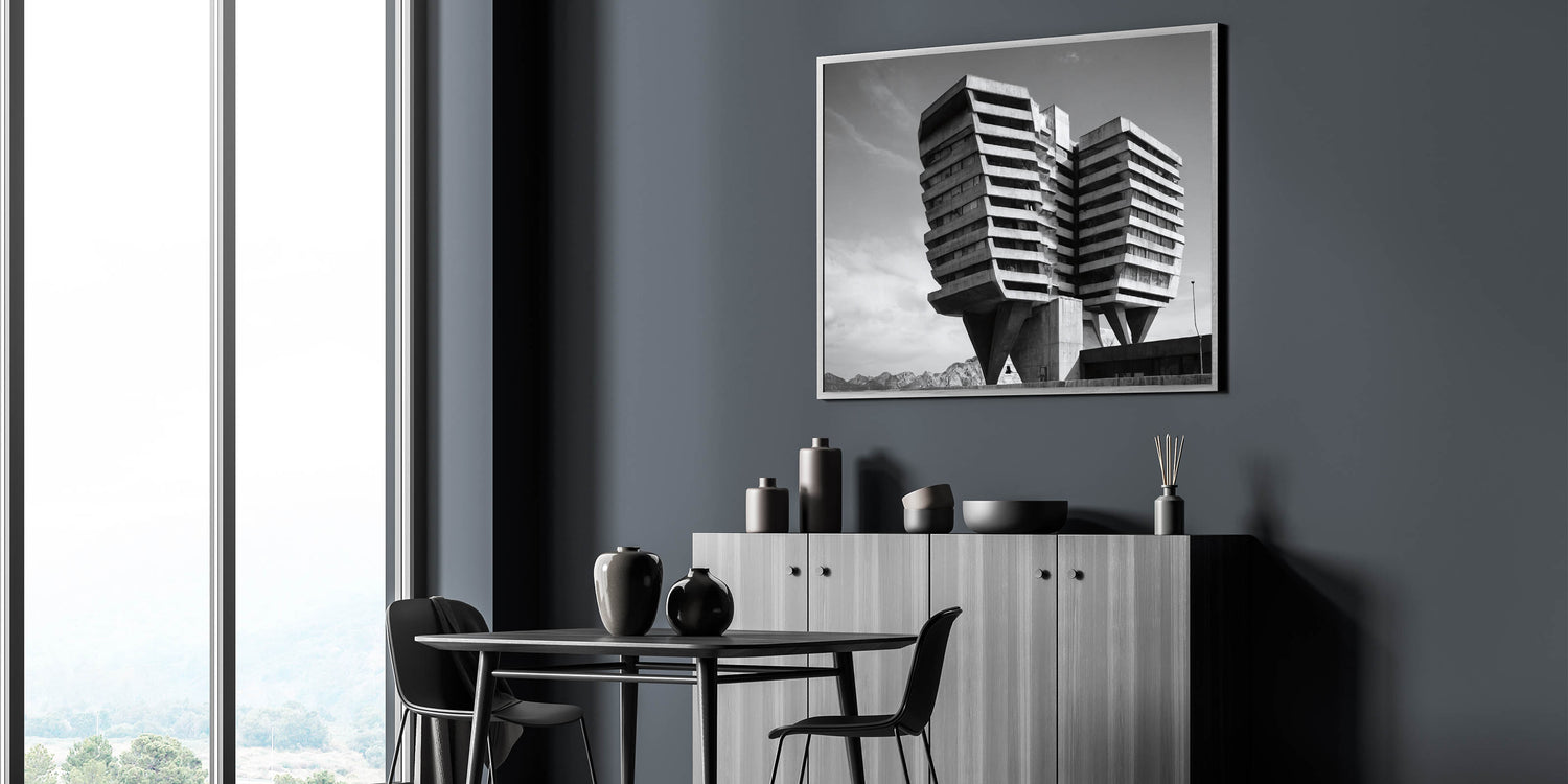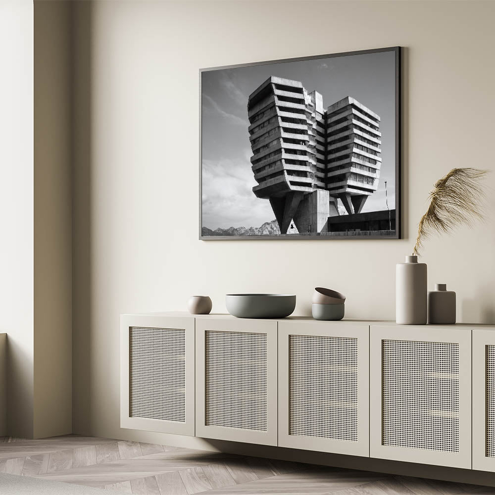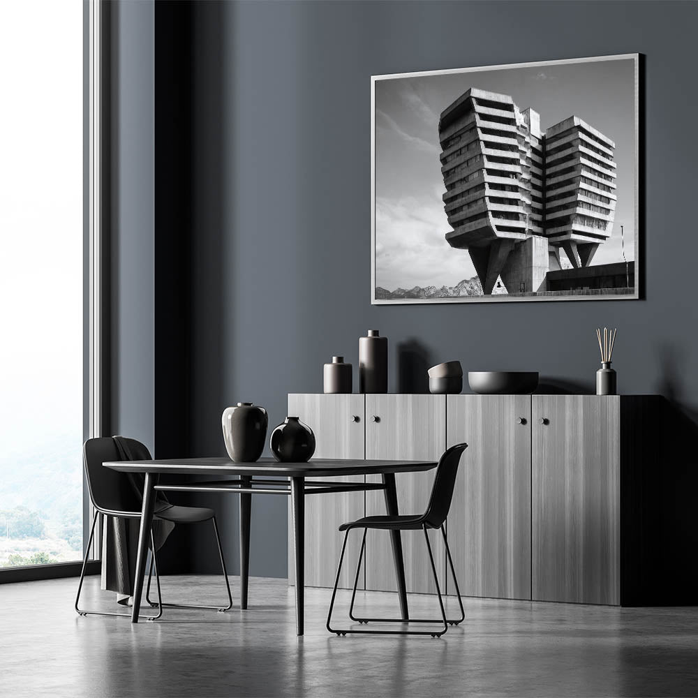 Capture the essence of Brutalist architecture with this stunning monochrome wall art piece. Featuring an iconic structure with raw, industrial lines, this artwork reflects the Brutalist aesthetic through its minimalist design and powerful presence. The bold use of concrete forms and rigid geometric shapes makes this artwork a perfect statement piece for modern interiors inspired by industrial design and mid-century modern decor.