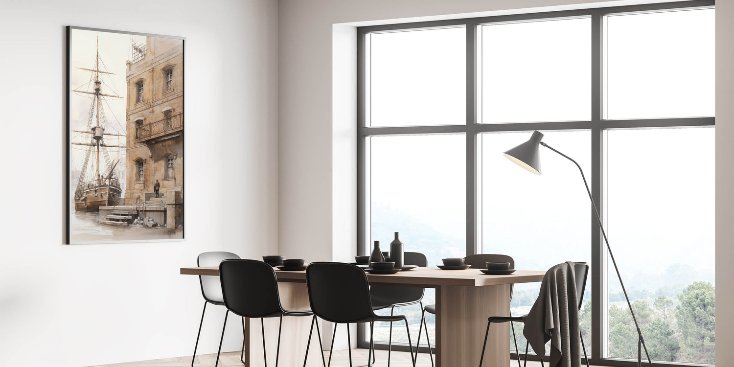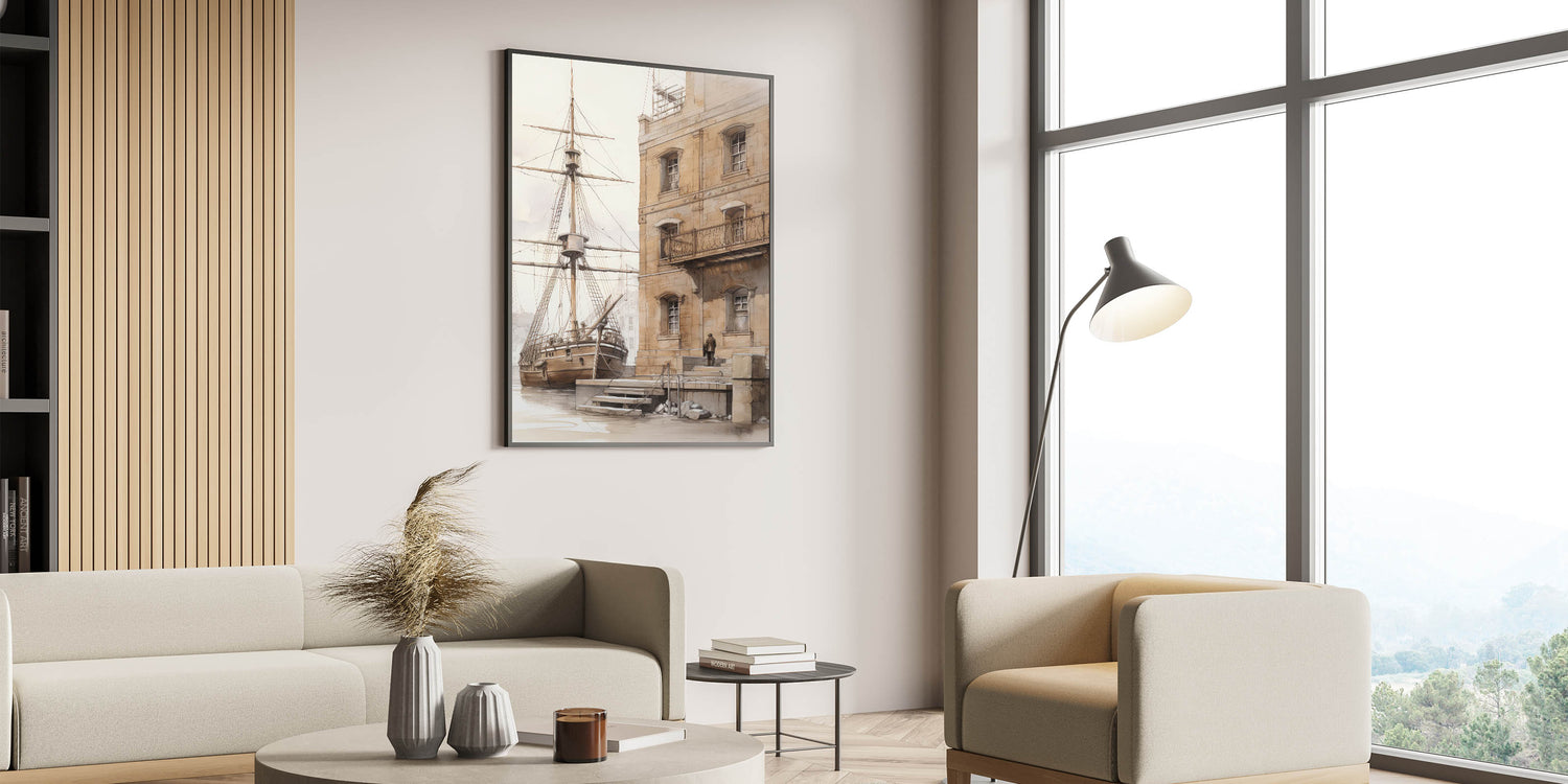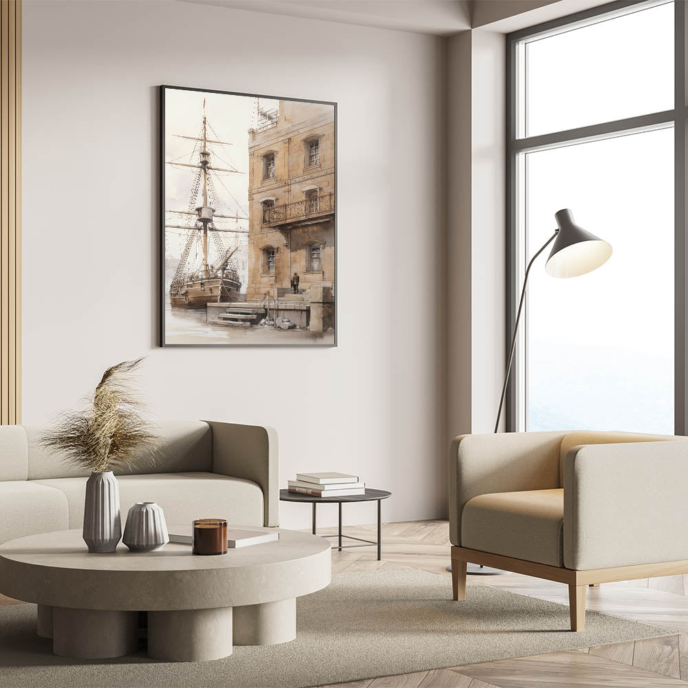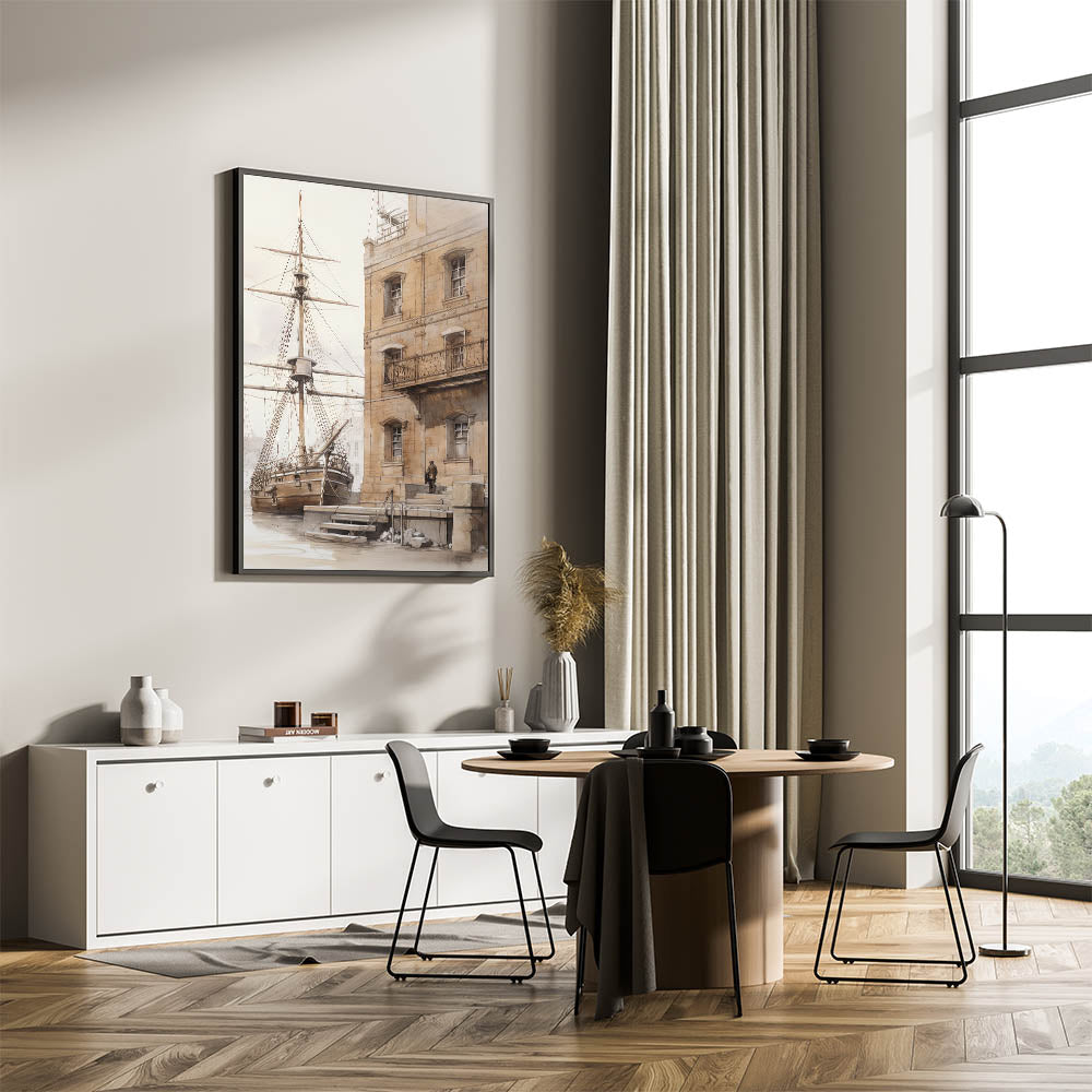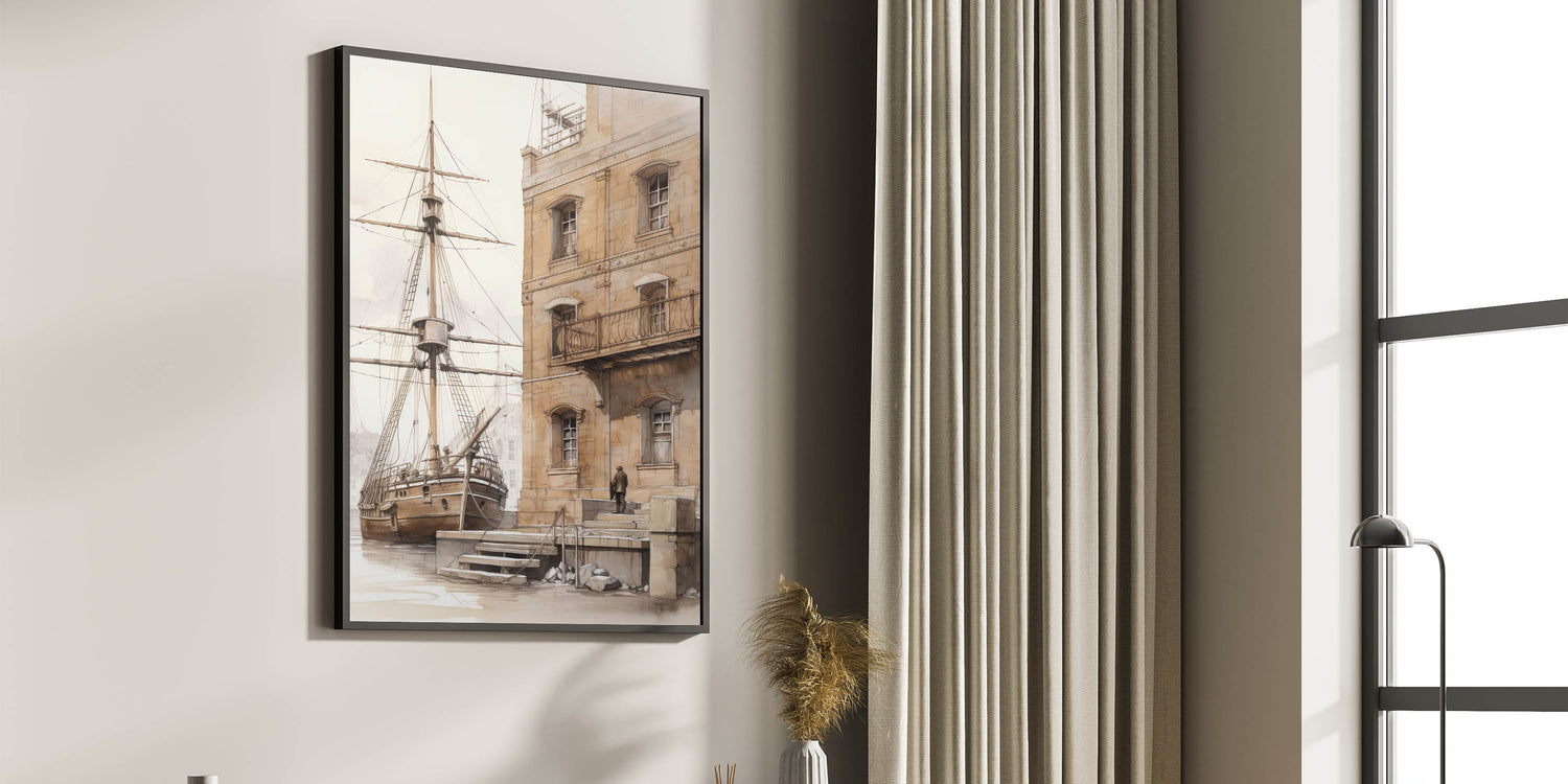 Architectural Wall Art: Historic Dock and Ship Illustration