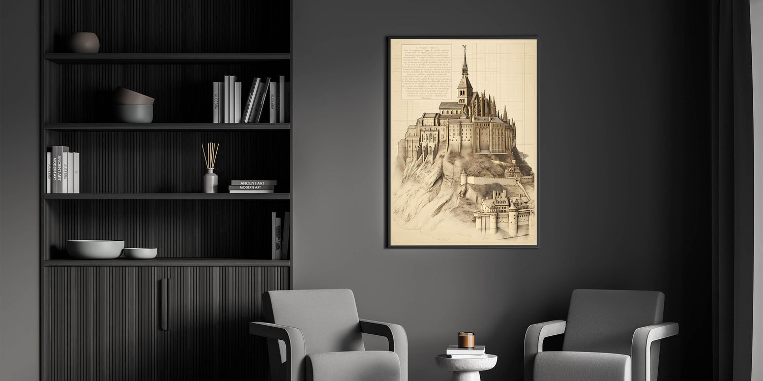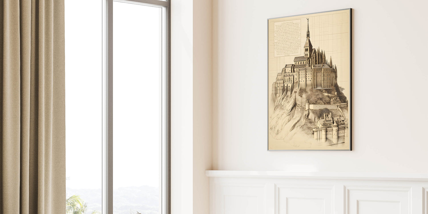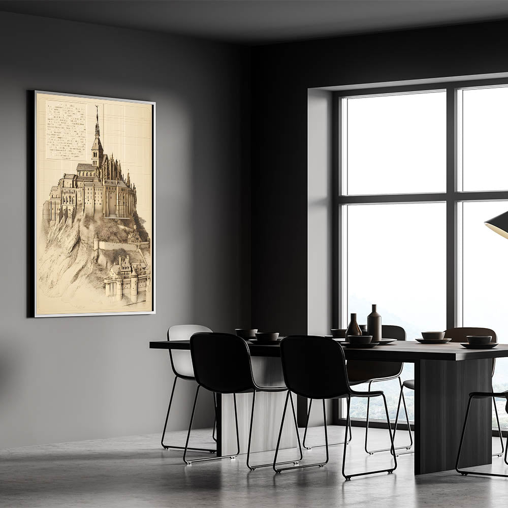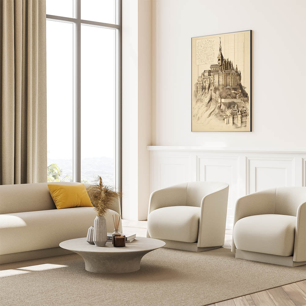 This exquisite vintage architectural wall art features a stunning illustration of Mont Saint-Michel, one of France's most iconic landmarks. The detailed drawing showcases the majestic abbey perched atop a rocky island, blending Gothic and Romanesque architecture. This historic building print captures the beauty and intricate design of Mont Saint-Michel, making it an exceptional piece for lovers of historic architecture and vintage building illustrations.