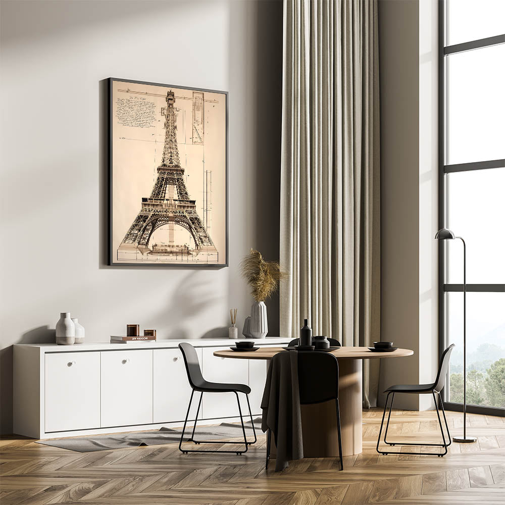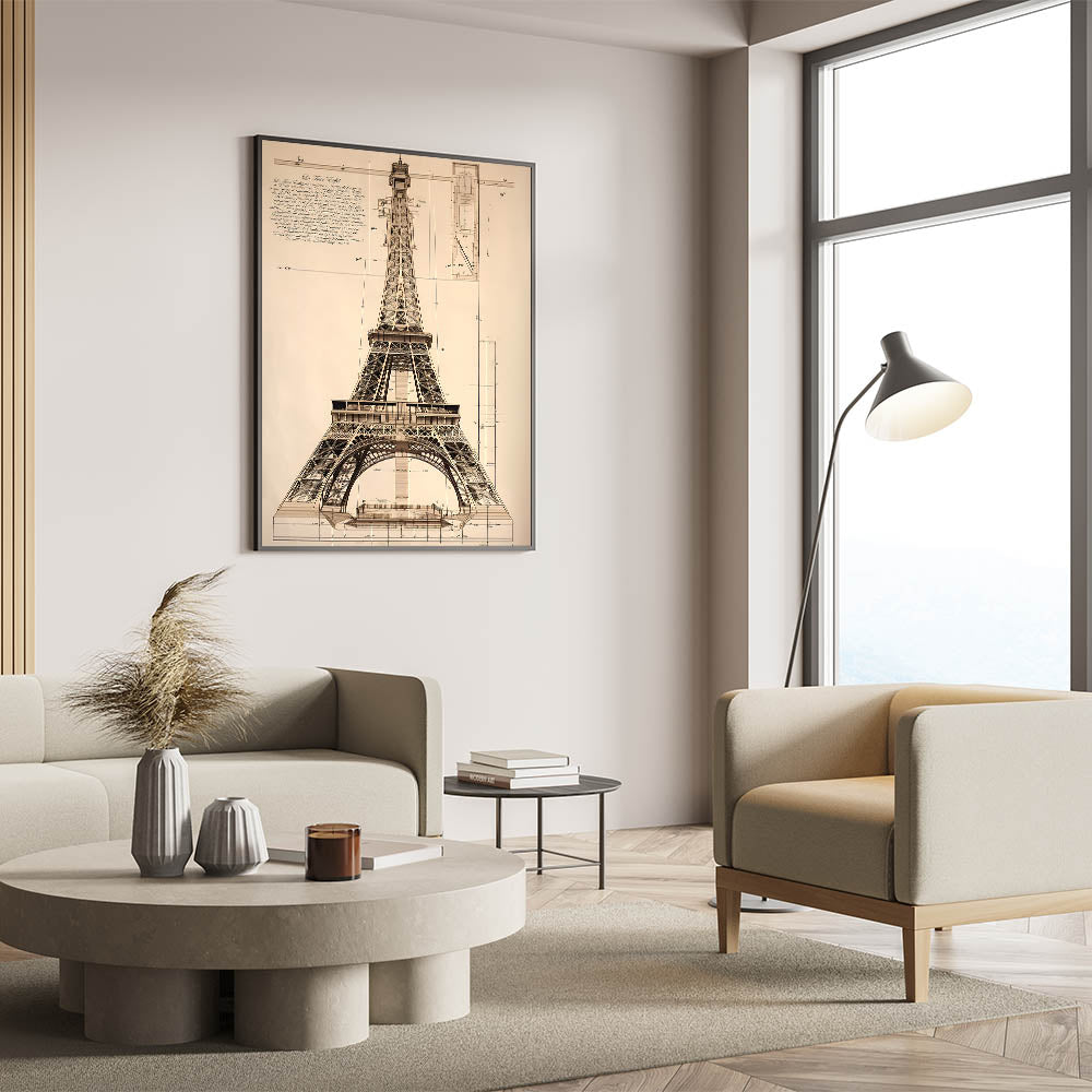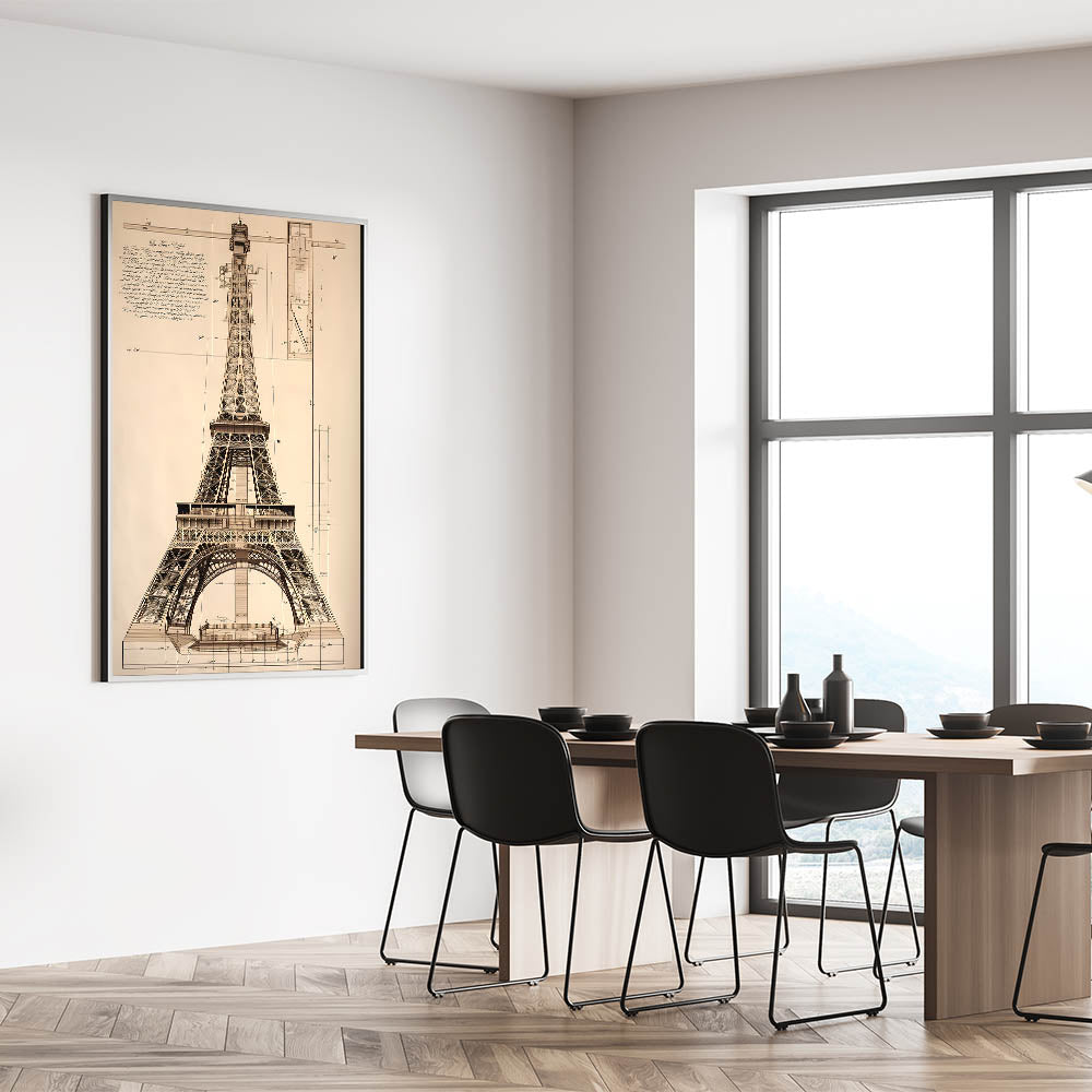 Elevate your space with our Vintage Eiffel Tower Architectural Wall Art, a stunning illustration that captures the intricate details of this iconic historic structure. This artwork is part of our Vintage Architecture Collection, designed for those who appreciate detailed architectural drawings and classic design styles. The sepia-toned blueprint effect adds a touch of elegance, making it a perfect fit for living rooms, offices, and study spaces.
