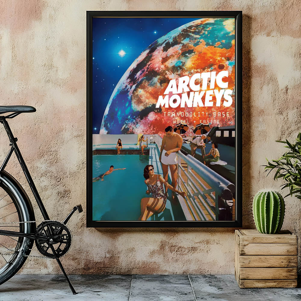 Add a cosmic vibe to your space with this Arctic Monkeys Retro Poster, inspired by the Tranquility Base Hotel + Casino album. Featuring a surreal mix of space elements, vibrant blues, and warm tones, this vintage print captures the essence of Retro Aesthetic and Mid-Century Modern Art. The dreamy atmosphere and nostalgic design make it a must-have for indie rock fans and lovers of Vintage Decor. Ideal for bedrooms, music rooms, or living spaces, this art print transforms your decor into a tribute to Arctic Monkeys’ iconic style.