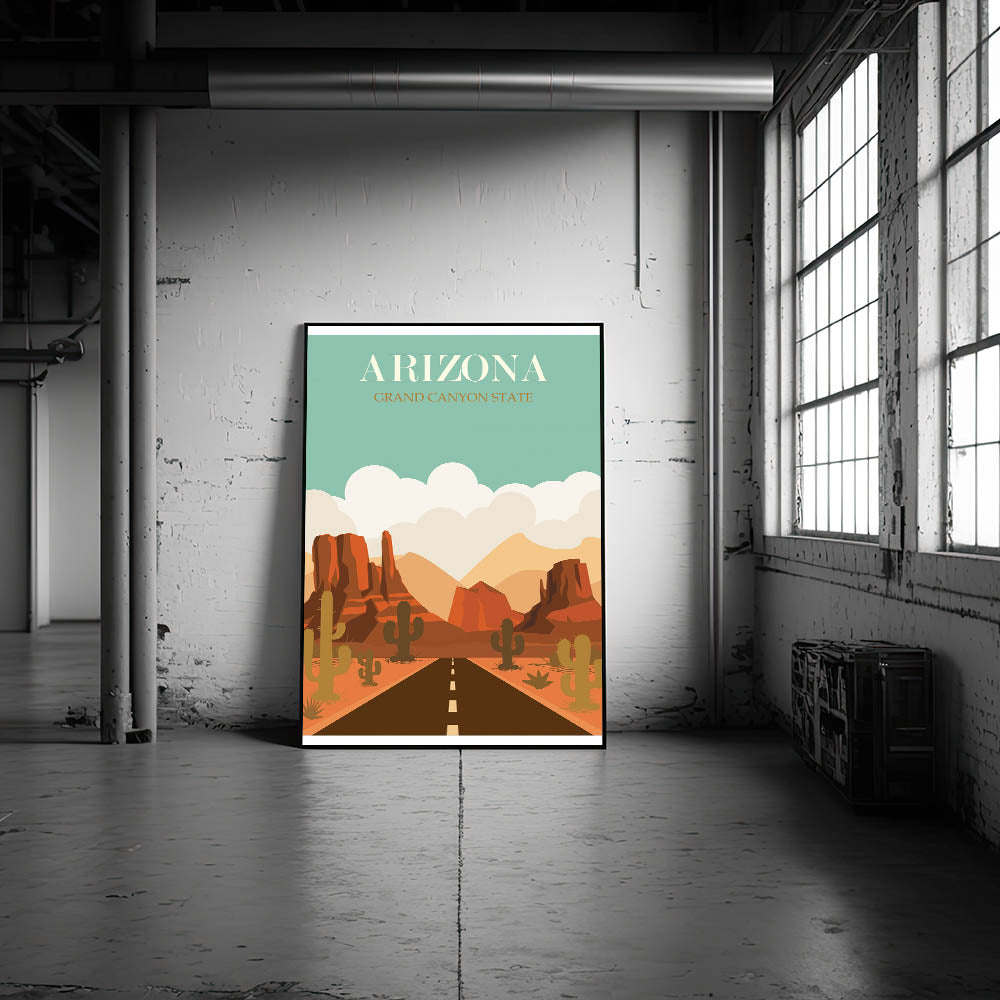 Experience the rugged beauty of Arizona with this retro-inspired travel poster. Featuring a scenic desert landscape with towering red rock formations, cacti, and a road leading through it all, this vintage print captures the spirit of adventure and the iconic beauty of the Grand Canyon State. The soft pastel colors and clean lines evoke a sense of nostalgia, making it the perfect addition to any retro or travel-themed space.