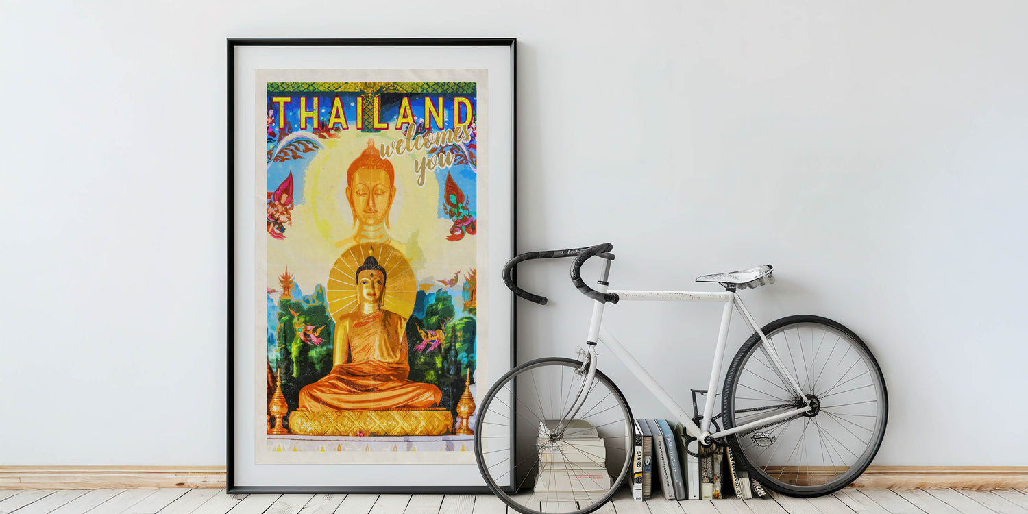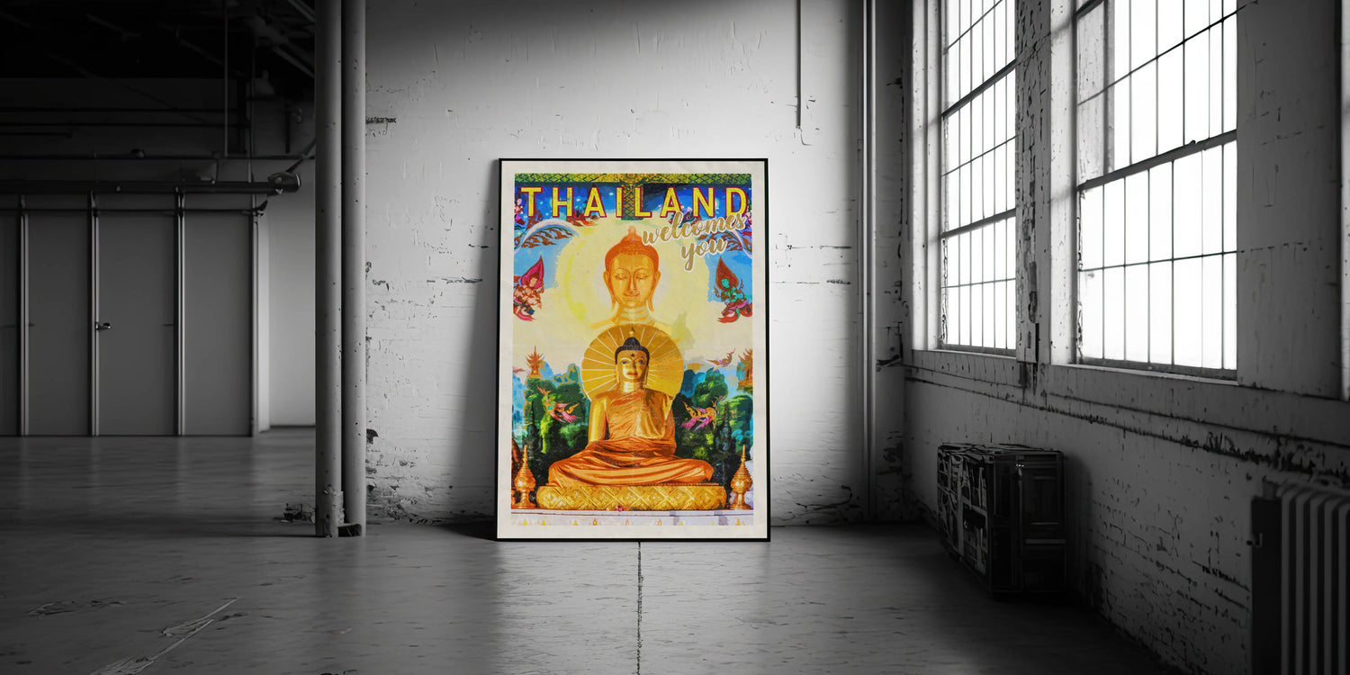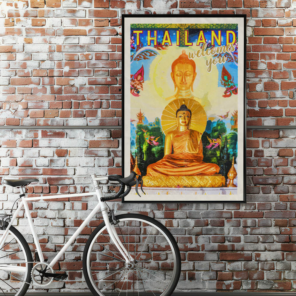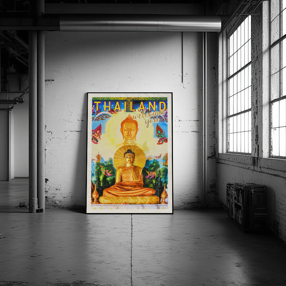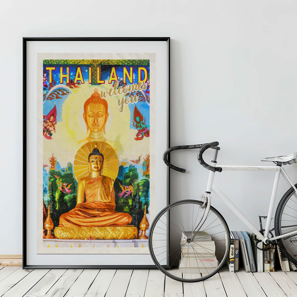 Discover the vibrant charm of Thailand with this retro-inspired travel poster. Featuring a majestic golden Buddha and colorful, ornate details, this piece brings the rich cultural and spiritual beauty of Bangkok to life. The bold, welcoming "Thailand welcomes you" message, along with the intricate decorations and serene image of the Buddha, evoke a sense of peace and wonder, making it the perfect addition to any travel or cultural art collection.