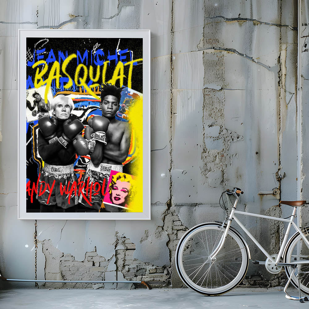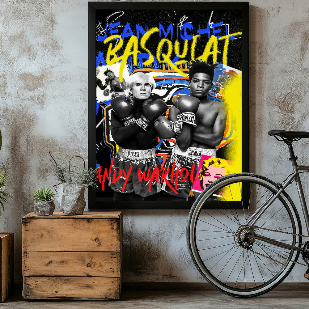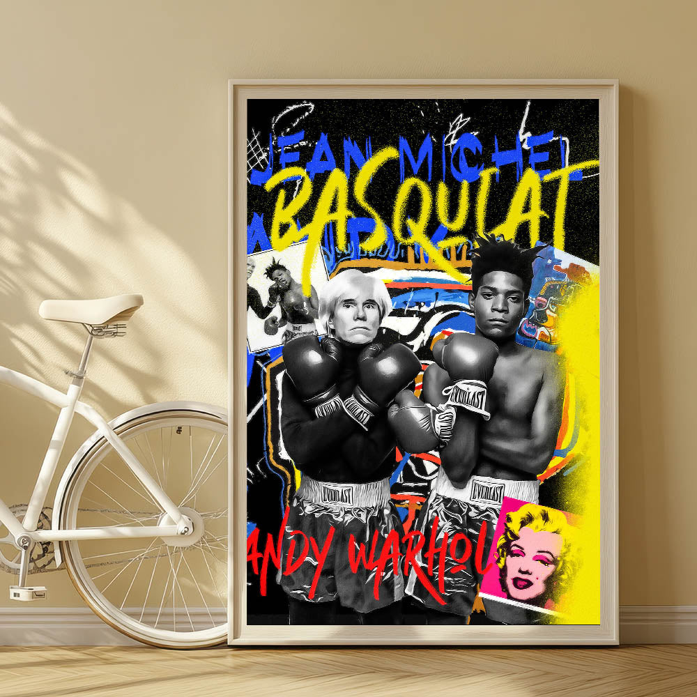 Celebrate the bold fusion of two art legends with this vibrant pop art wall art featuring Jean-Michel Basquiat and Andy Warhol. This modern pop art print captures the raw energy and rebellious spirit of the iconic duo, blending bold yellows, blues, reds, and blacks. The electrifying contrast and graffiti-inspired elements make this piece a must-have for fans of contemporary and retro-inspired pop art décor.