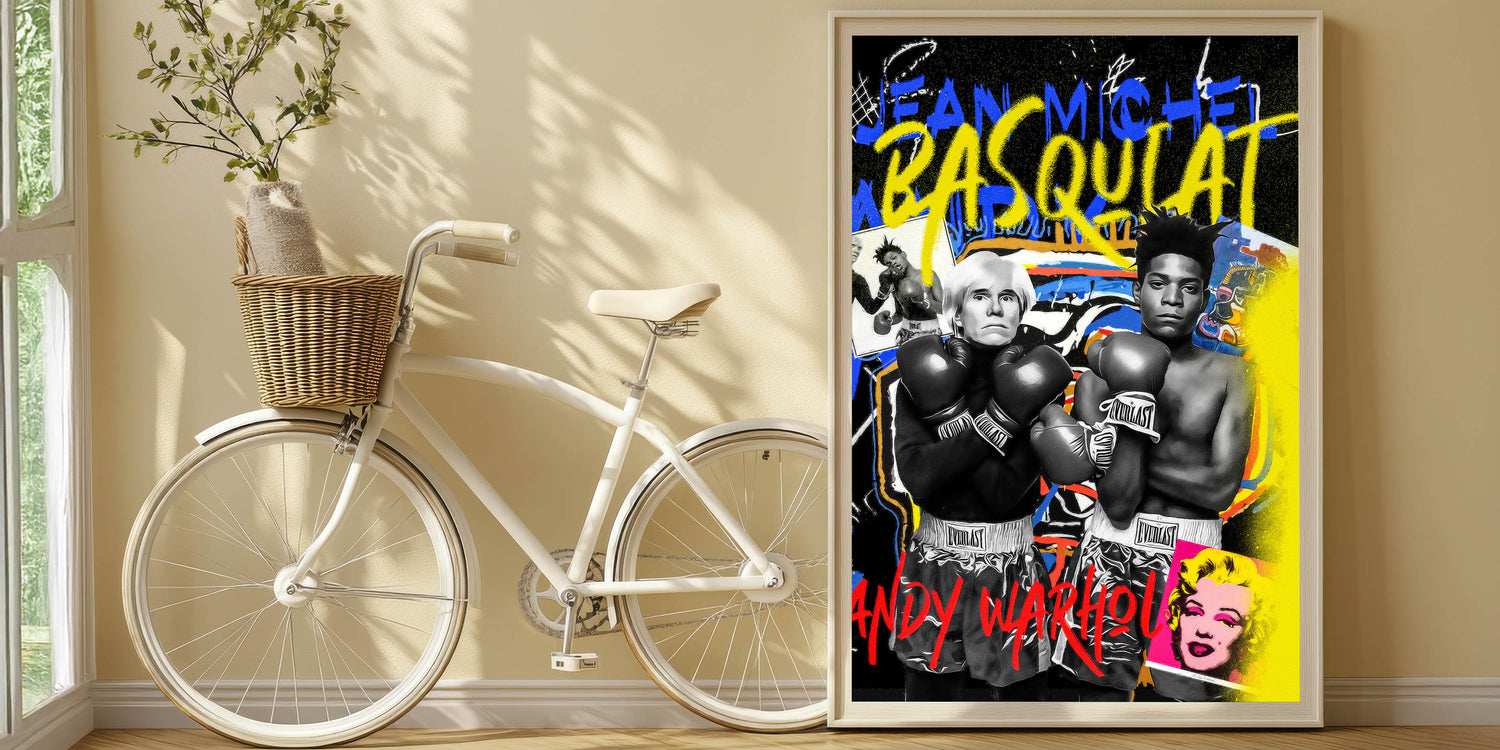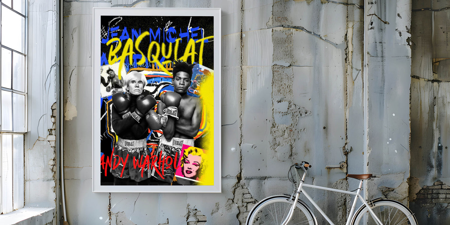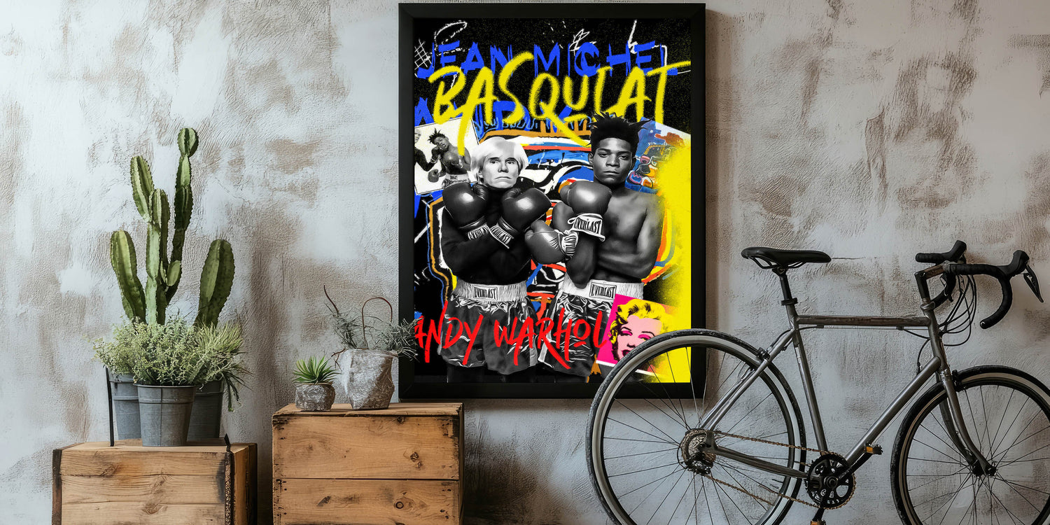 Celebrate the bold fusion of two art legends with this vibrant pop art wall art featuring Jean-Michel Basquiat and Andy Warhol. This modern pop art print captures the raw energy and rebellious spirit of the iconic duo, blending bold yellows, blues, reds, and blacks. The electrifying contrast and graffiti-inspired elements make this piece a must-have for fans of contemporary and retro-inspired pop art décor.