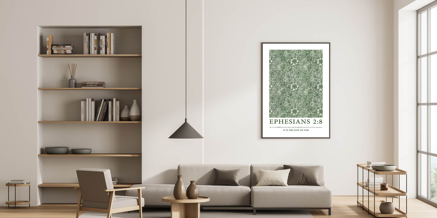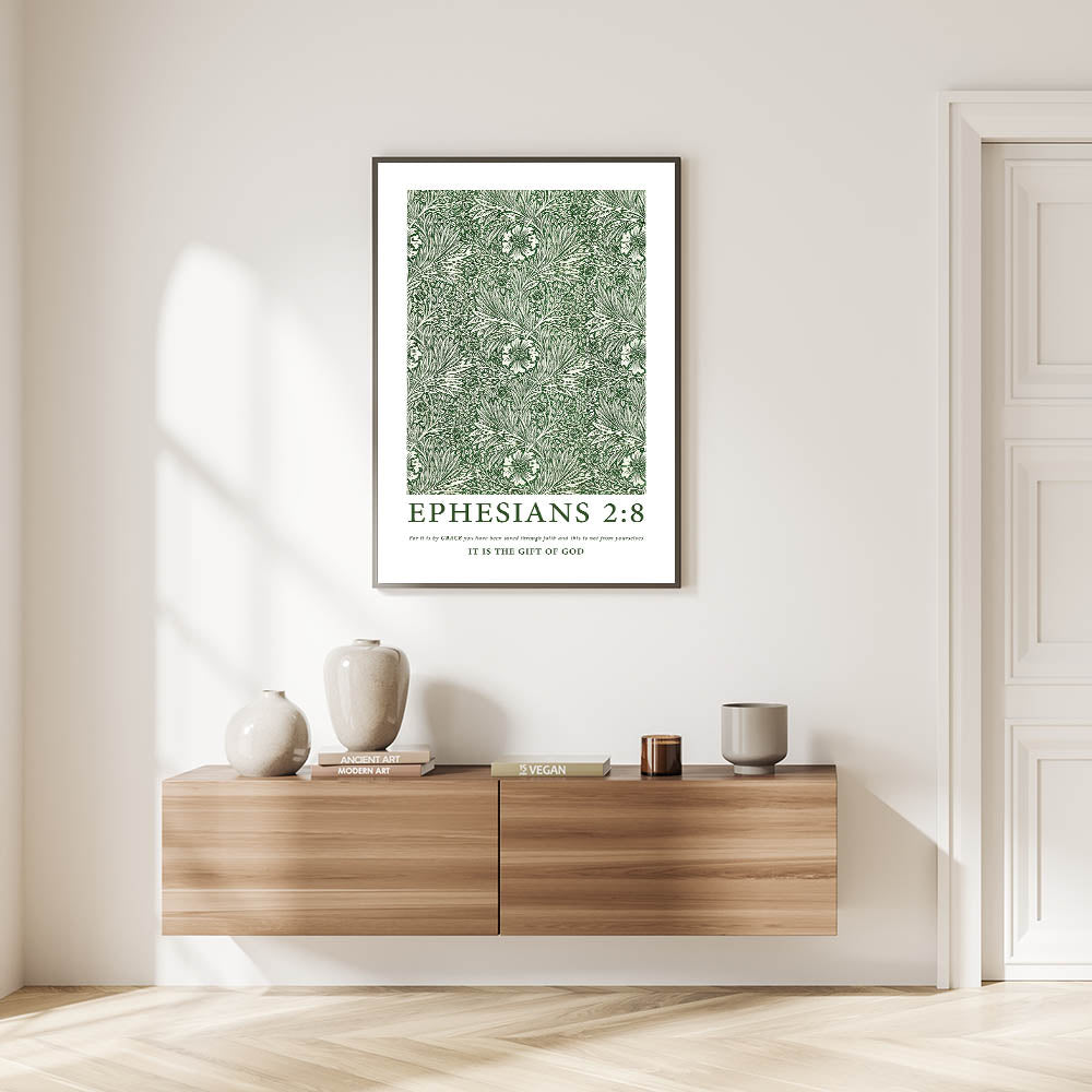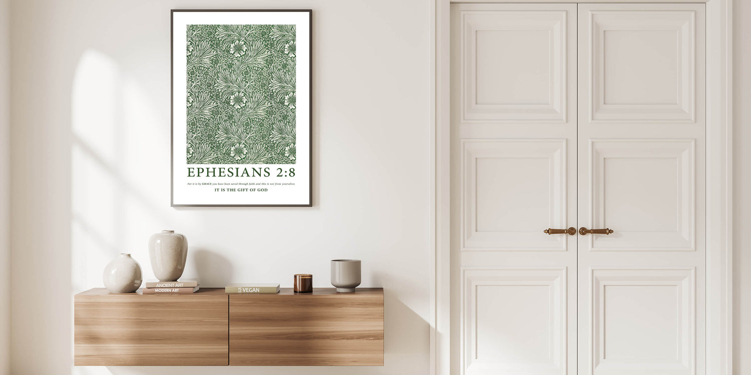 Bring a touch of faith and elegance to your space with our Biblical Typography Wall Art featuring Ephesians 2:8: "For it is by grace you have been saved through faith." This design beautifully combines scripture with intricate green floral patterns, creating a serene and meaningful piece that’s perfect for living rooms, bedrooms, or prayer spaces. The detailed botanical artwork adds a natural, calming element, making it a thoughtful gift for loved ones or a graceful addition to your own decor.