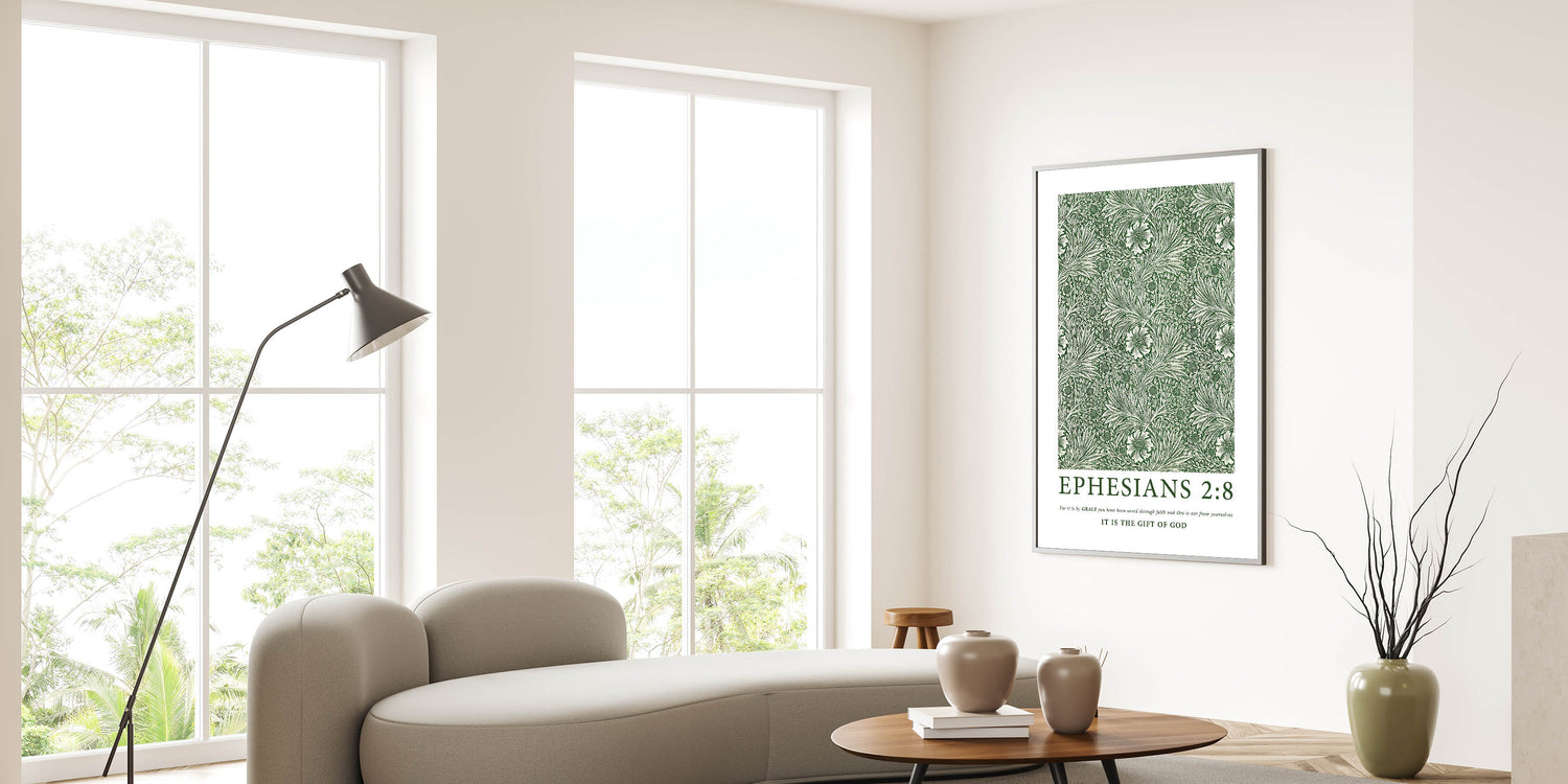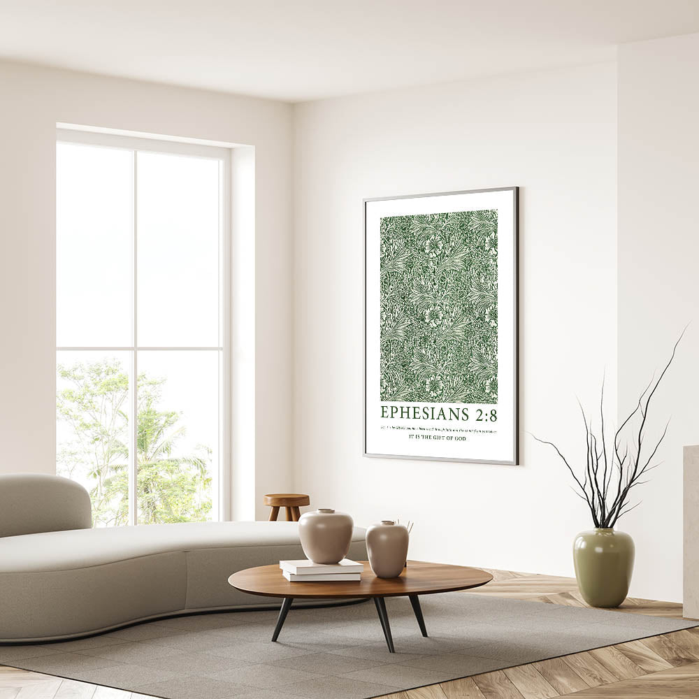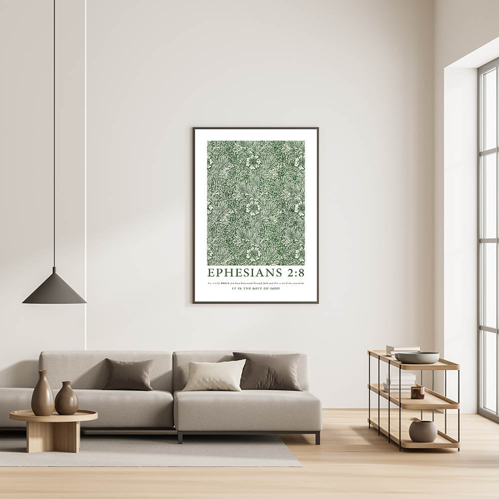 Bring a touch of faith and elegance to your space with our Biblical Typography Wall Art featuring Ephesians 2:8: "For it is by grace you have been saved through faith." This design beautifully combines scripture with intricate green floral patterns, creating a serene and meaningful piece that’s perfect for living rooms, bedrooms, or prayer spaces. The detailed botanical artwork adds a natural, calming element, making it a thoughtful gift for loved ones or a graceful addition to your own decor.