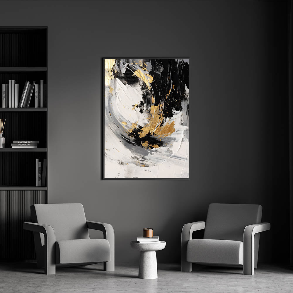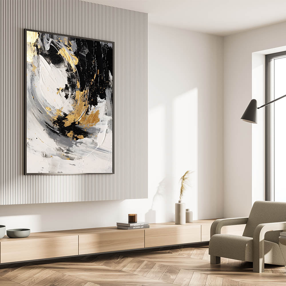 Enhance your home with this luxurious black and gold abstract wall art. Featuring bold black, white, and rich gold tones, this artwork exudes sophistication and modern elegance. The textured brushstrokes and fluid design create a sense of movement and drama, making it a perfect choice for glam-inspired interiors. This artwork offers a chic and opulent touch to any space, making it a striking focal point for modern homes.
