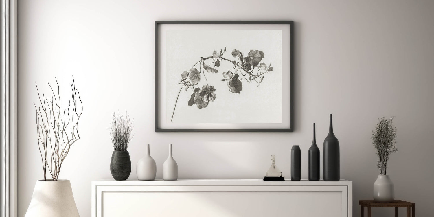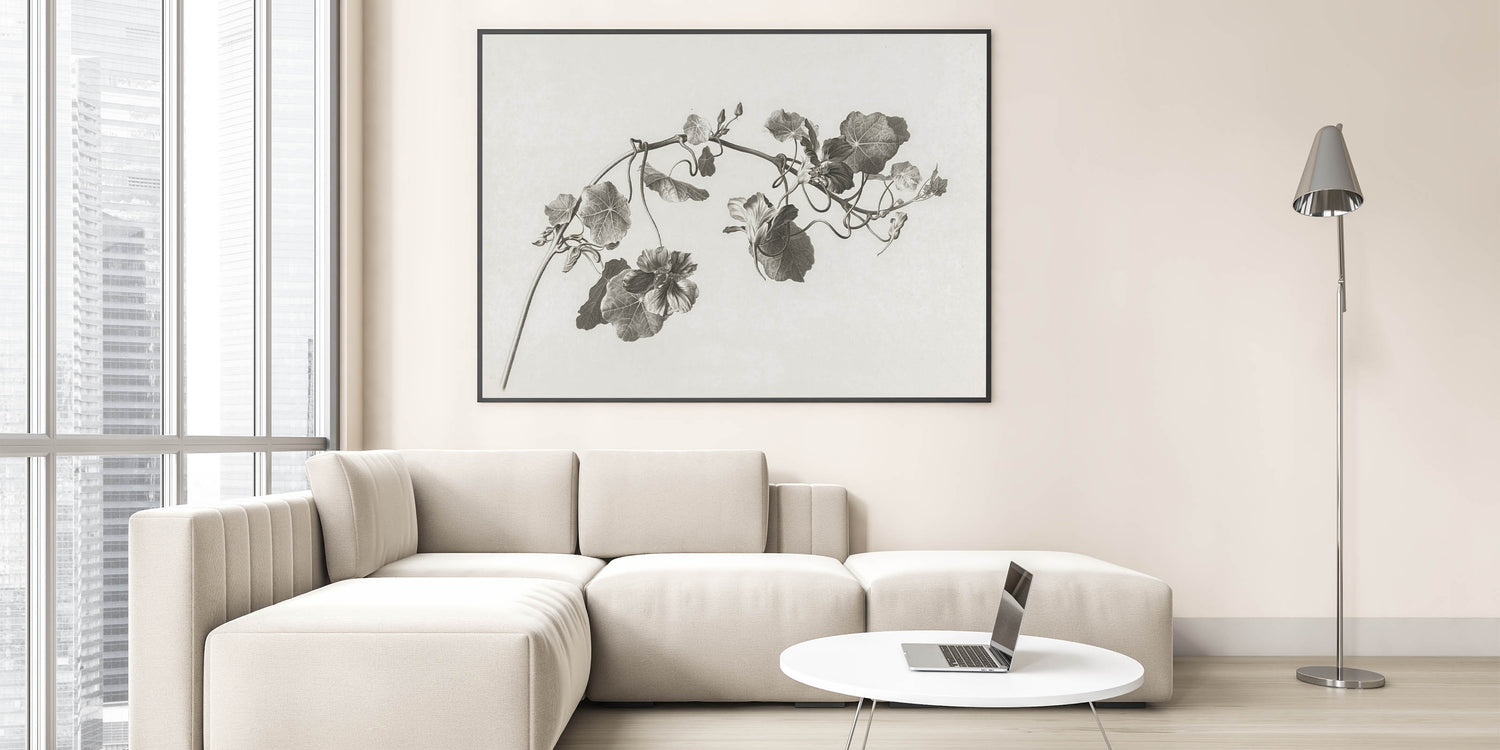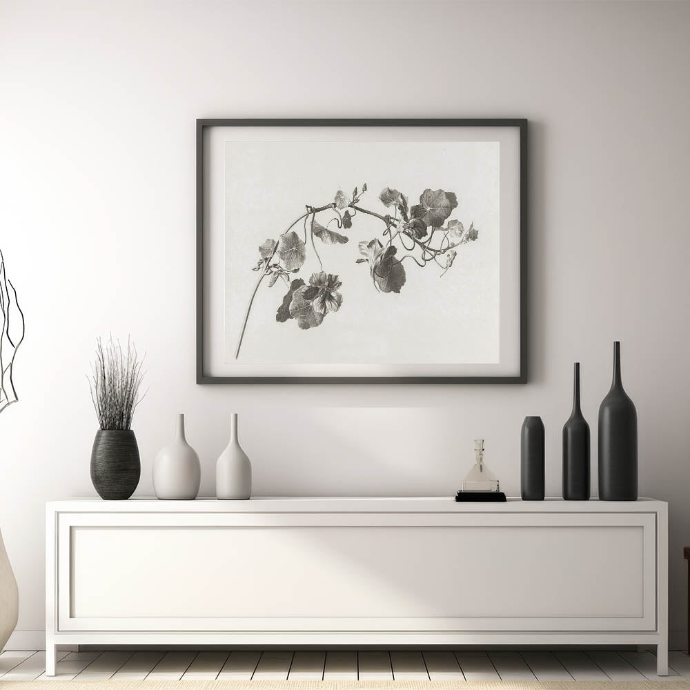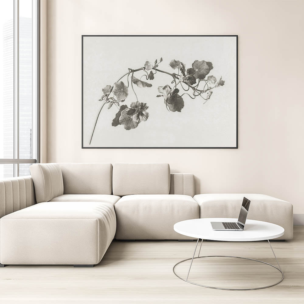 This botanical wall art offers a classic, monochrome representation of Nasturtium, capturing its delicate flowers and winding vines in intricate detail. Whether displayed in your living room, office, or bedroom, it brings a sophisticated, timeless charm to any decor. Elevate your home with this botanical illustration art, perfect for art lovers seeking understated beauty.