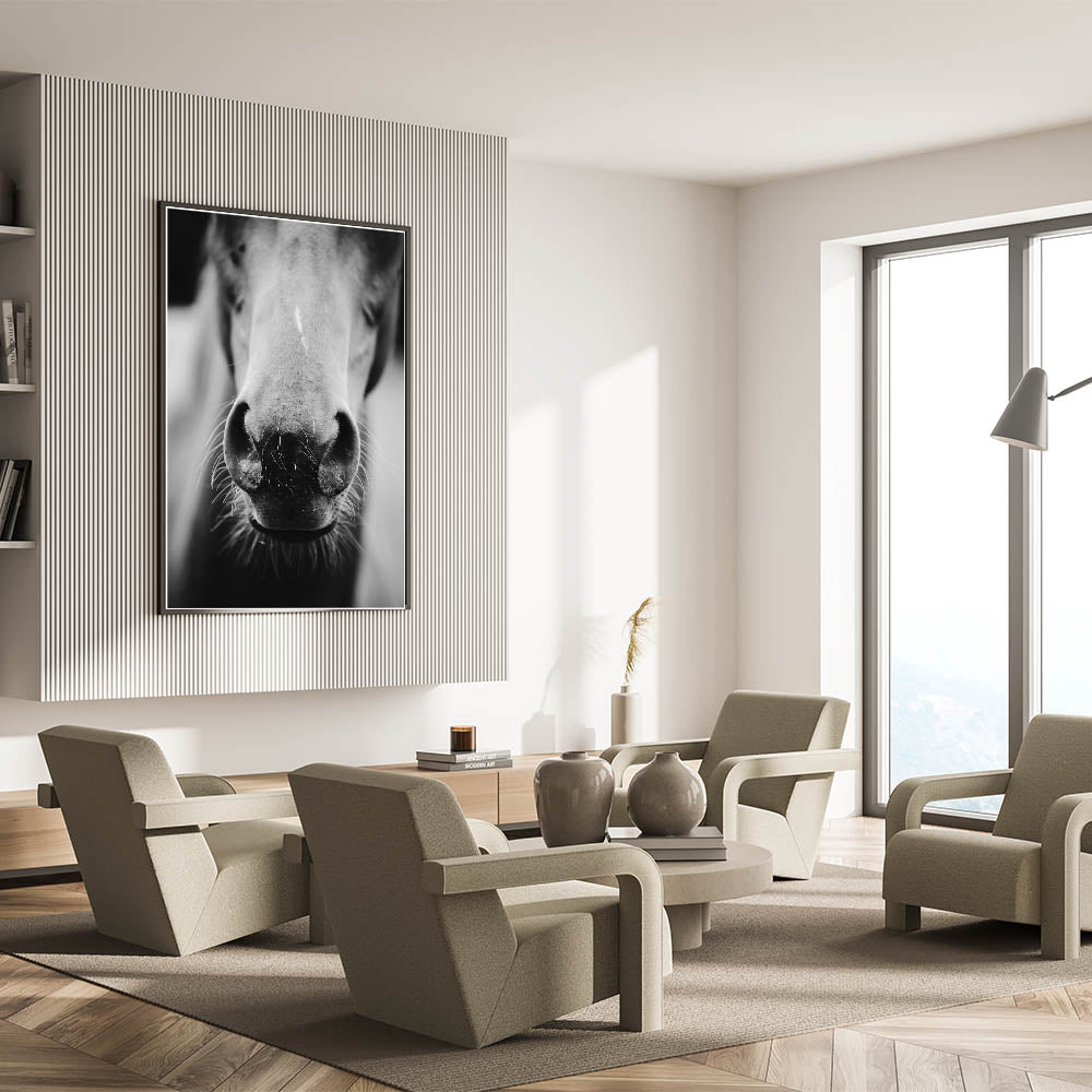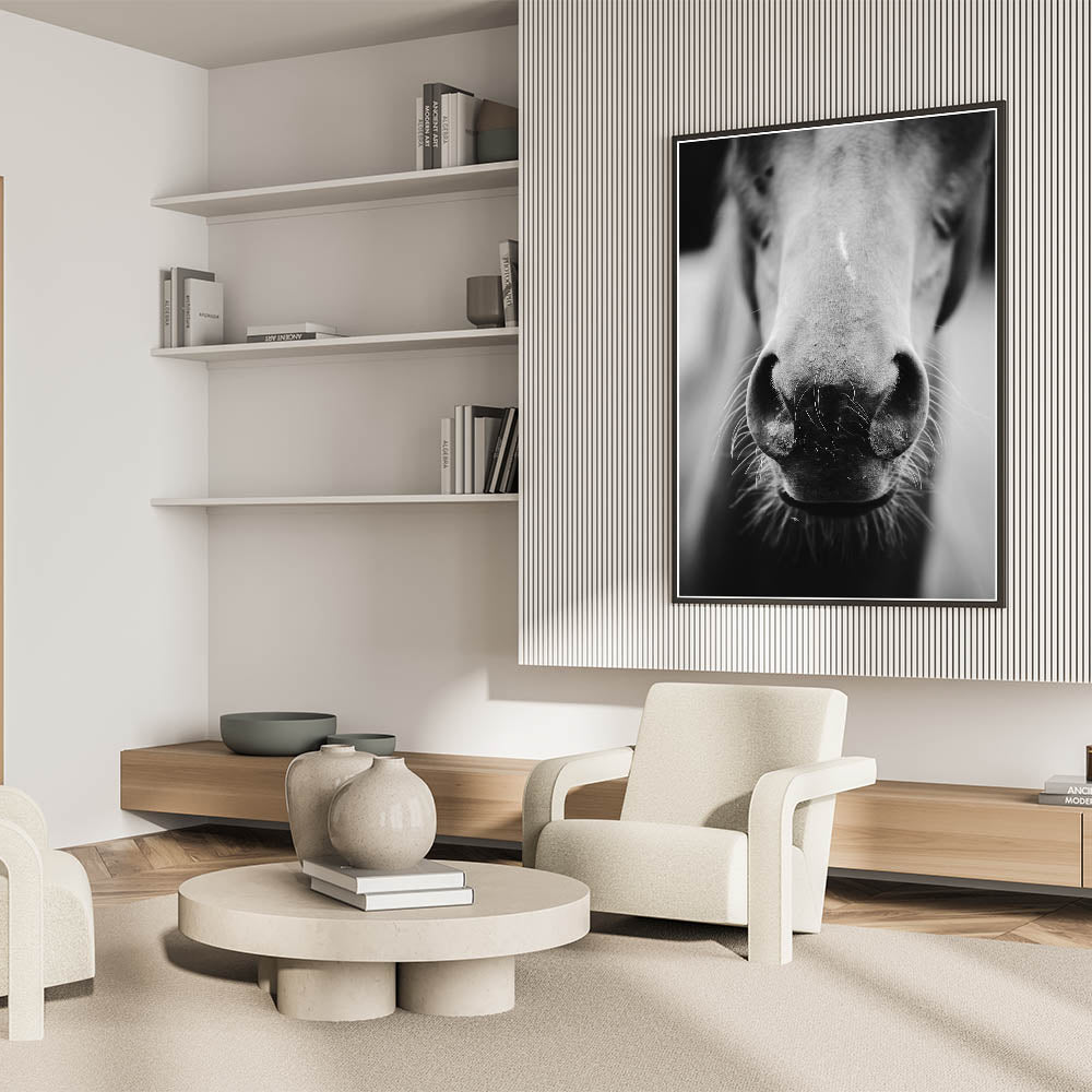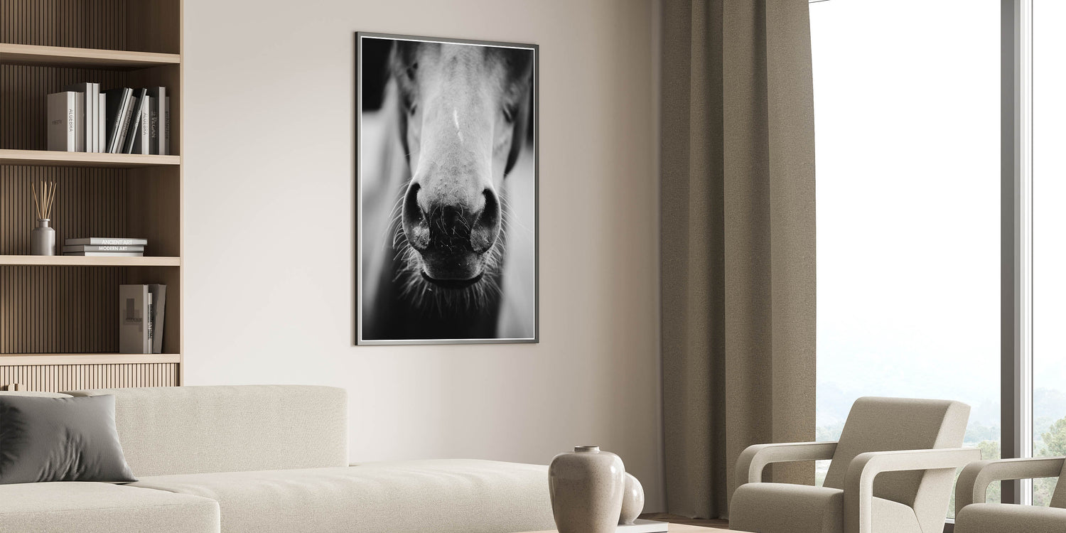 Capture the beauty and intimacy of rural life with this striking black and white wall art featuring a close-up of a horse’s nose. This minimalist yet powerful design brings out the texture and details of the horse, creating a captivating focal point for any room. Perfect for rustic, farmhouse, or equestrian-themed interiors, this wall art adds a personal and timeless touch to your space. The monochrome palette gives it a modern edge while maintaining the rustic charm of the subject matter.
