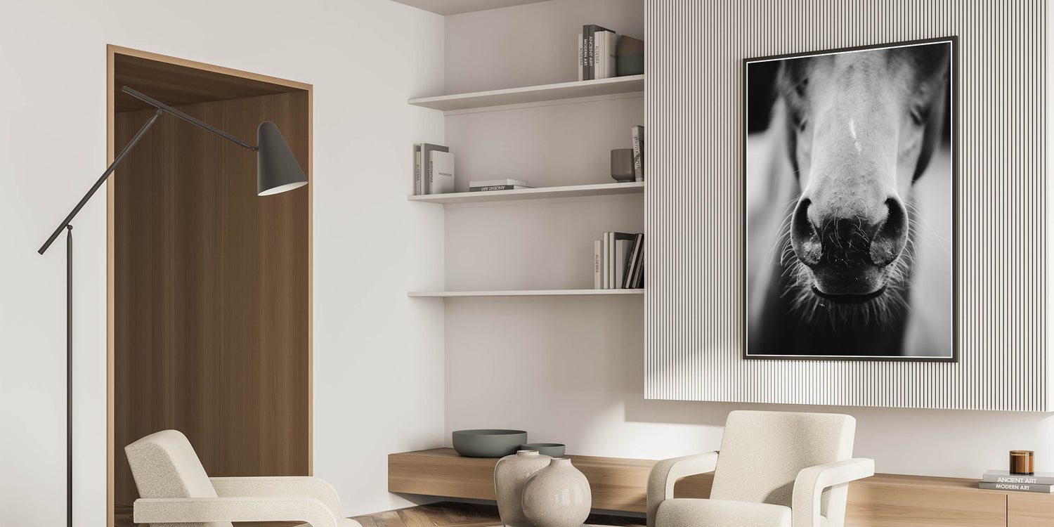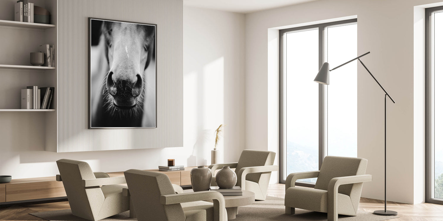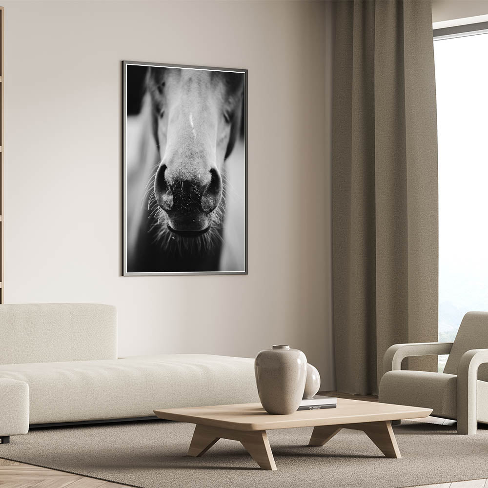 Capture the beauty and intimacy of rural life with this striking black and white wall art featuring a close-up of a horse’s nose. This minimalist yet powerful design brings out the texture and details of the horse, creating a captivating focal point for any room. Perfect for rustic, farmhouse, or equestrian-themed interiors, this wall art adds a personal and timeless touch to your space. The monochrome palette gives it a modern edge while maintaining the rustic charm of the subject matter.