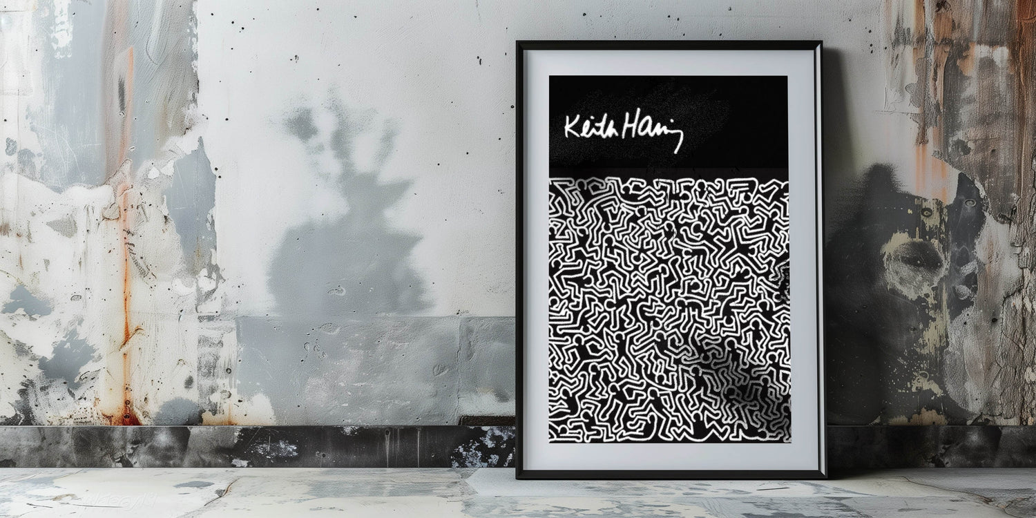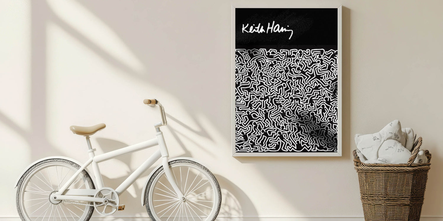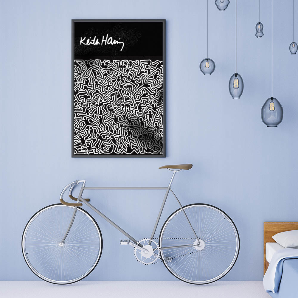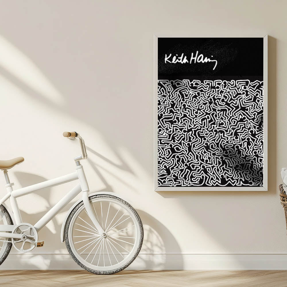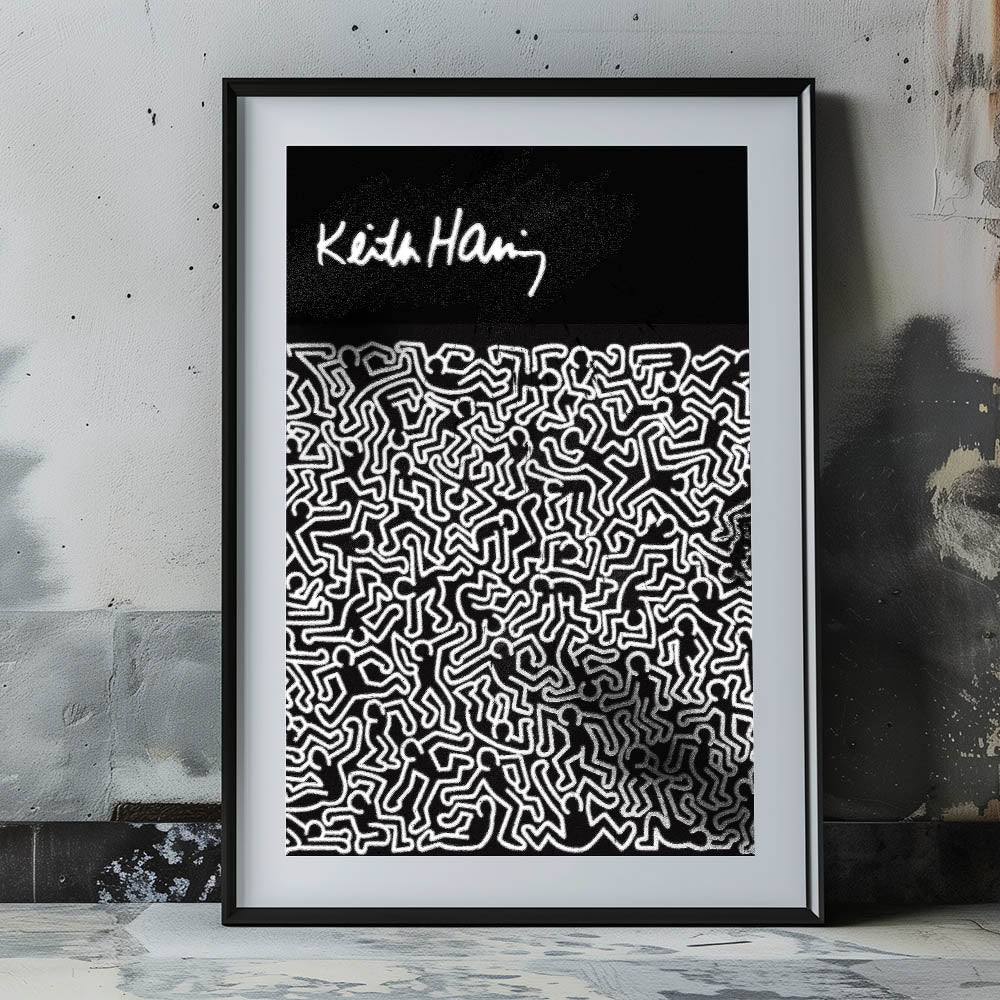 Bring a touch of iconic pop art to your space with this bold black and white wall art, inspired by the energetic and recognizable style of Keith Haring. Featuring a captivating array of dancing figures and graffiti-like line art, this piece captures the vibrant pulse of street art and urban culture. Its minimalist yet dynamic design makes it a perfect addition to any modern or industrial-themed interior.