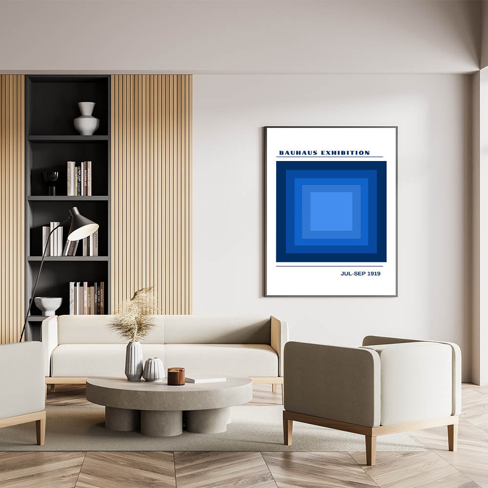 Transform your space with this striking unique bohemian artwork for modern spaces, inspired by the Bauhaus exhibition of 1919. Featuring a bold geometric design of layered blue squares, this piece uses shades of deep navy to light blue to create a sense of depth and movement. Ideal for any room needing a modern and artistic touch, this vibrant bohemian print adds both calm and energy to your décor. Whether in a living room, office, or bedroom, this eclectic boho wall art makes a statement with its minimalist geometric shapes.