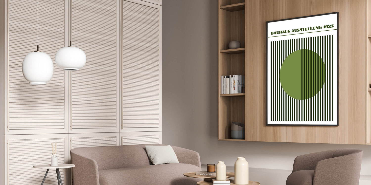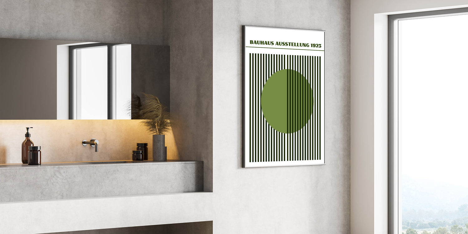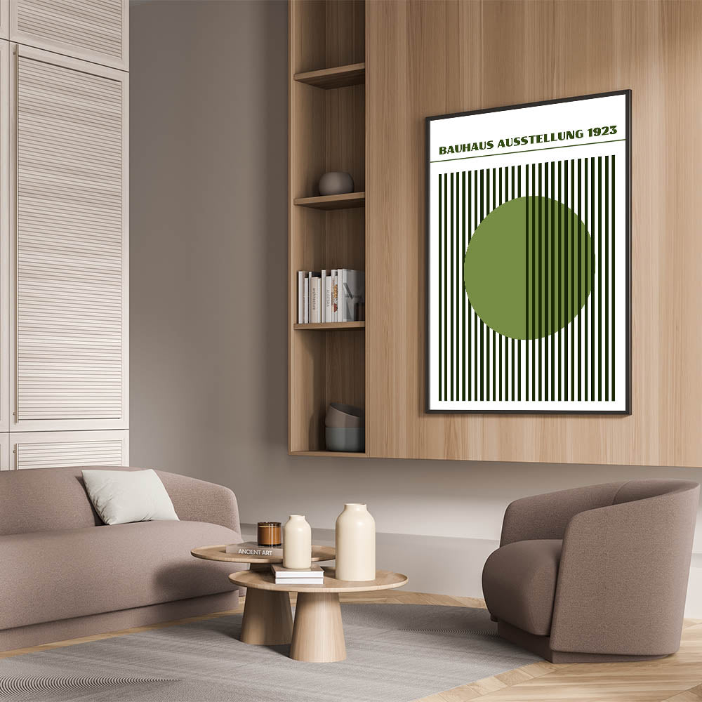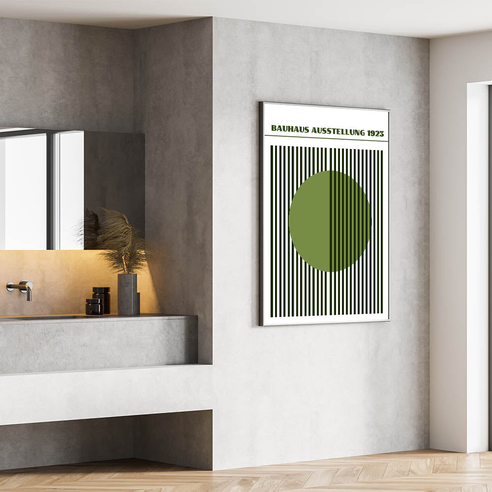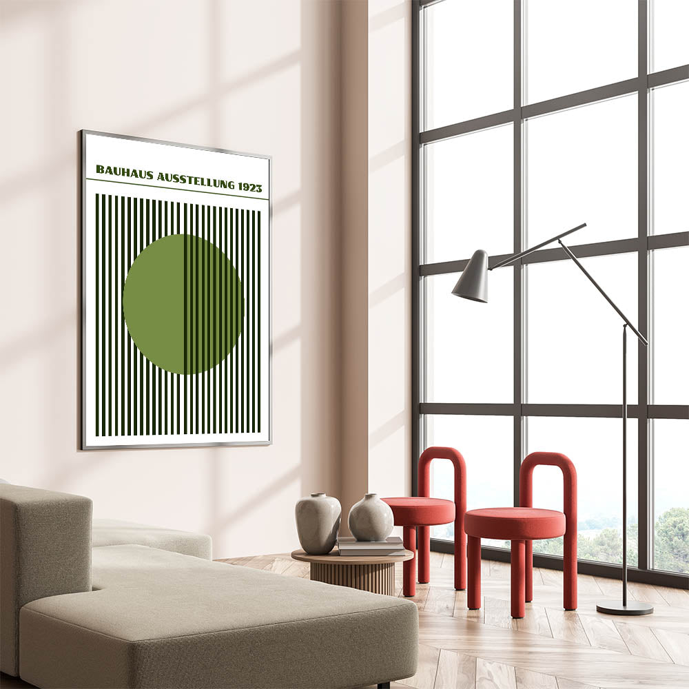Add a bold and contemporary twist to your décor with this unique bohemian artwork for modern spaces, inspired by the Bauhaus exhibition of 1923. This geometric design features a green circle intersected by bold black vertical lines, creating a striking contrast and adding depth to the composition. Perfect for anyone looking to enhance their space with a vibrant bohemian print, this design fits seamlessly into both modern and eclectic interiors, making it ideal for living rooms, bedrooms, or offices.