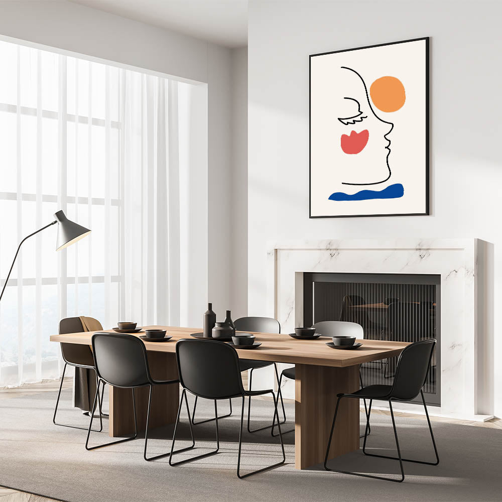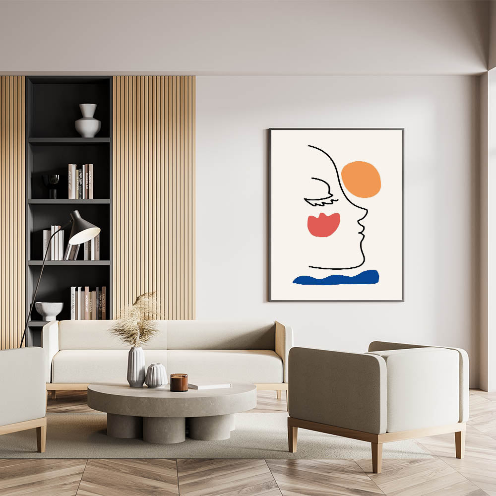 Infuse your space with a touch of artistic elegance through this bohemian line art piece featuring an abstract face design. This boho decor canvas blends simplicity with vibrant pops of color, including soft orange, red, and blue shapes, creating a modern and eclectic composition. Perfect for adding personality to any space, this minimalist artwork brings a calming and chic vibe, ideal for any room with a boho-chic or contemporary decor theme.