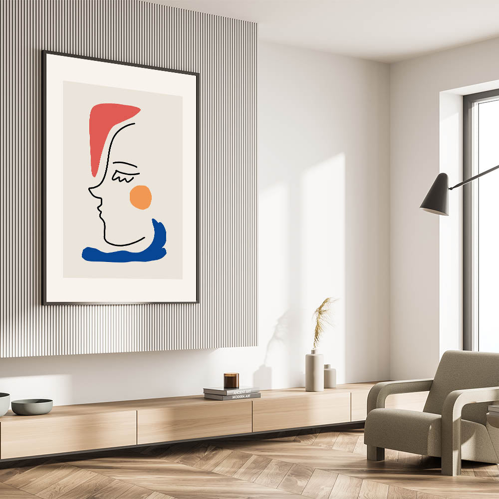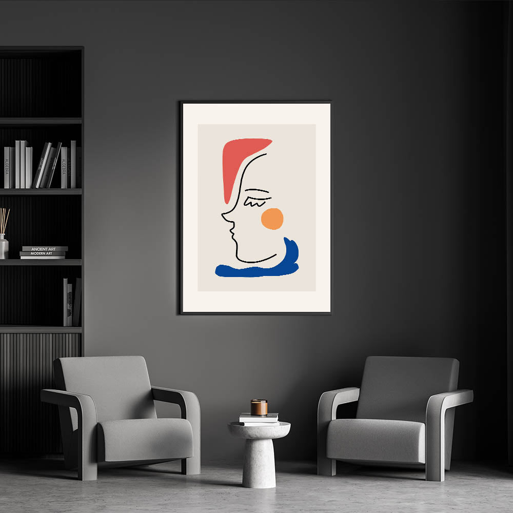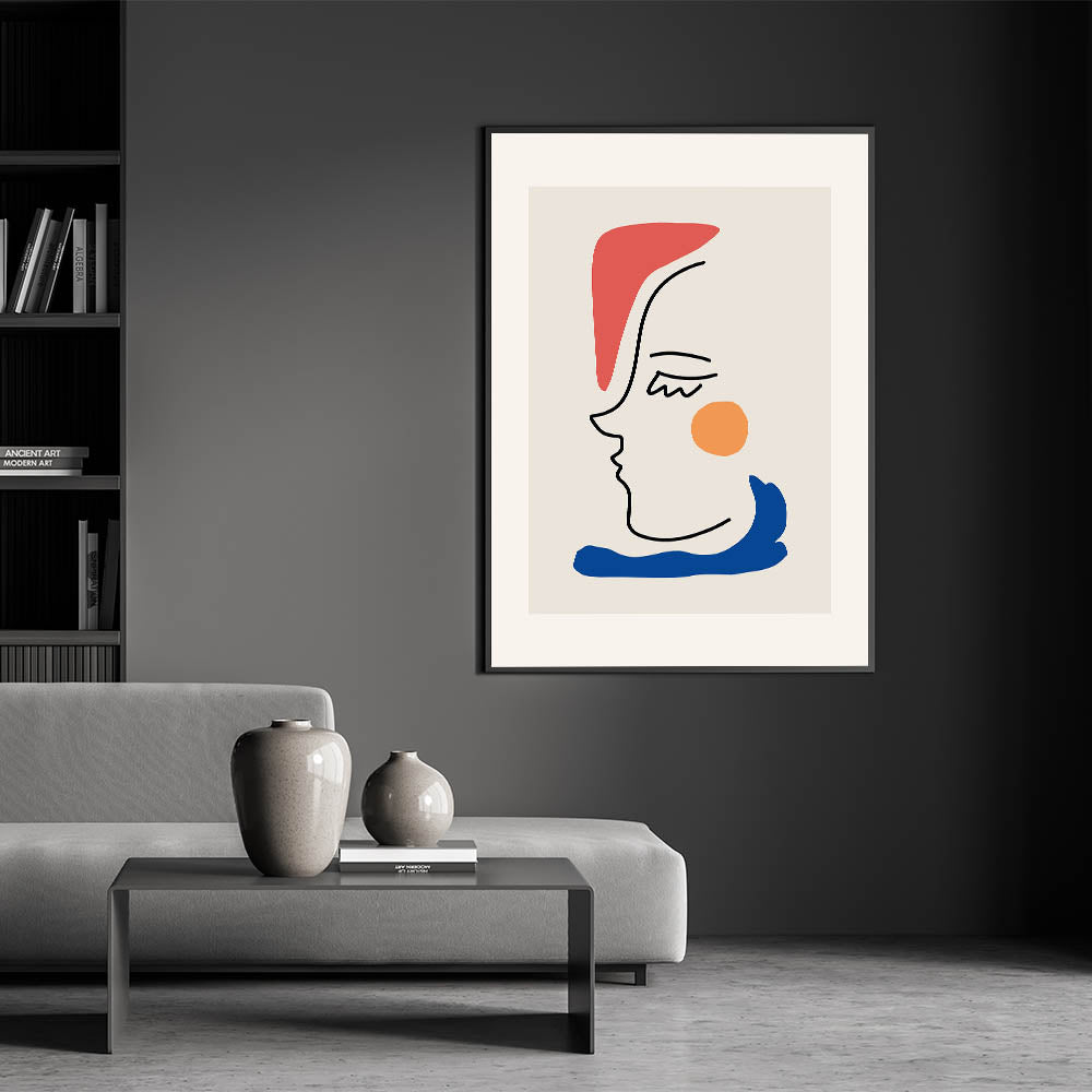 This bohemian line art piece beautifully blends abstract minimalism with vibrant color accents. Featuring a sleek black line drawing of a face, combined with bold pops of red, orange, and blue, this boho decor canvas is perfect for creating a modern, eclectic look in your home. Its simplicity and charm make it a versatile piece that complements any room with a boho-chic or contemporary style.