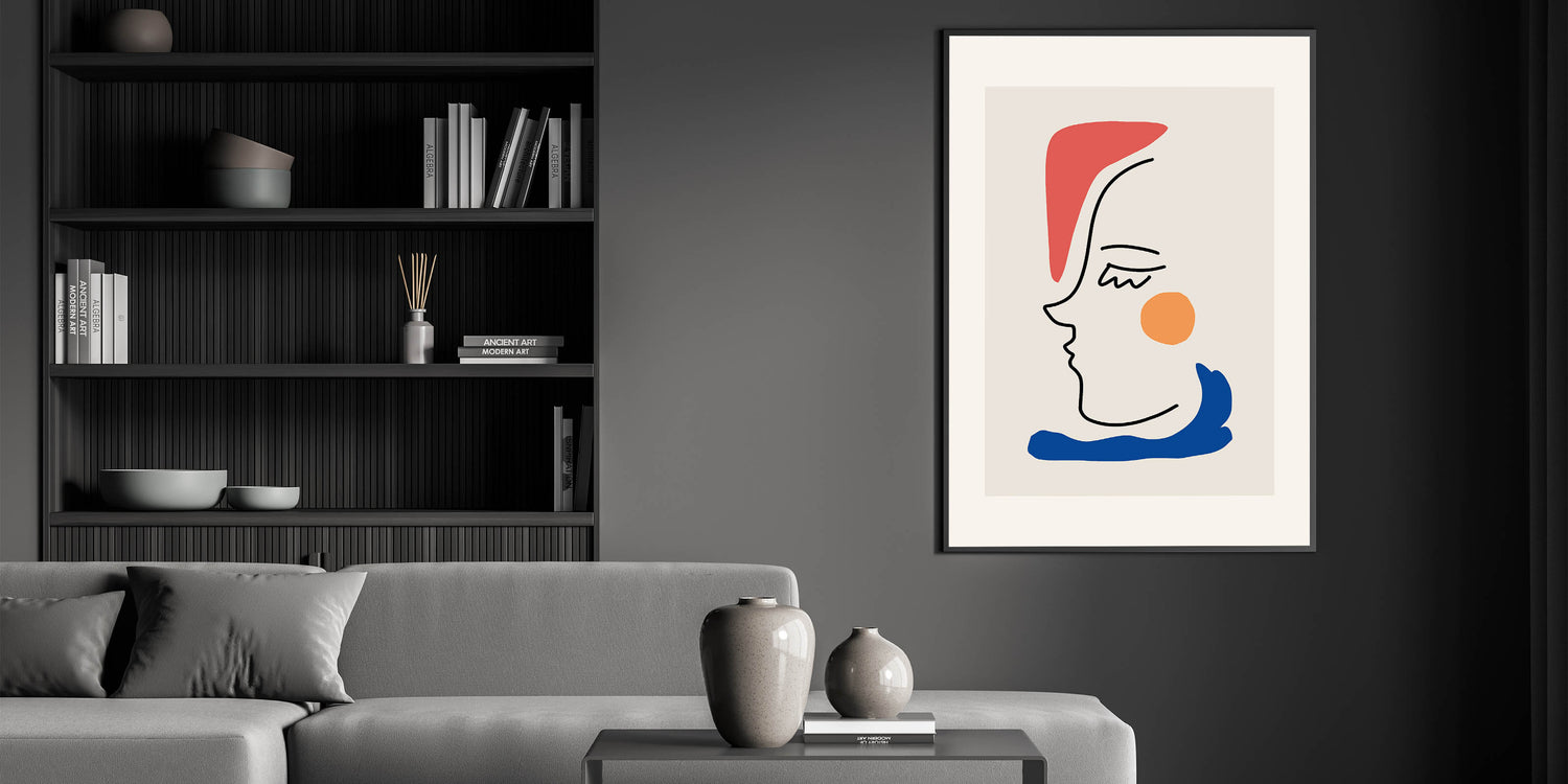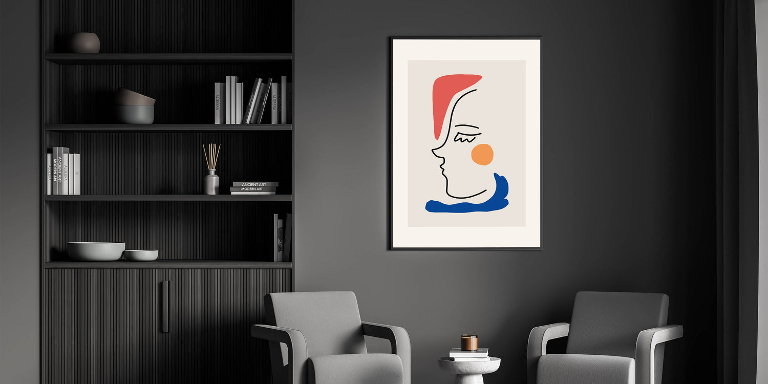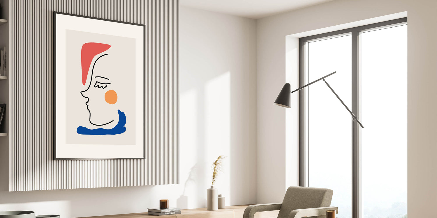 This bohemian line art piece beautifully blends abstract minimalism with vibrant color accents. Featuring a sleek black line drawing of a face, combined with bold pops of red, orange, and blue, this boho decor canvas is perfect for creating a modern, eclectic look in your home. Its simplicity and charm make it a versatile piece that complements any room with a boho-chic or contemporary style.