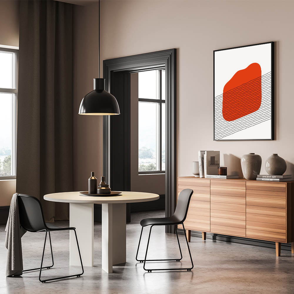 Bring modern flair to your space with this striking Bohemian wall art. The bold red shape, paired with fluid black lines, creates an intriguing minimalist design that is perfect for contemporary and eclectic interiors. The simple yet dynamic composition adds depth and movement, making this art print ideal for living rooms, bedrooms, or offices that need a touch of modern boho style. The abstract design ensures that it can be a focal point or a complementary piece to any room’s decor.