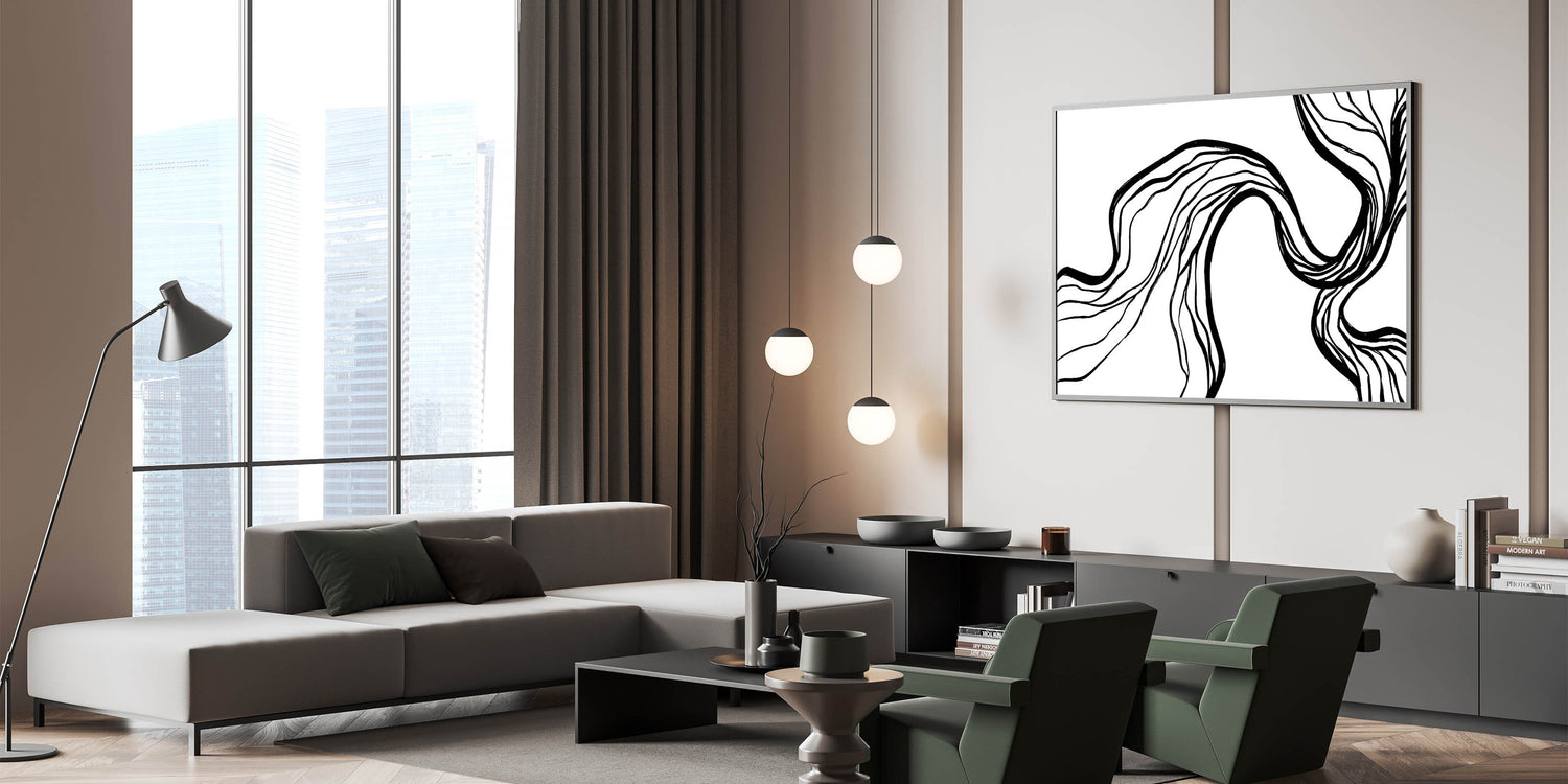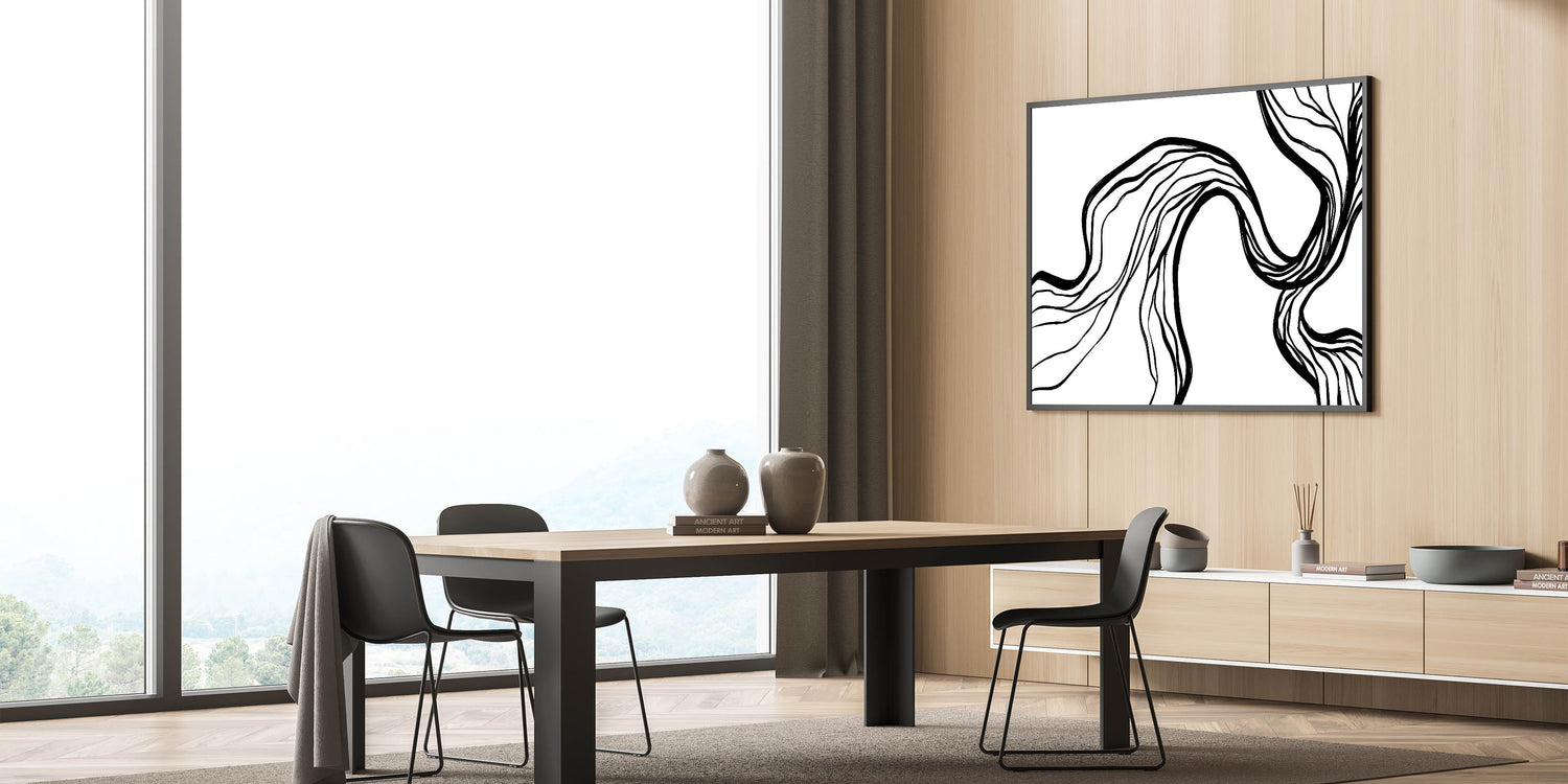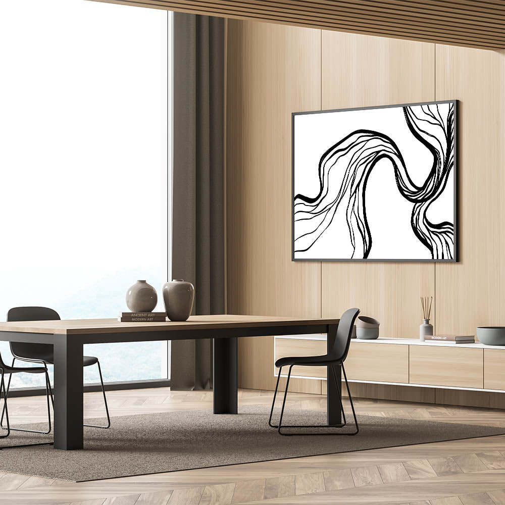 Introduce a captivating touch to your modern space with this unique Bohemian artwork. Featuring flowing, abstract black lines on a pristine white background, this piece exudes an elegant, minimalist charm. Perfect for those who appreciate eclectic designs, this vibrant bohemian print enhances any room with its artistic simplicity. Whether you’re styling your living room or creating a chic gallery wall, this handcrafted bohemian-style canvas print offers versatile appeal for a variety of interior styles.
