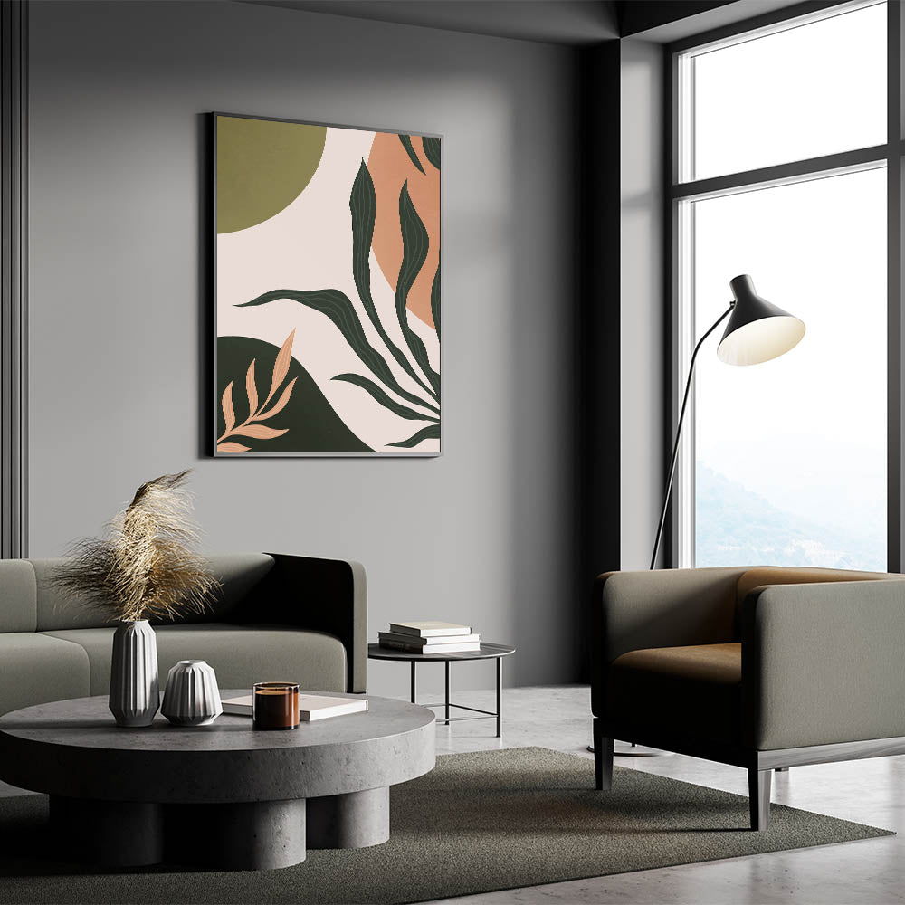 Add a unique touch of artistic elegance to your home with this captivating Bohemian wall art. Featuring an abstract plant design in soft beige and deep forest green, this piece embodies the boho chic aesthetic, perfect for modern and eclectic spaces. The rich natural tones and the fluid design of leaves create a serene and calming atmosphere in any room.