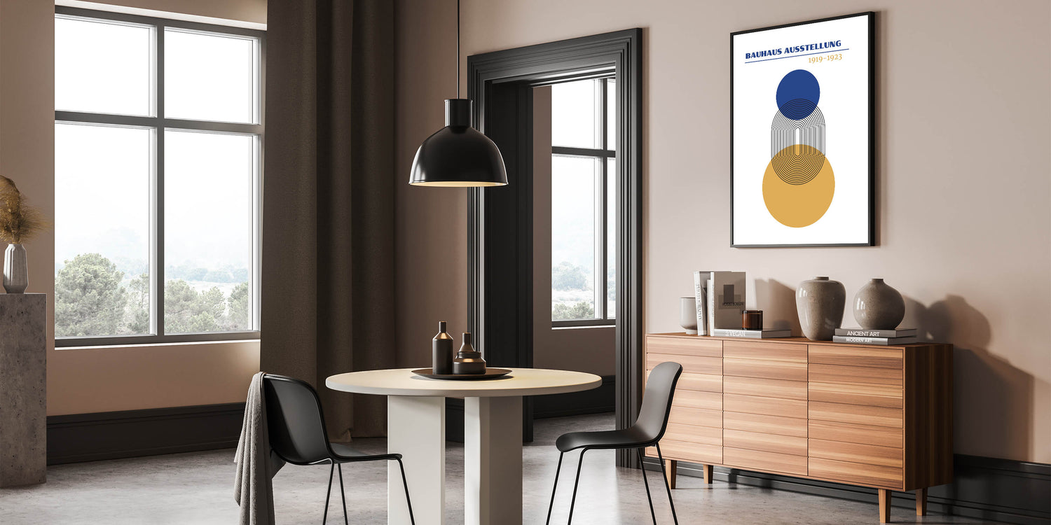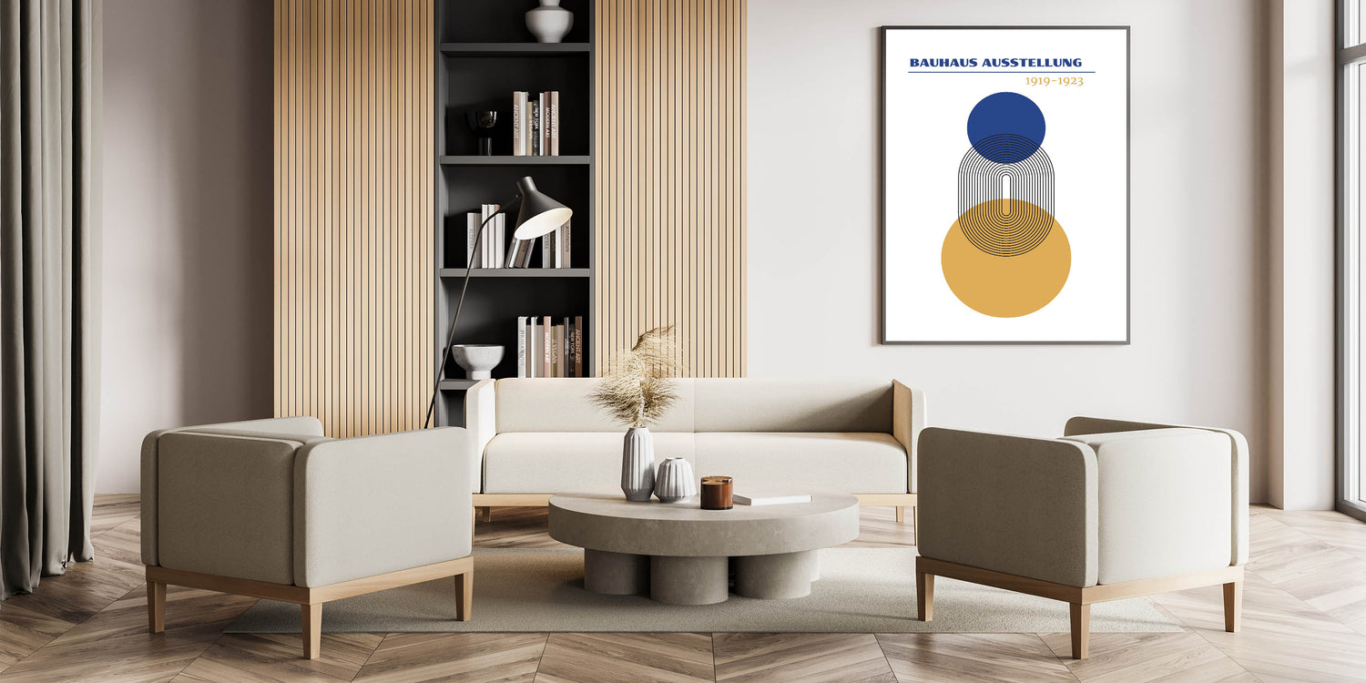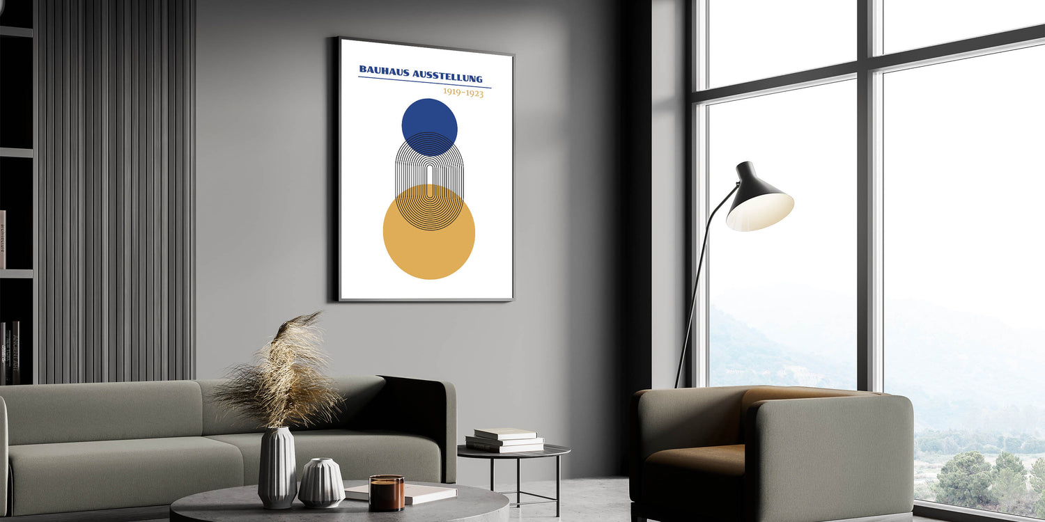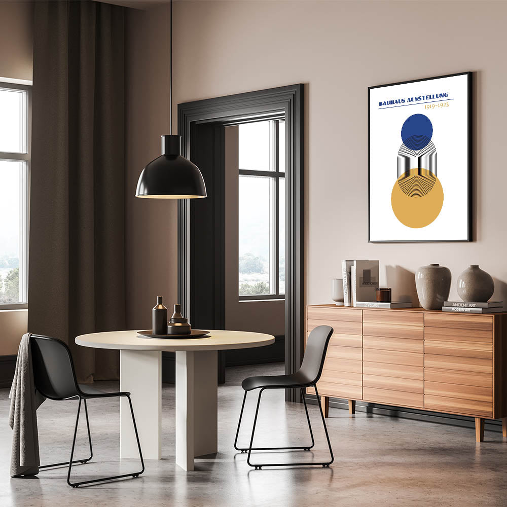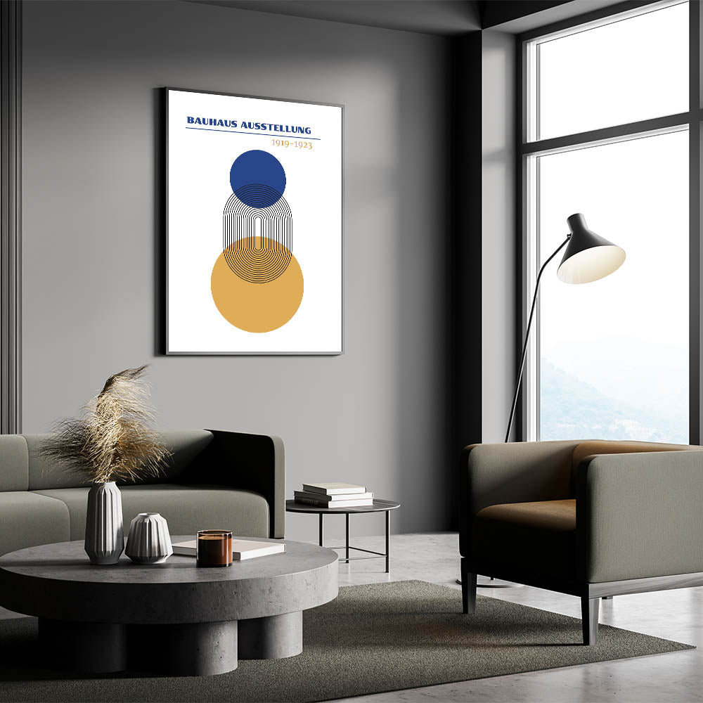 Embrace the essence of Bauhaus design with this unique Bohemian artwork for modern spaces. This stunning print from the Bauhaus Ausstellung 1919-1923 features a captivating arrangement of concentric black lines forming an arch between bold navy blue and gold circles. The contrast between the structured linear patterns and bold shapes makes this vibrant Bohemian print for home decor a perfect centerpiece for any room.