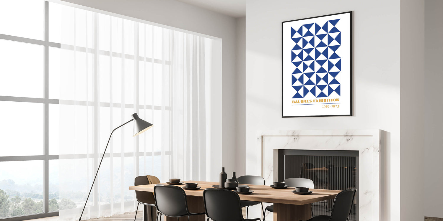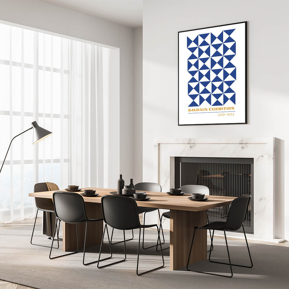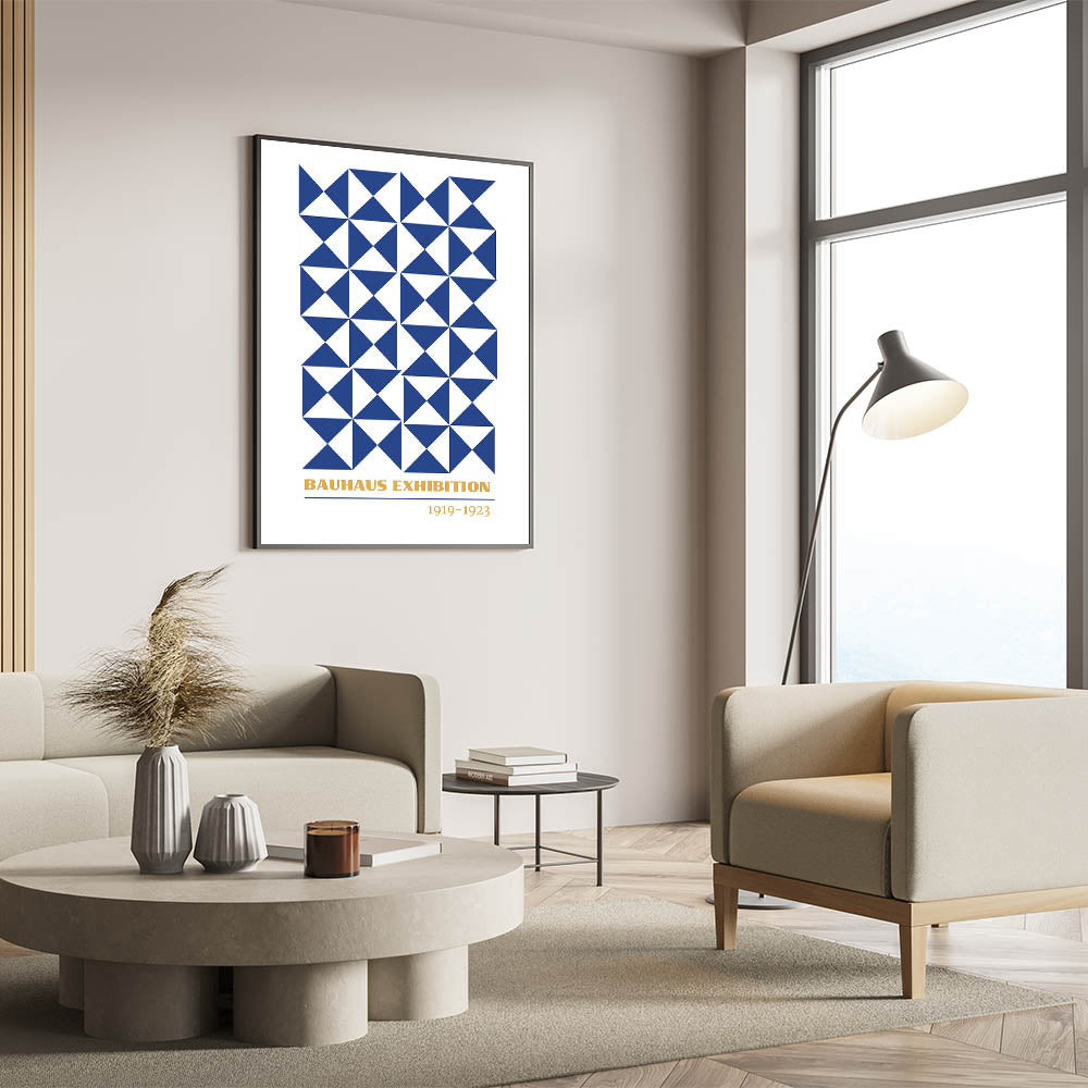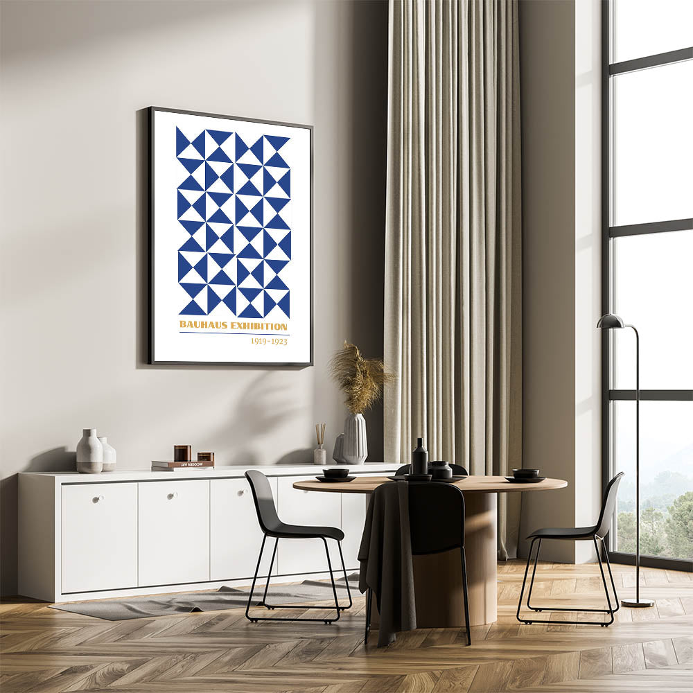 Celebrate the Bauhaus Exhibition 1919-1923 with this striking unique Bohemian artwork for modern spaces. This print features a repetitive geometric pattern of navy blue and white triangles arranged in perfect symmetry, creating a bold and structured design. This vibrant Bohemian print for home decor is ideal for adding a modern, artistic touch to any room, making it a timeless and elegant statement piece.