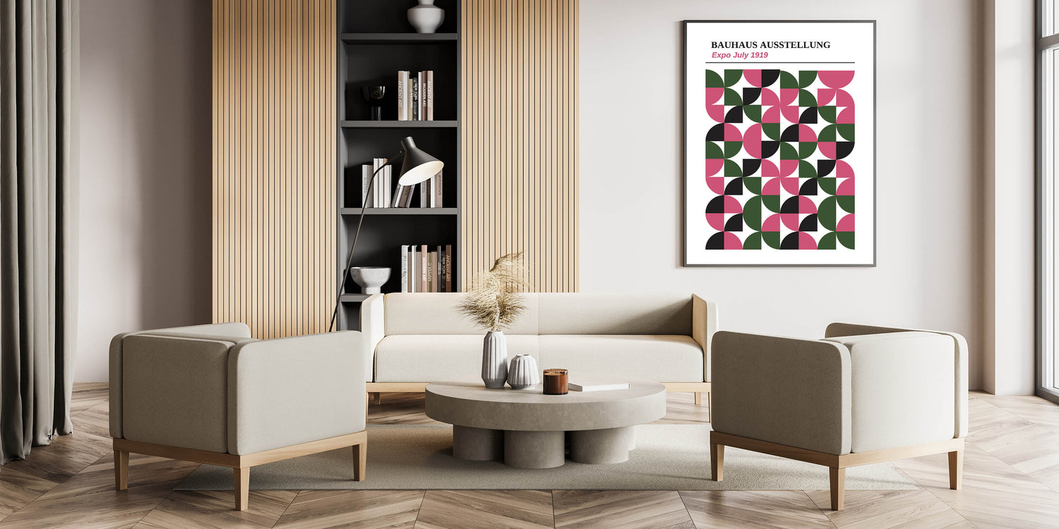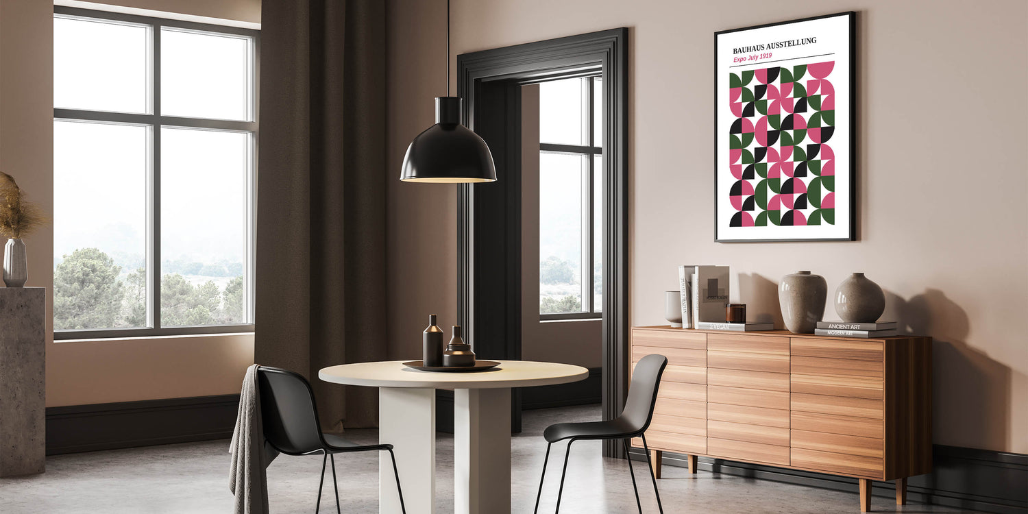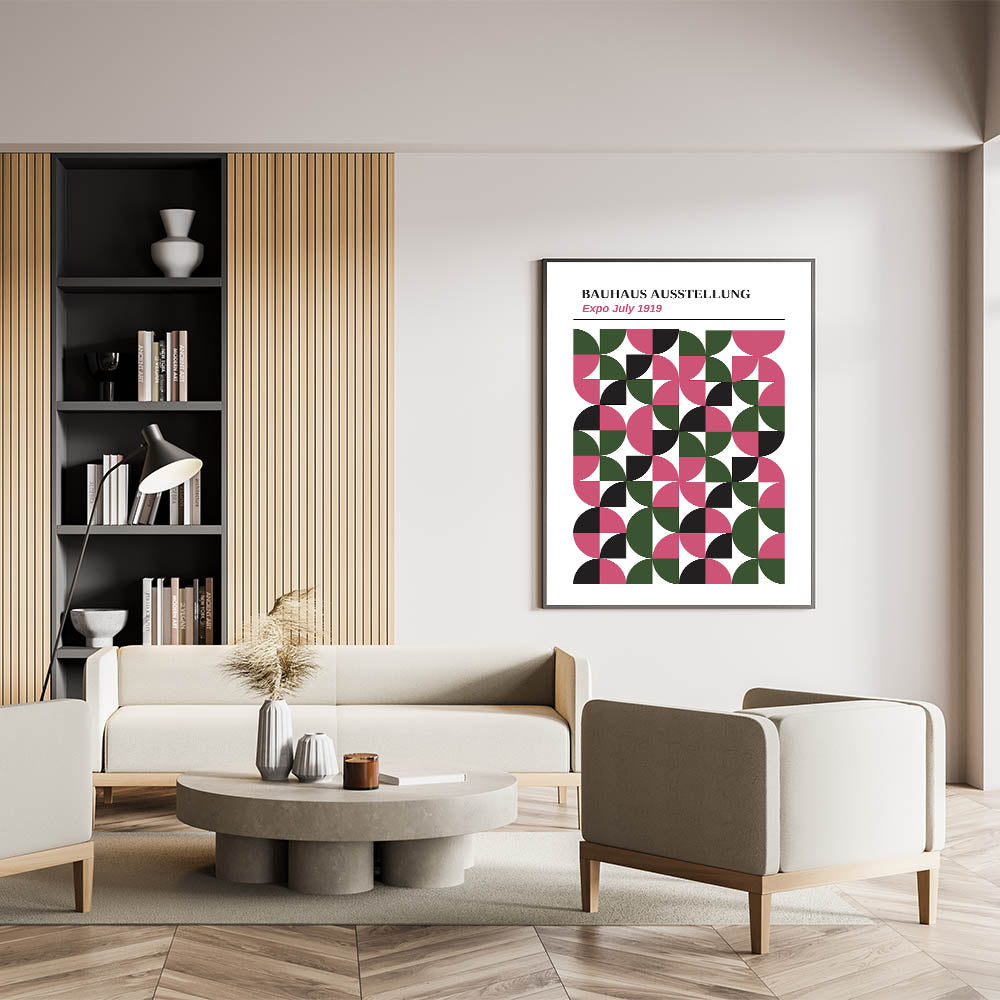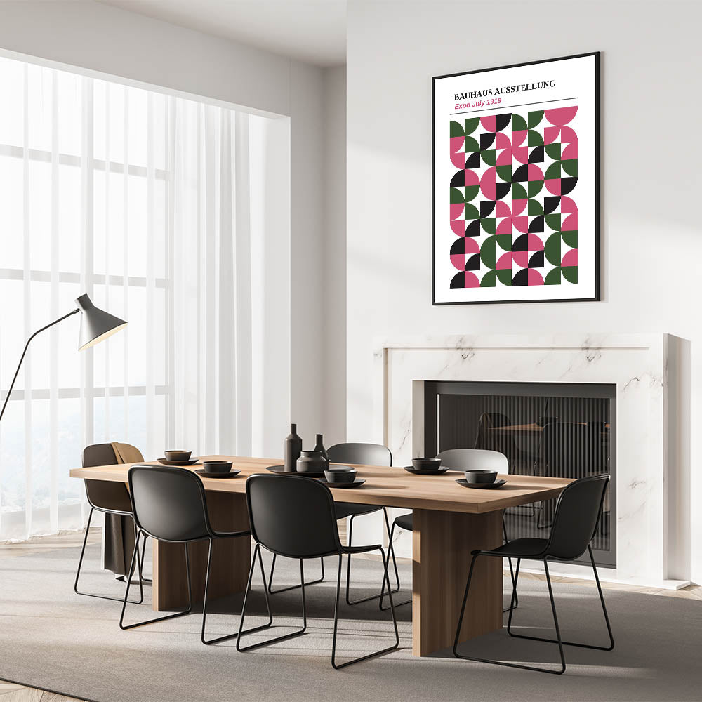 Bring a bold and vibrant touch to your home with this unique Bohemian artwork for modern spaces. Inspired by the Bauhaus Ausstellung Expo July 1919, this geometric design features striking shapes in an eclectic mix of pink, green, black, and white. The carefully arranged circles and triangles create a dynamic visual effect, making this vibrant Bohemian print for home decor the perfect accent for any space looking for a creative and colorful design.