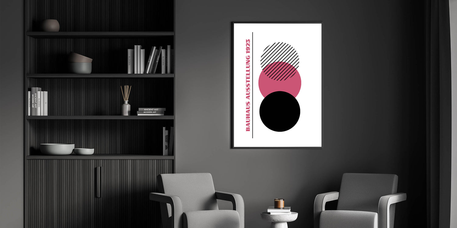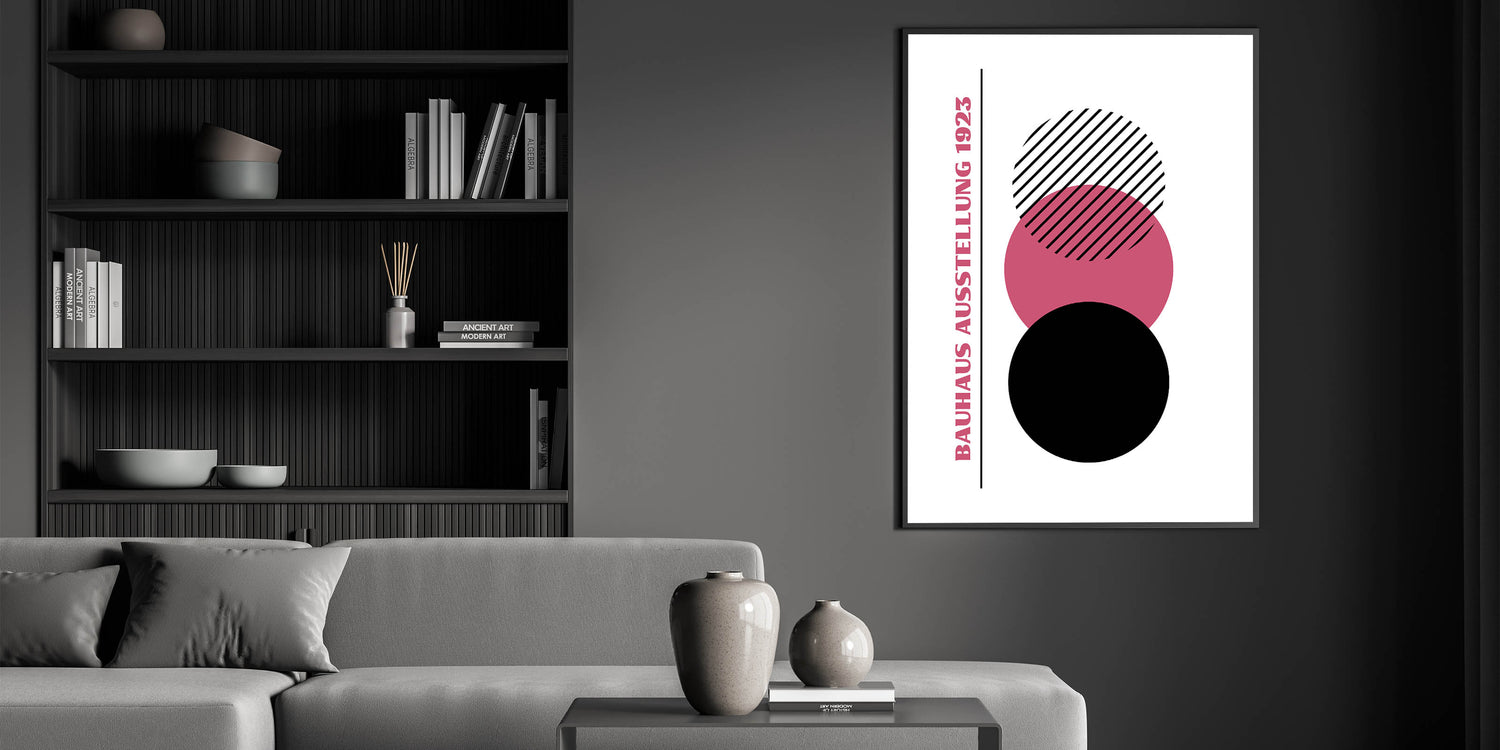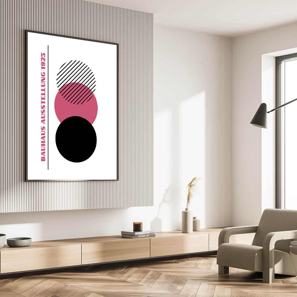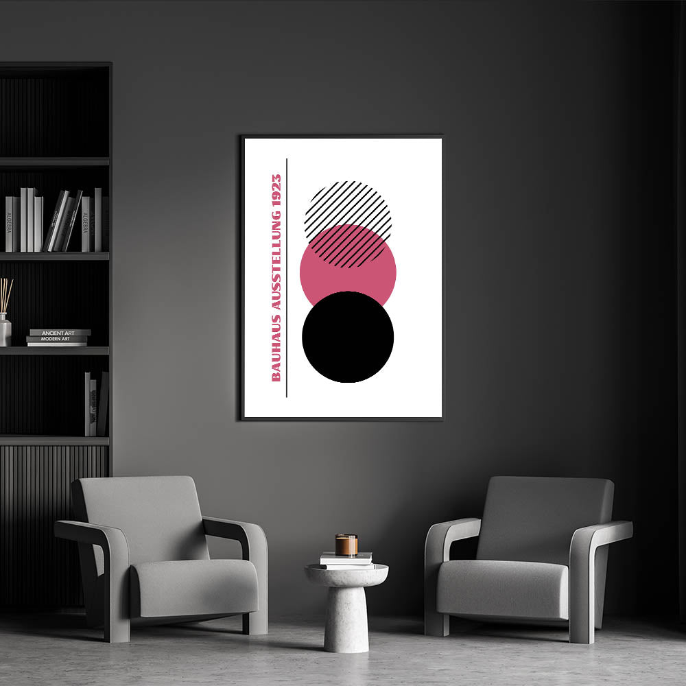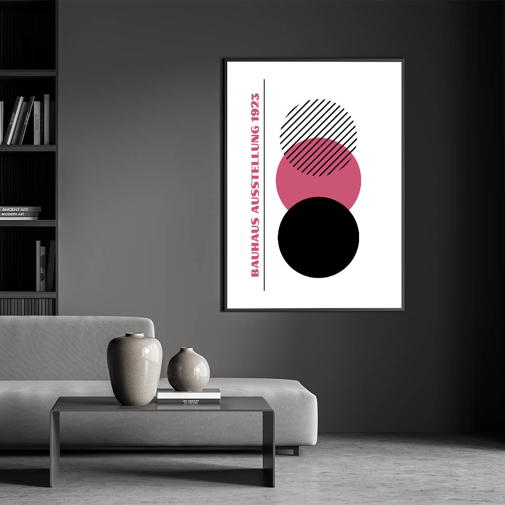 Introduce a bold and minimalist design to your home with this unique Bohemian artwork for modern spaces. Inspired by the Bauhaus Ausstellung 1923, this print features a sleek arrangement of black, pink, and lined geometric circles. The striking contrast between the black and pink shapes adds a touch of modern sophistication to any room, making this vibrant Bohemian print for home decor the perfect statement piece.