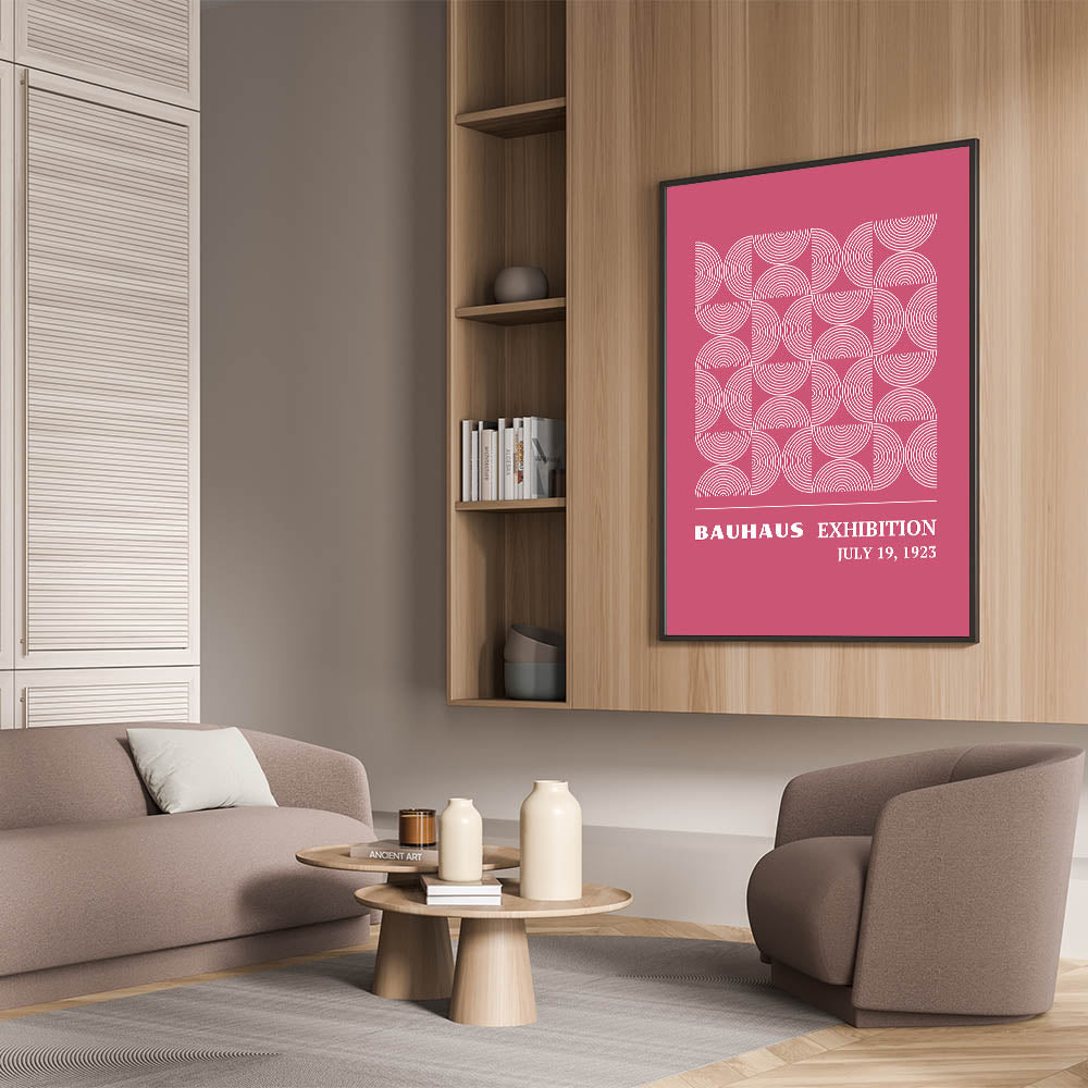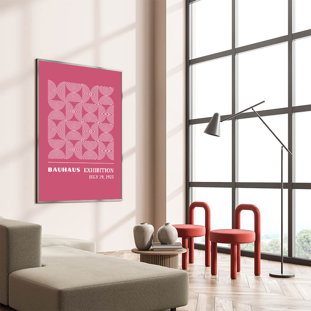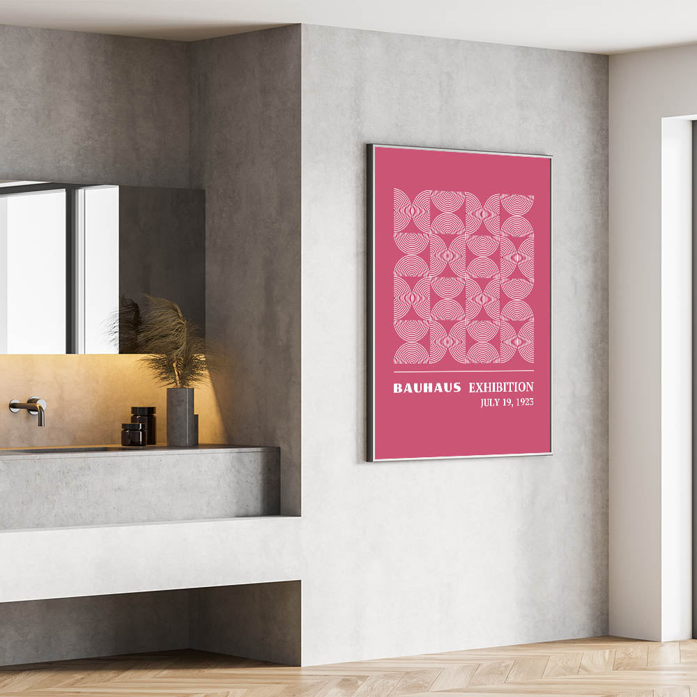 Add a vibrant and modern touch to your home with this unique Bohemian artwork for modern spaces. Inspired by the Bauhaus Exhibition of July 1923, this design features a captivating circular pattern in a stunning pink backdrop, creating a harmonious blend of geometric symmetry and bold color. This vibrant Bohemian print for home decor is perfect for any room, adding a touch of elegance and creativity to your interior.