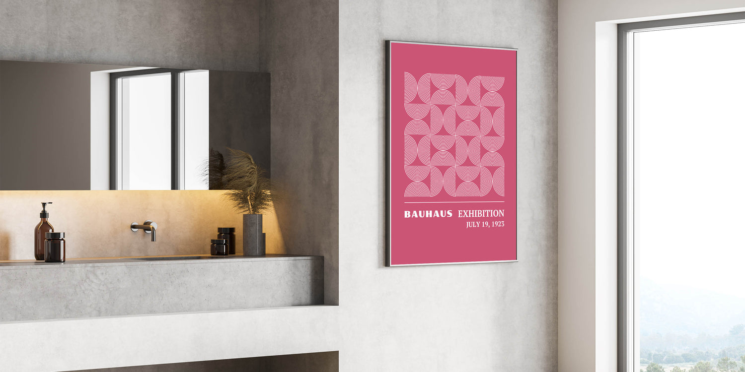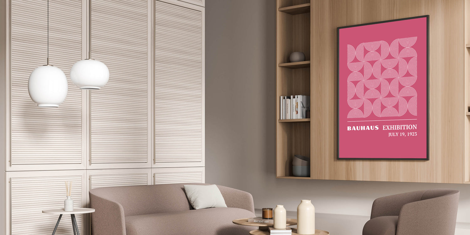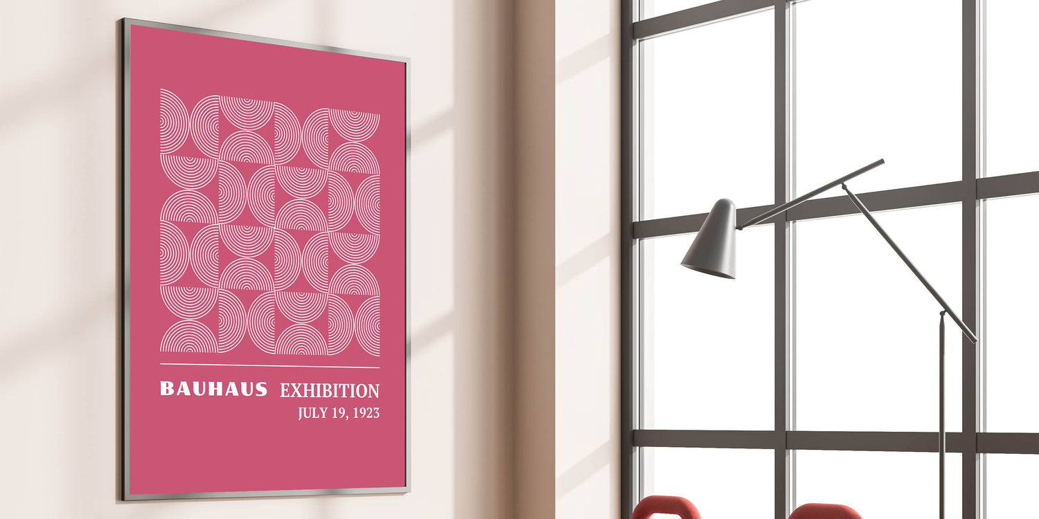 Add a vibrant and modern touch to your home with this unique Bohemian artwork for modern spaces. Inspired by the Bauhaus Exhibition of July 1923, this design features a captivating circular pattern in a stunning pink backdrop, creating a harmonious blend of geometric symmetry and bold color. This vibrant Bohemian print for home decor is perfect for any room, adding a touch of elegance and creativity to your interior.