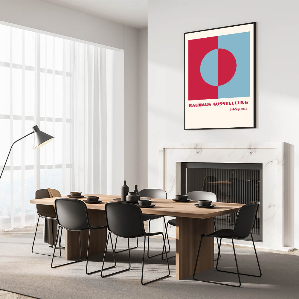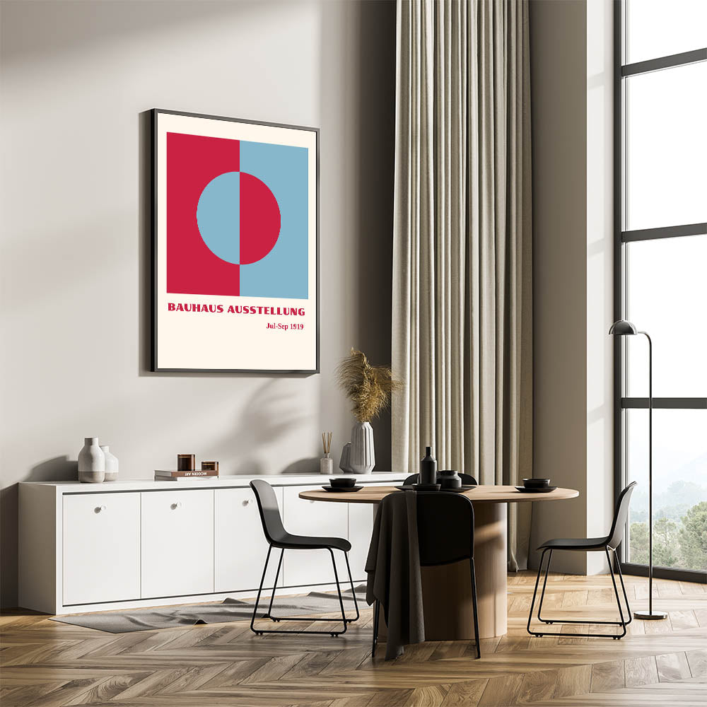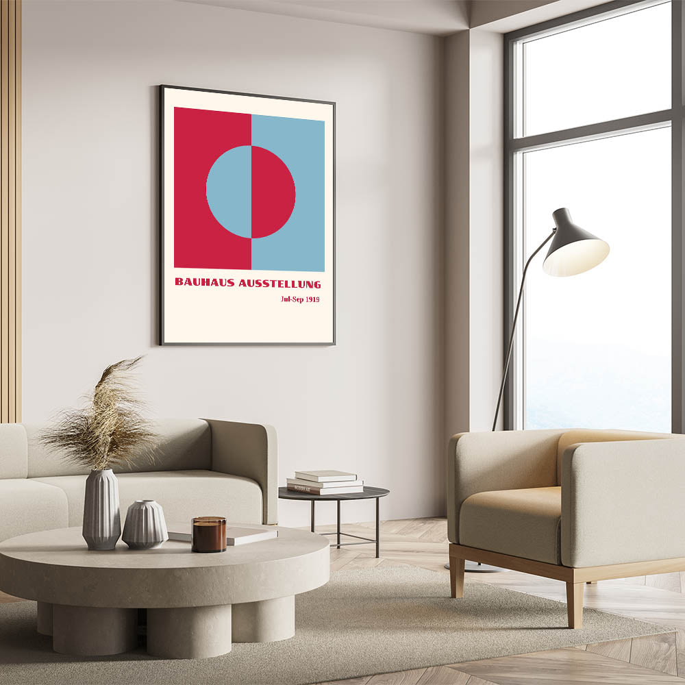 Add a sophisticated touch to your home with this bohemian wall art, inspired by the iconic Bauhaus Ausstellung of 1919. Featuring a bold geometric design in red and light blue, this eclectic boho wall art piece is the perfect blend of modern and historical design. Whether you're looking to bring a splash of color to your living room, bedroom, or workspace, this artistic bohemian-style canvas print will elevate your interior with its minimalist charm.