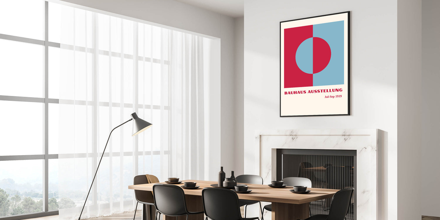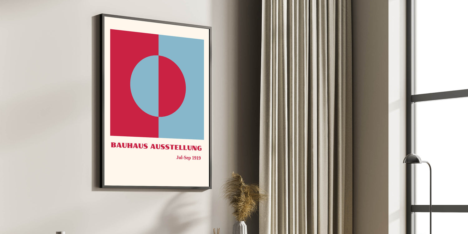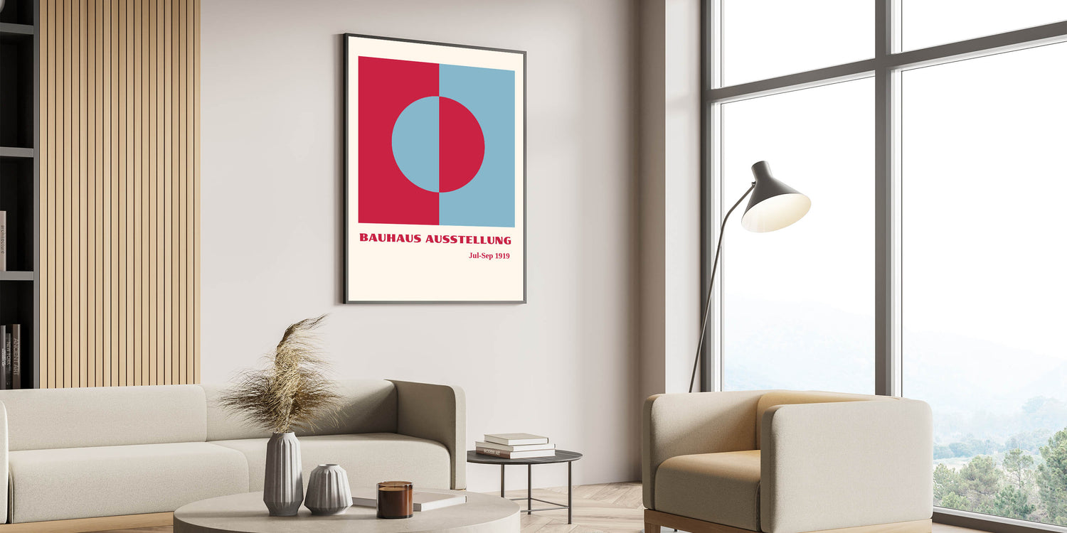 Add a sophisticated touch to your home with this bohemian wall art, inspired by the iconic Bauhaus Ausstellung of 1919. Featuring a bold geometric design in red and light blue, this eclectic boho wall art piece is the perfect blend of modern and historical design. Whether you're looking to bring a splash of color to your living room, bedroom, or workspace, this artistic bohemian-style canvas print will elevate your interior with its minimalist charm.