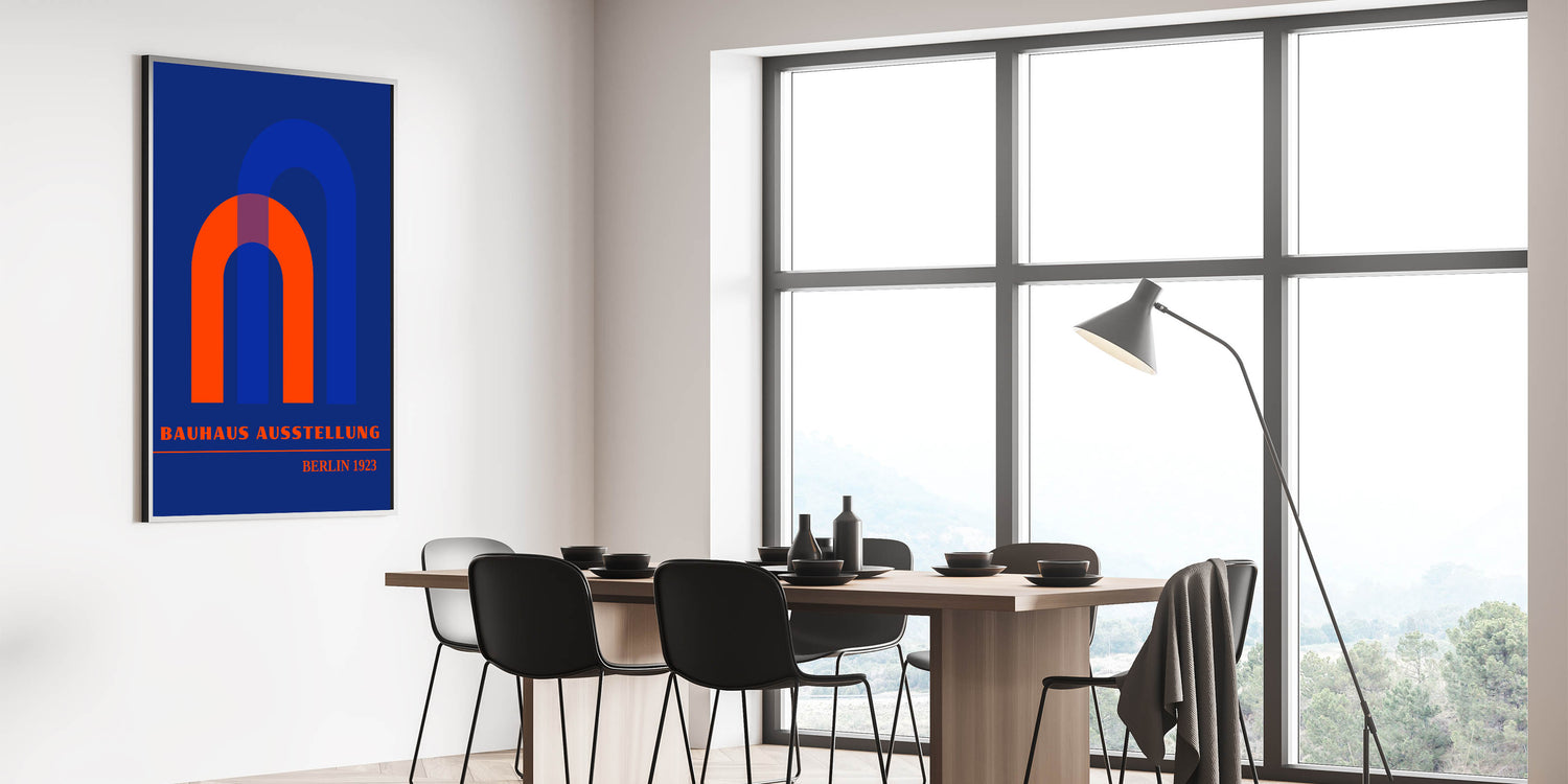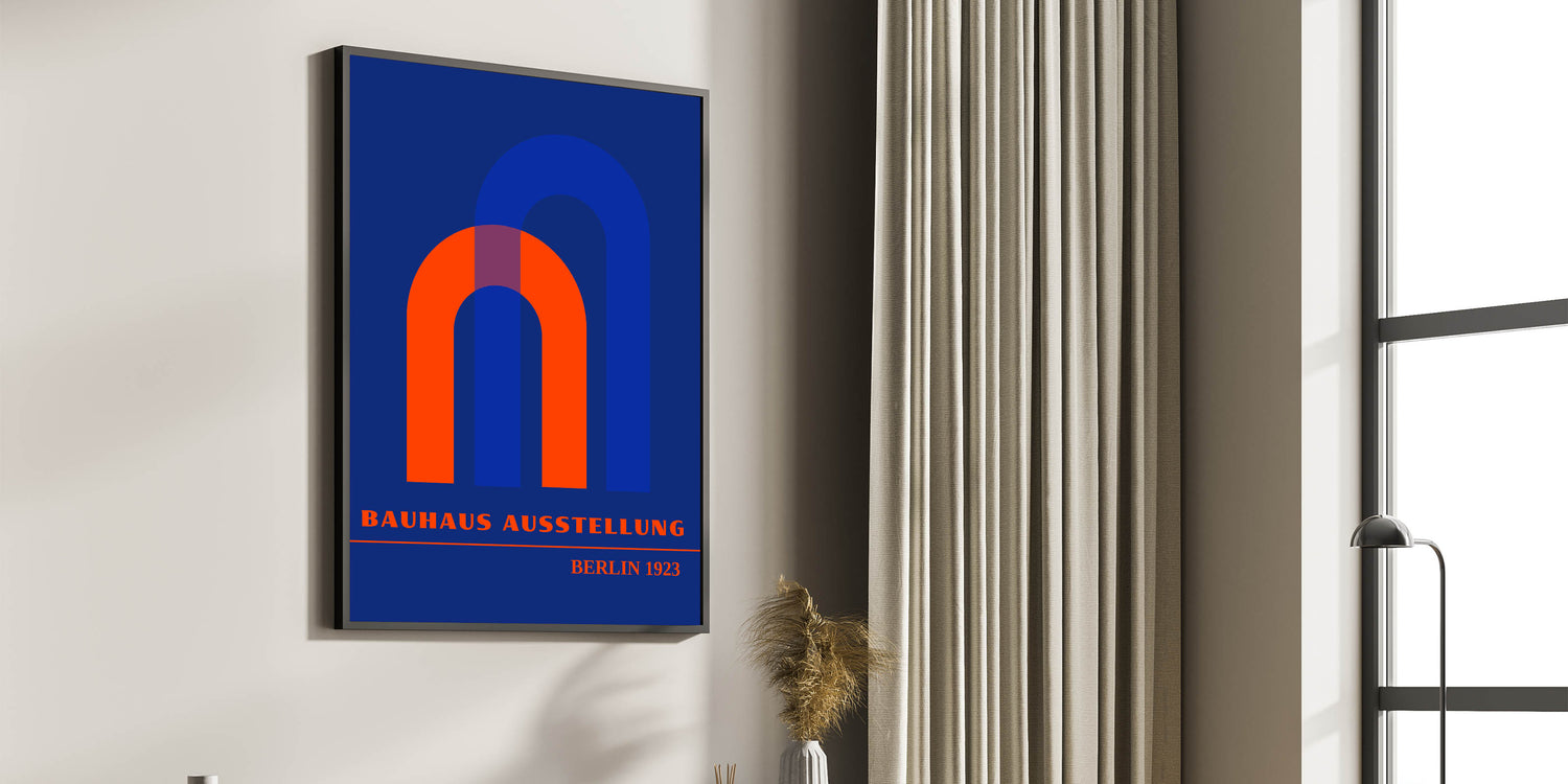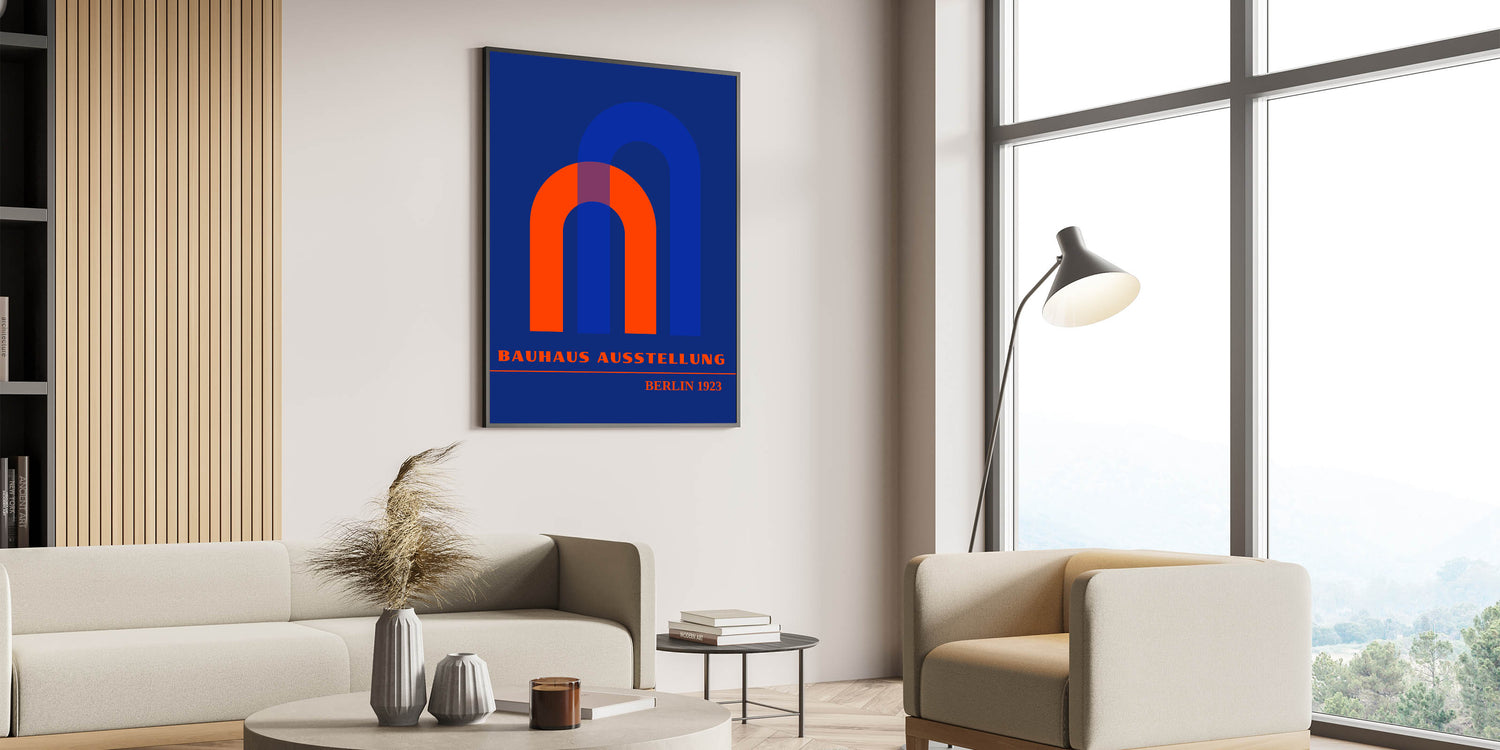 Add a bold geometric touch to your home with this bohemian wall art, featuring vibrant overlapping arch shapes inspired by the Bauhaus Ausstellung Berlin 1923. The rich orange, blue, and purple hues create a striking visual contrast against a deep blue background, making this piece perfect for modern, eclectic, or bohemian interiors. This artistic bohemian-style canvas print adds a unique element of depth and movement to any space.