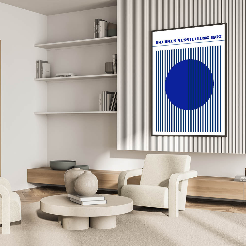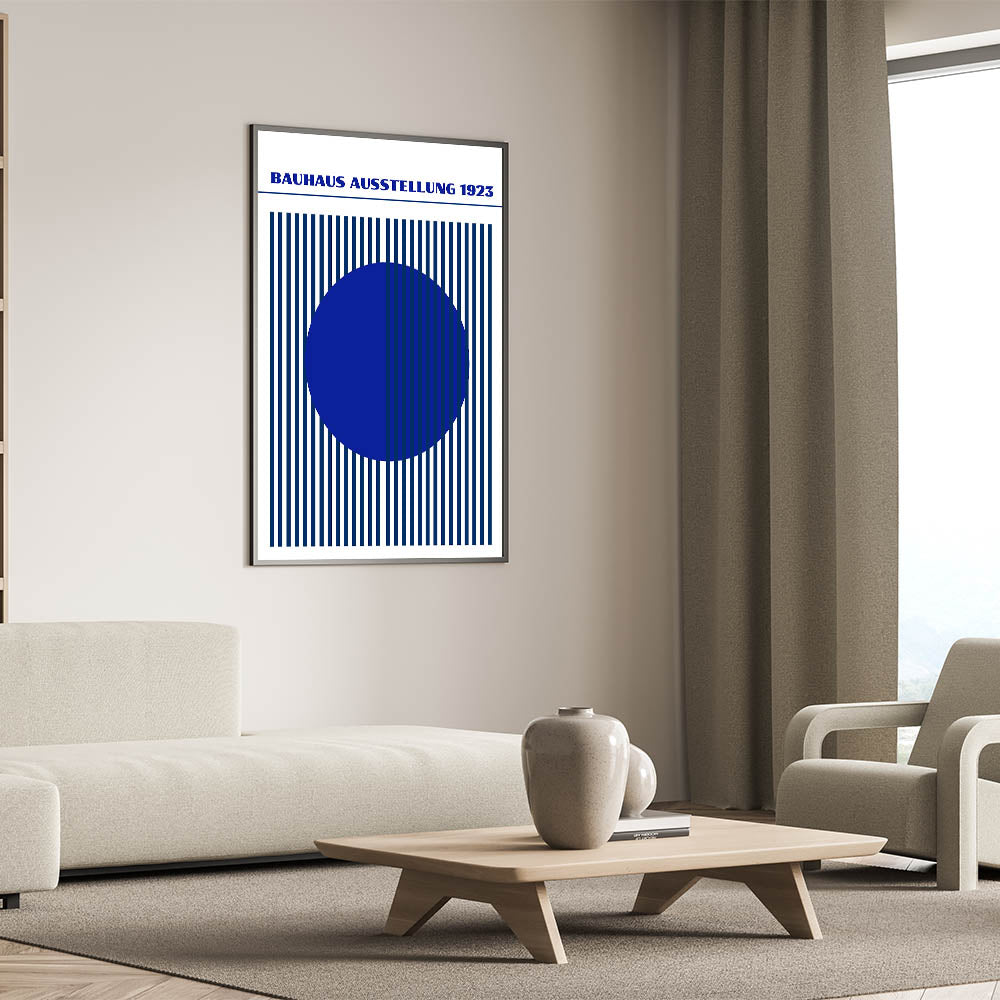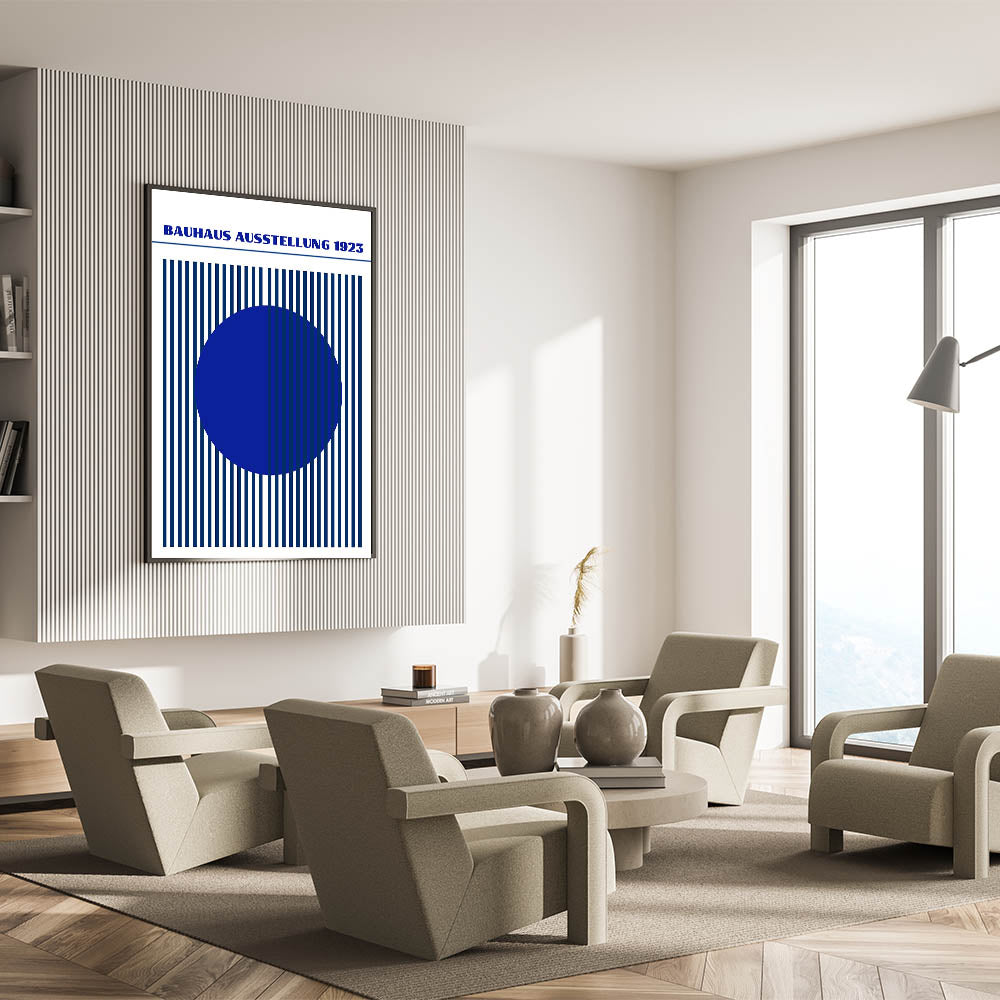 Bring a touch of modernity and structure to your home with this bohemian wall art, featuring a striking geometric design from the Bauhaus Ausstellung 1923. The bold vertical lines in white and blue, combined with a solid navy blue circle, create a sense of depth and rhythm, making this eclectic boho wall art perfect for modern and minimalist interiors. Whether displayed in your living room, bedroom, or workspace, this artistic bohemian-style canvas print will add sophistication and creativity to any room.