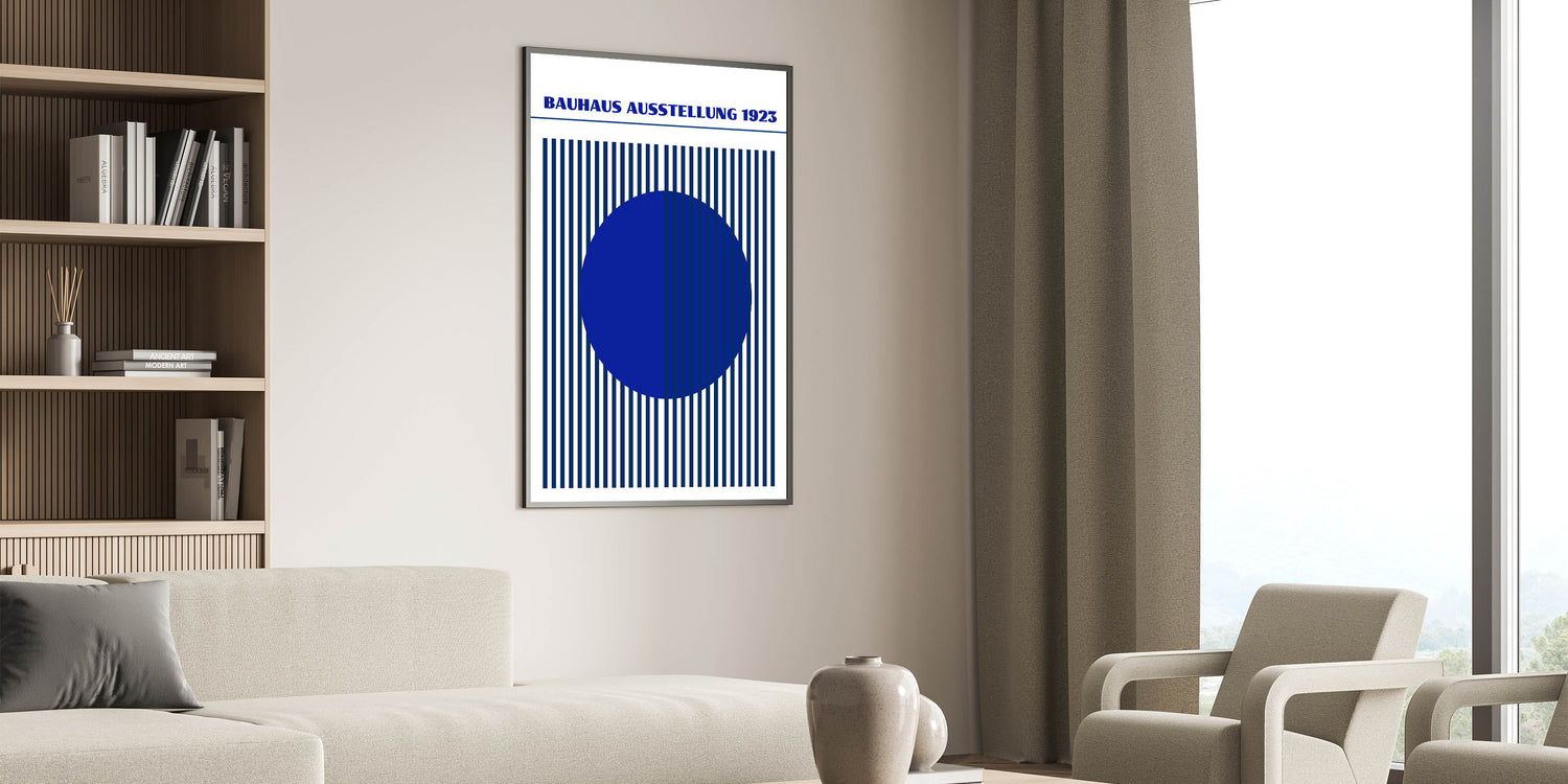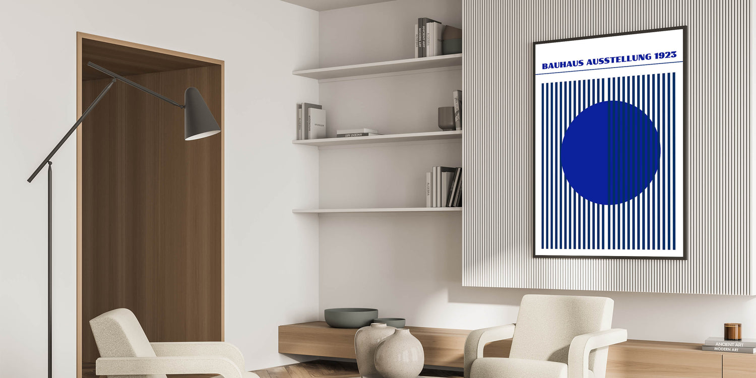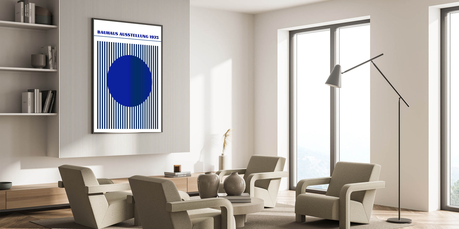 Bring a touch of modernity and structure to your home with this bohemian wall art, featuring a striking geometric design from the Bauhaus Ausstellung 1923. The bold vertical lines in white and blue, combined with a solid navy blue circle, create a sense of depth and rhythm, making this eclectic boho wall art perfect for modern and minimalist interiors. Whether displayed in your living room, bedroom, or workspace, this artistic bohemian-style canvas print will add sophistication and creativity to any room.